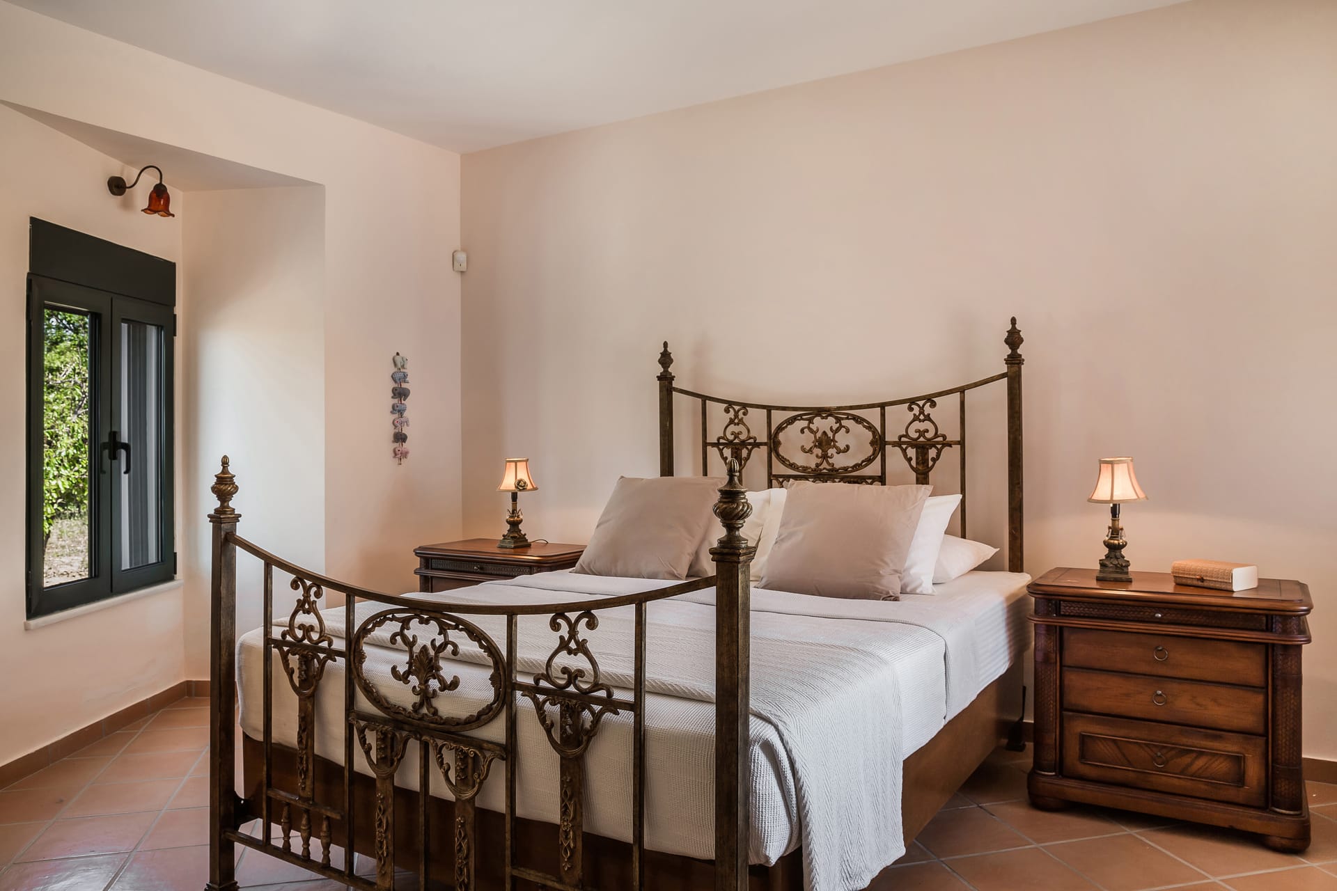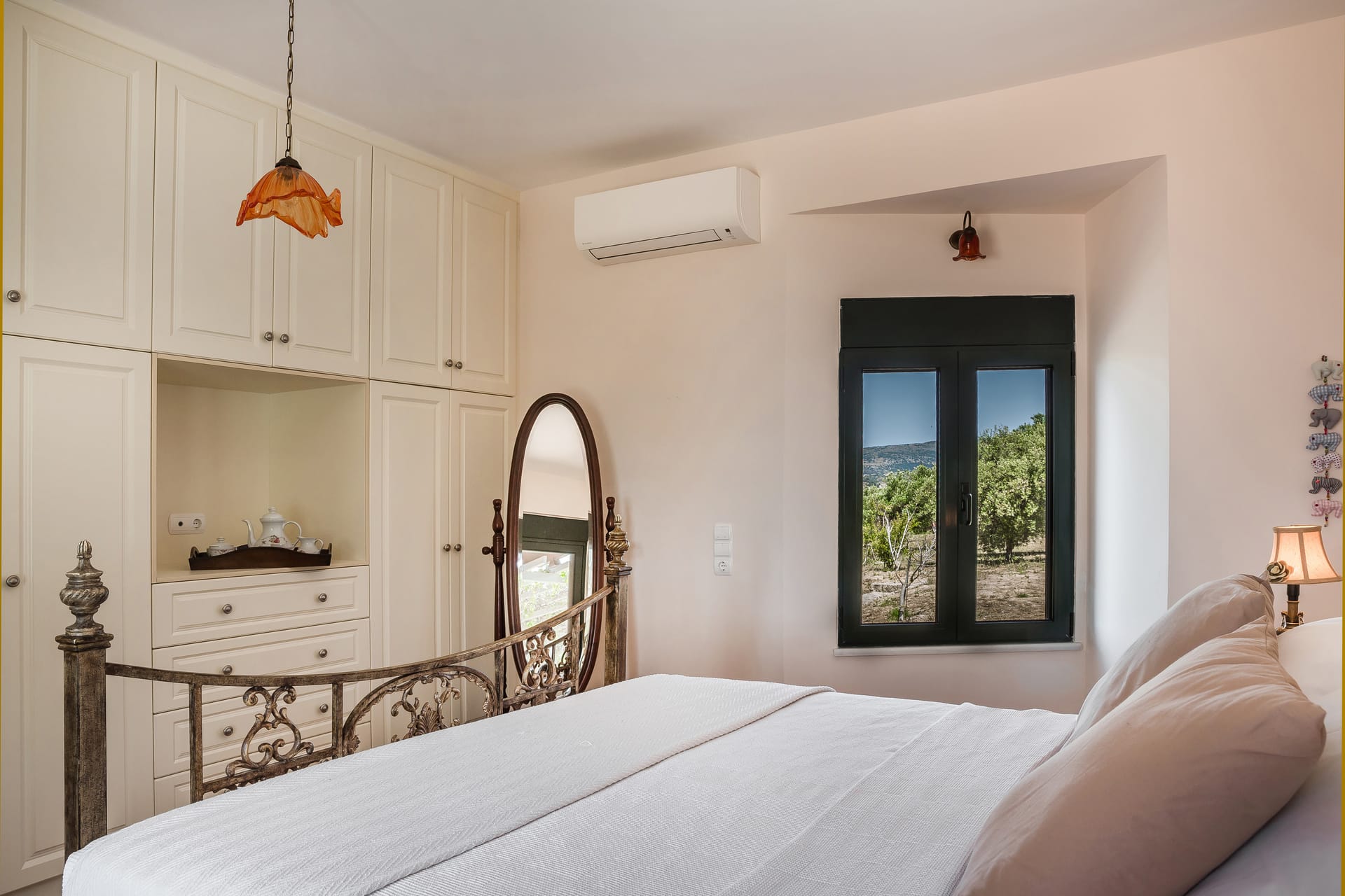 Inside the villa itself, you’ll find a comfortable living space, flooded with natural light, with simple, elegant furnishings. To the side of the living area is a well-equipped modern kitchen, also with views towards the sea. The living space has direct access to the generous terraces and the views beyond. There is a WC situated just off the living space, with the master bedroom and family shower room to the side of the property, with views towards the countryside. A laundry room, shared with the downstairs apartment, can be accessed by a secure internal staircase.