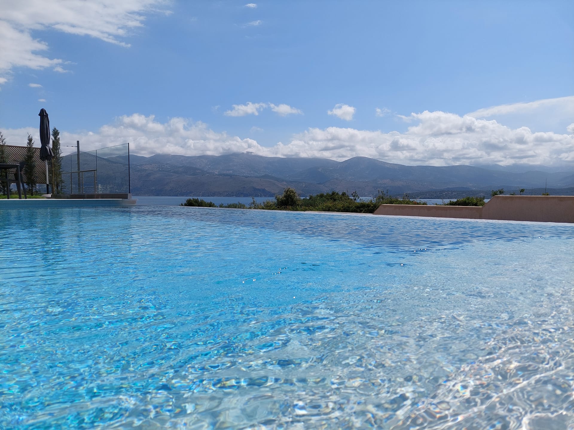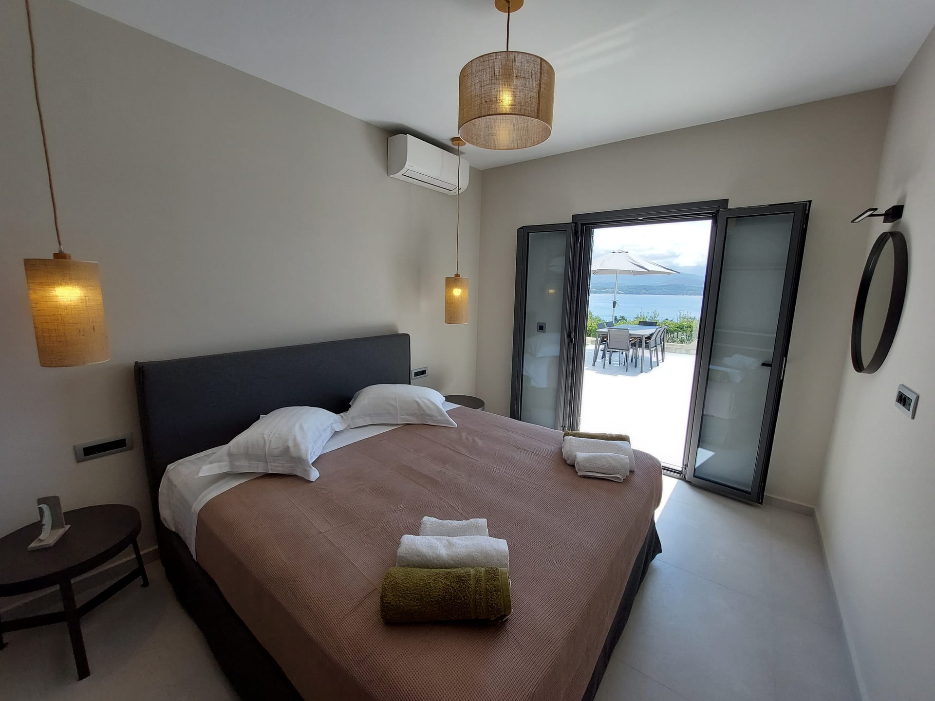 Sliding doors take you to the shady terrace and the small private pool beyond and sun loungers with umbrellas. The terrace has an outside dining area, with table and chairs seating up to 4, where you can while away the hours after a delicious meal.