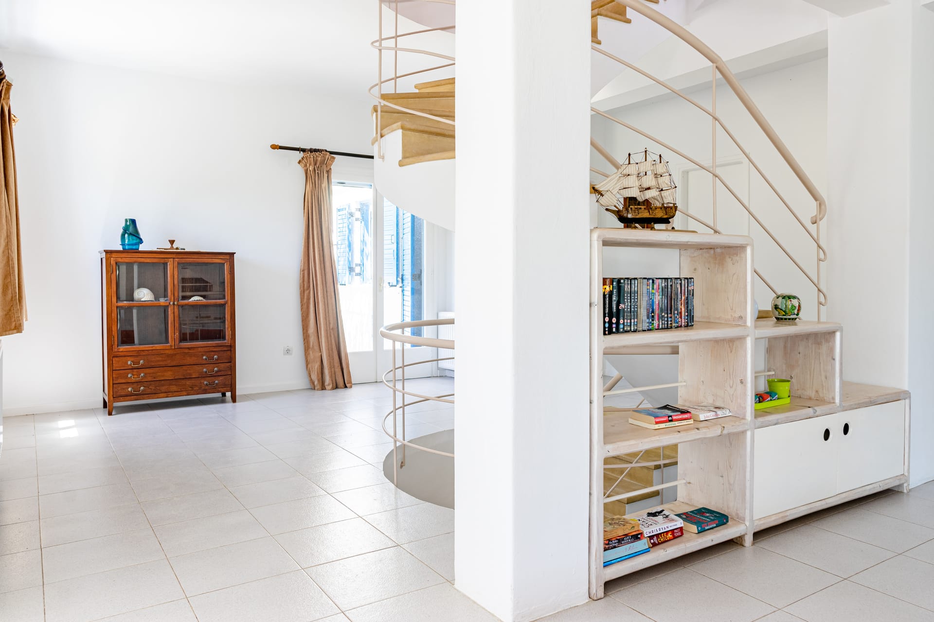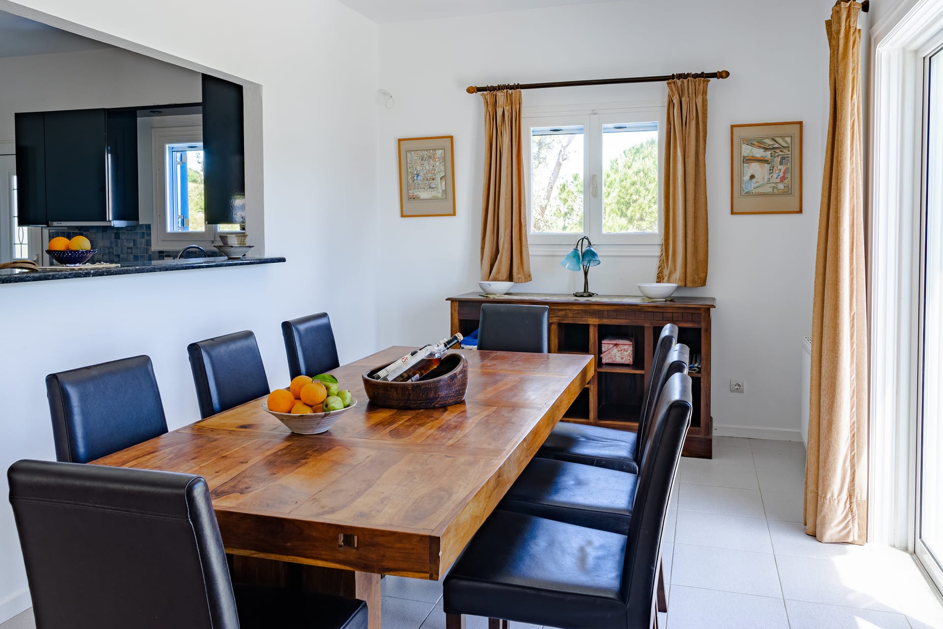 The generous hallway and open-plan living space stretches in front of you, with a large dining table, sunken seating area and French windows leading to the terraces beyond. The kitchen is tucked off to the side of this central living area, with its own door to the terrace that wraps around the back of the house. Fully equipped and furnished with everything you will need, it also has a pantry area containing the washing machine.