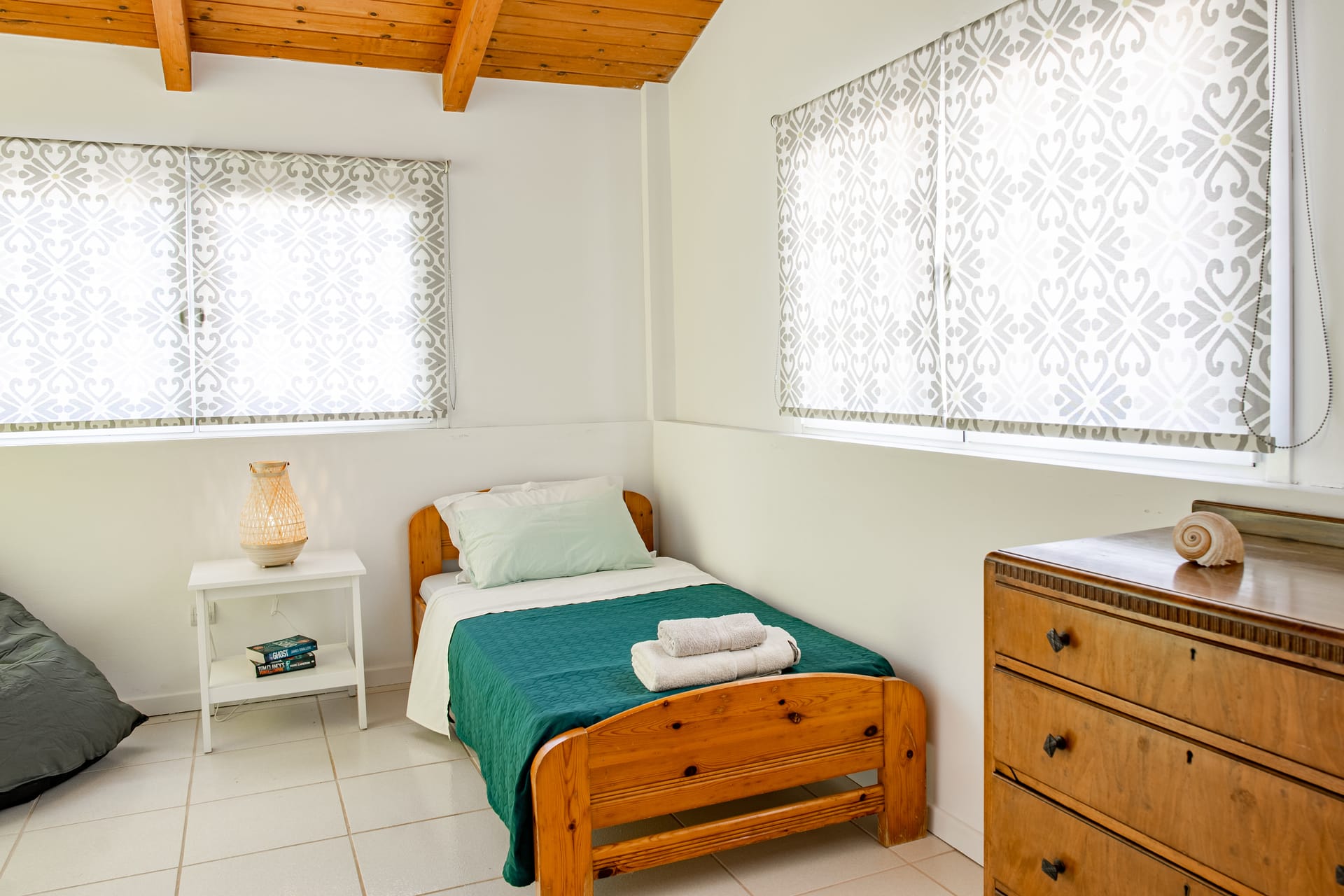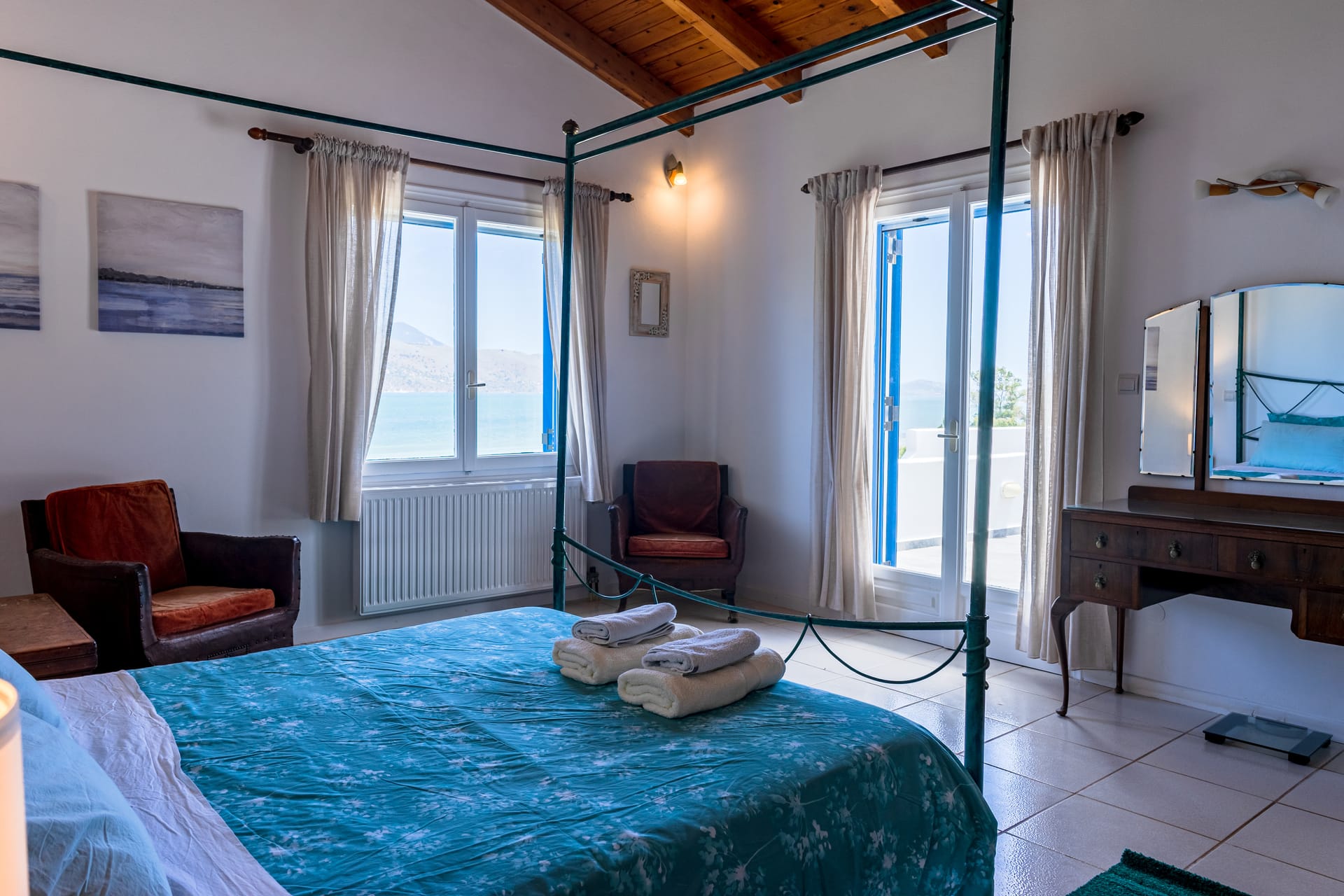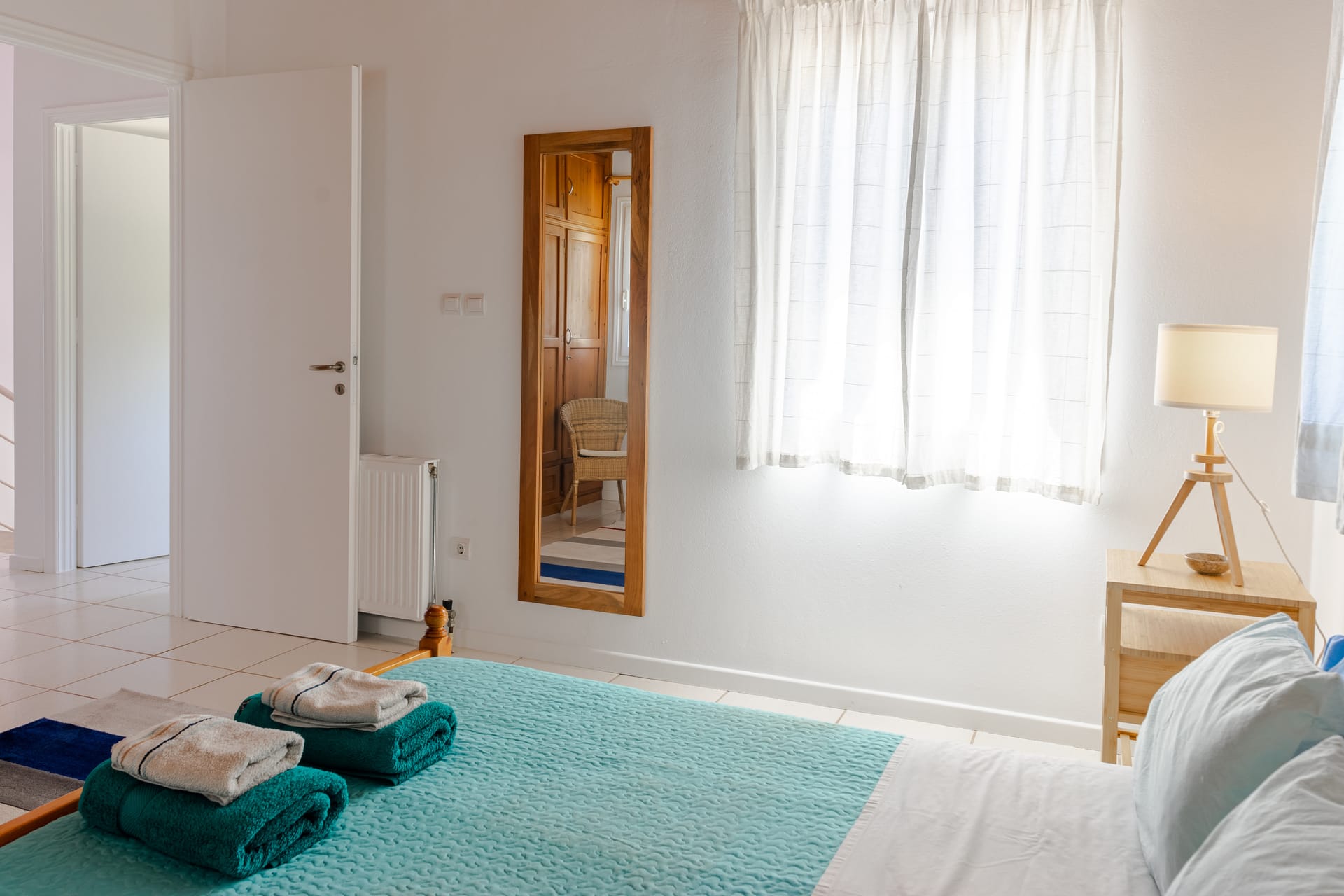 The house has 3 generous double bedrooms and another smaller bedroom containing 2 single beds. The first of these doubles is on the ground floor, along with a large family shower room. Up the sweeping staircase you’ll find two further large bedrooms, with high wooden ceilings. The large family bathroom is also on this level. The childrens’ bedroom is tucked into what feels like a lookout at the top of a mast, overlooking the gulf towards the mountains beyond.