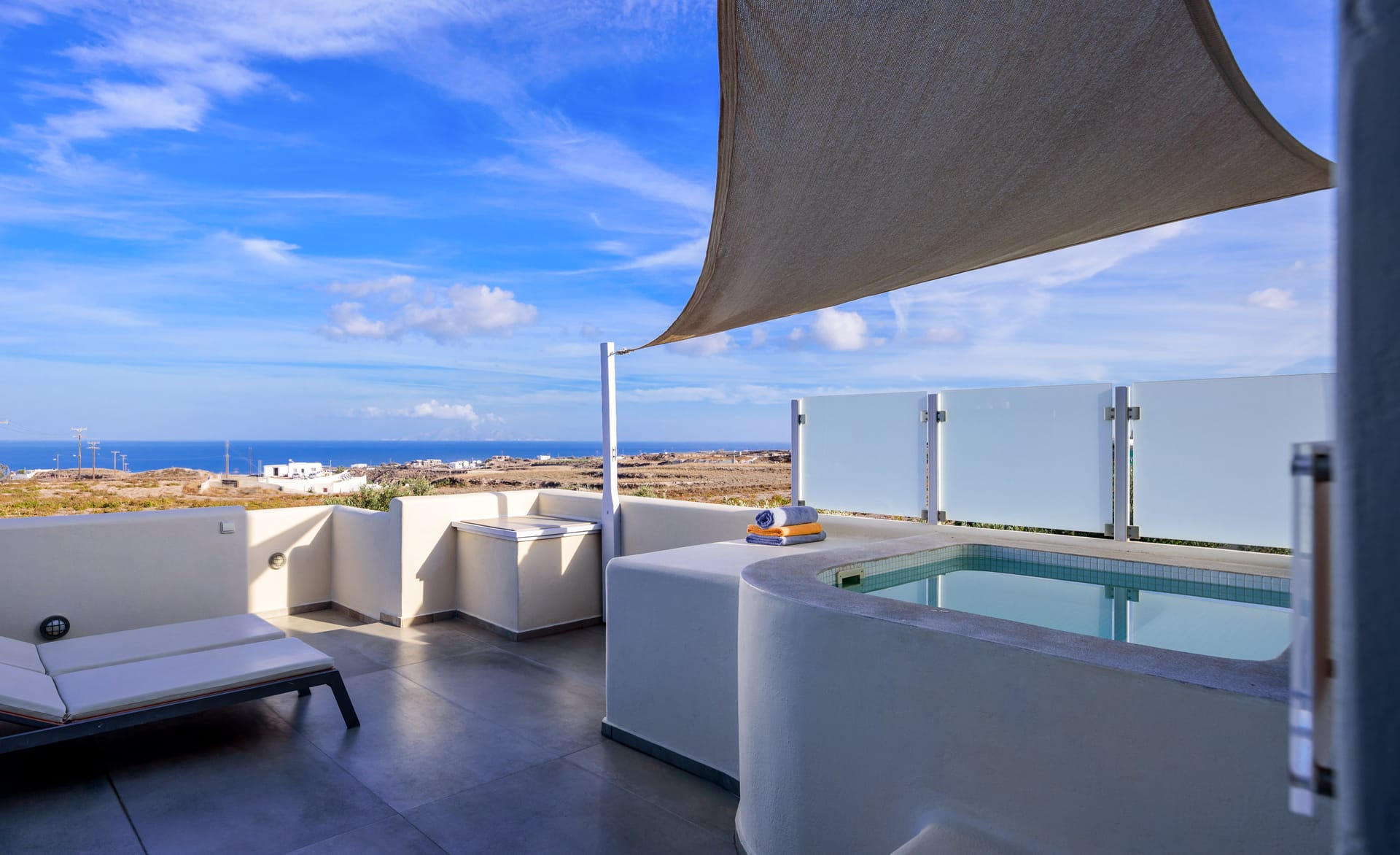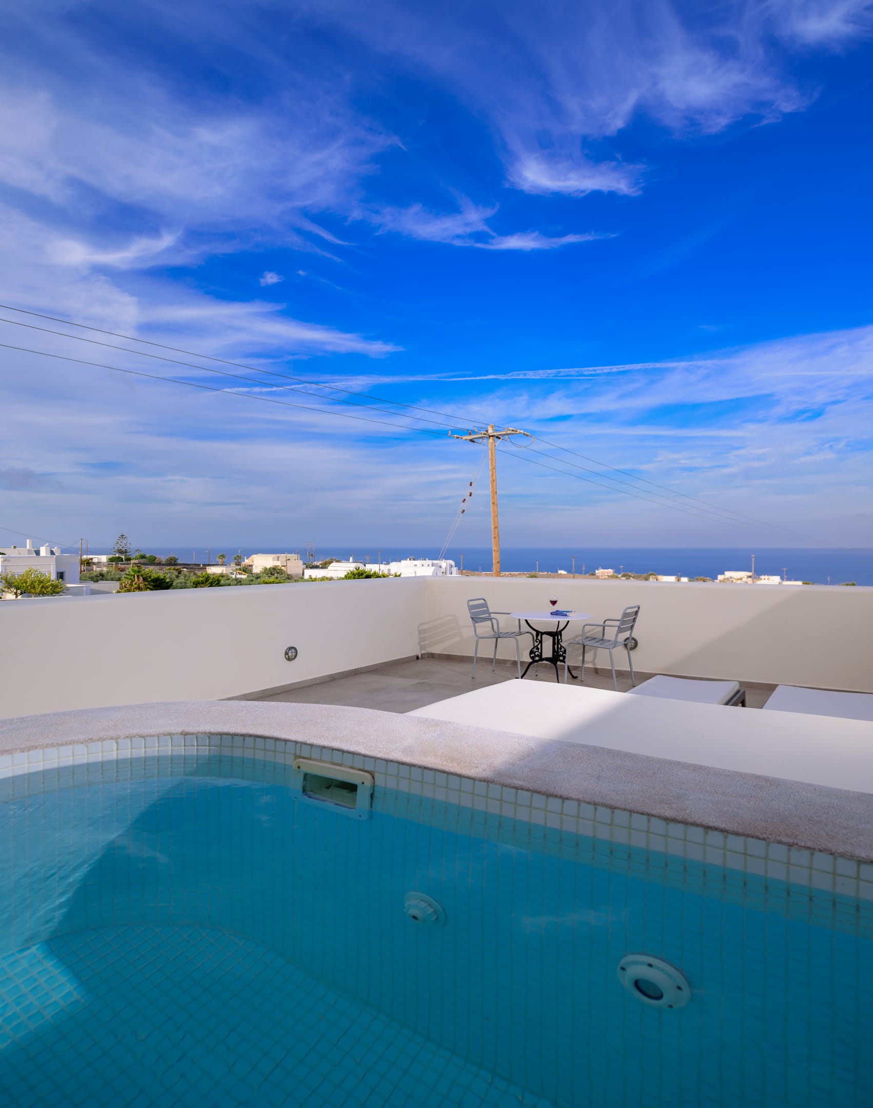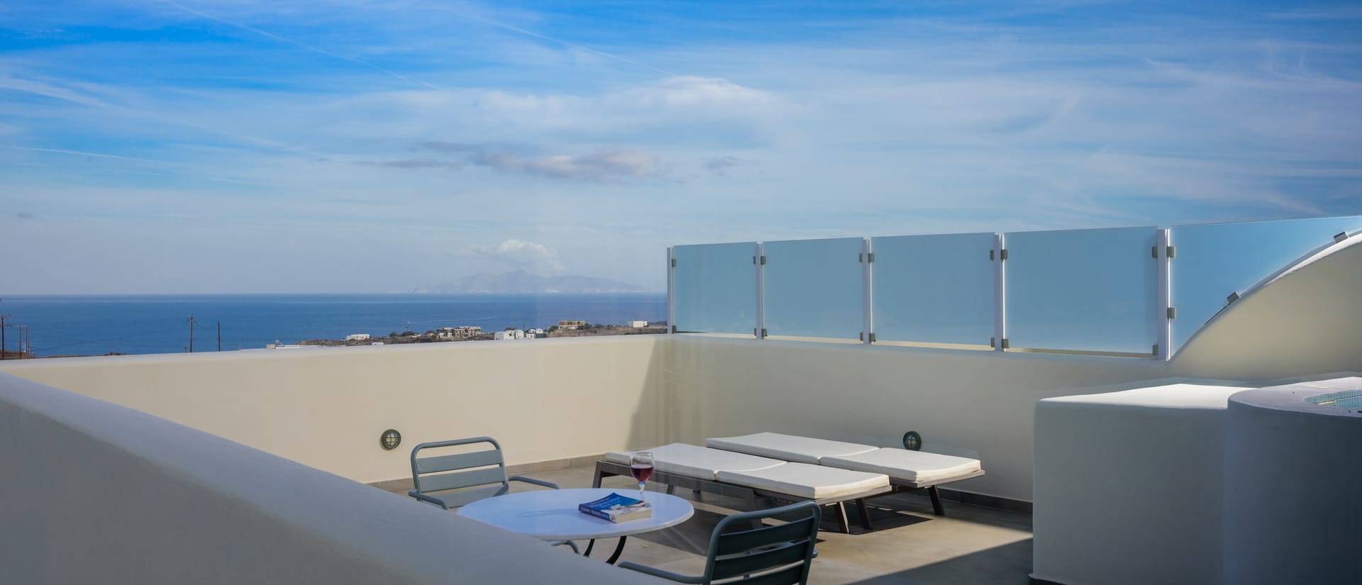 Suites with air-conditioning (heat & cold), King size bed, mini fridge, direct dial telephone, satellite-TV, safe deposit box, hairdryer, bathroom with rain shower, outdoor private Jacuzzi, balcony or terrace with sun beds and umbrella offering sea view.