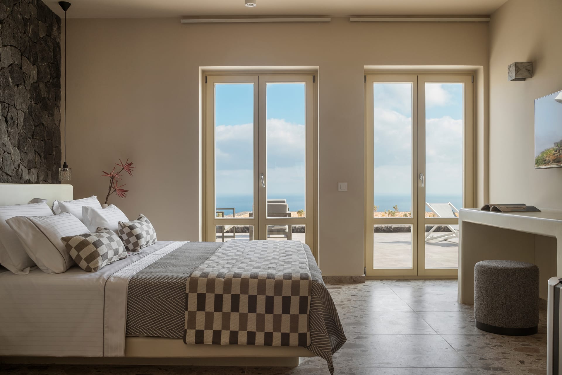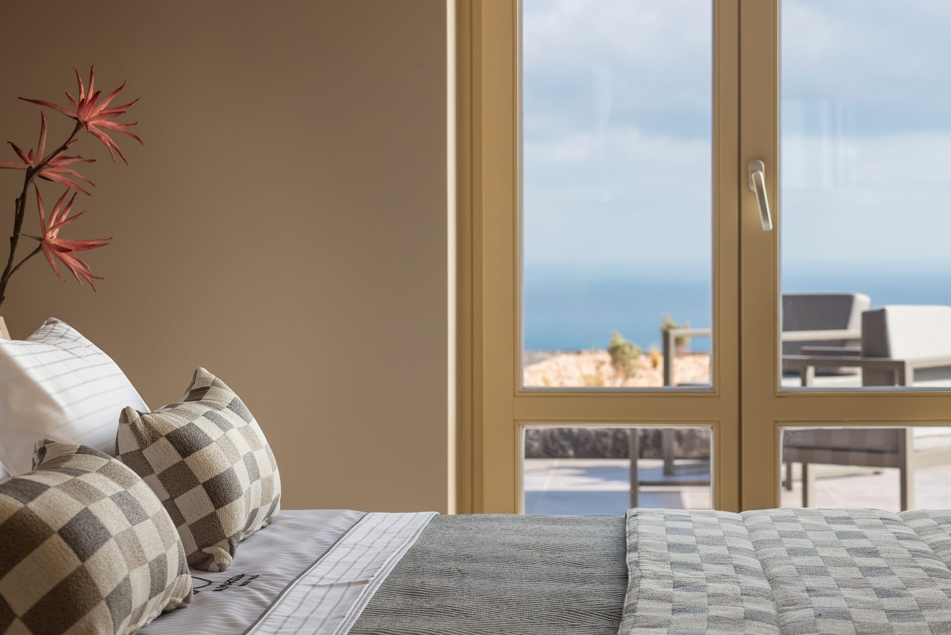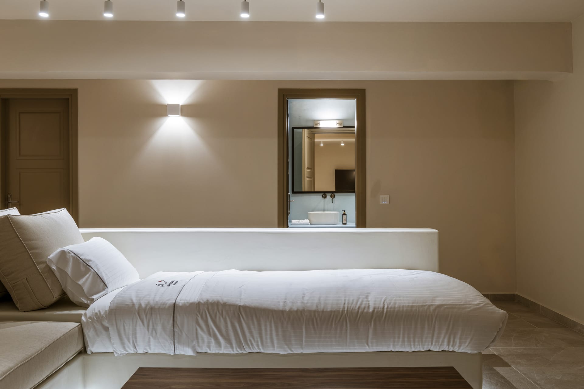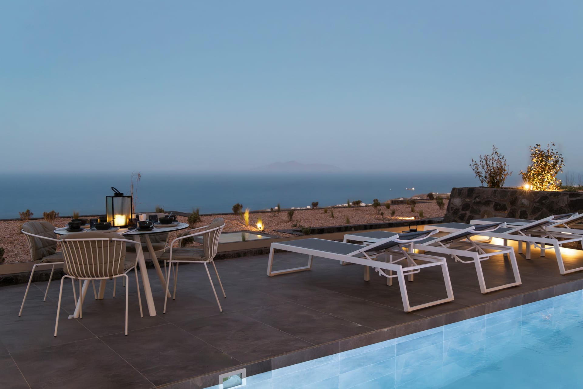 A villa of 170 sqm that comprises one (1) master bedroom of 30 sqm with an ensuite bathroom (the shower is separated from the WC). The living space comprises an open-plan kitchenette equipped with a fridge, a microwave and a Nespresso coffee maker. There is also a lounge with two (2) extra-long built-in sofas with anatomic mattresses which serve also as sofa beds. The lounge has also a guest bathroom. Going down, in the lower floor there is a very spacious recreational space with a 60-inch Smart TV and two (2) long built-in sofas that serve also as sofa beds. This space has also another full bathroom with a shower. There is a sea view from every space in the villa. Each villa has a very spacious private terrace with outdoor furnishing and a large 25 square meters swimming pool. The villa is equipped with top-quality linen, signature bath amenities and smart TV’s. There is also staff available 24/7 offering concierge services.