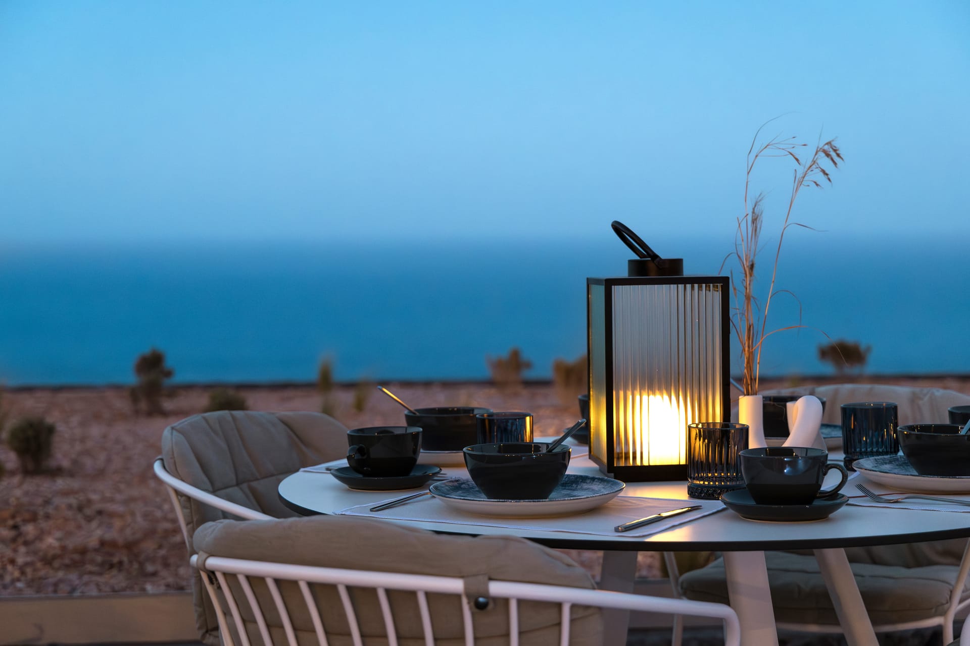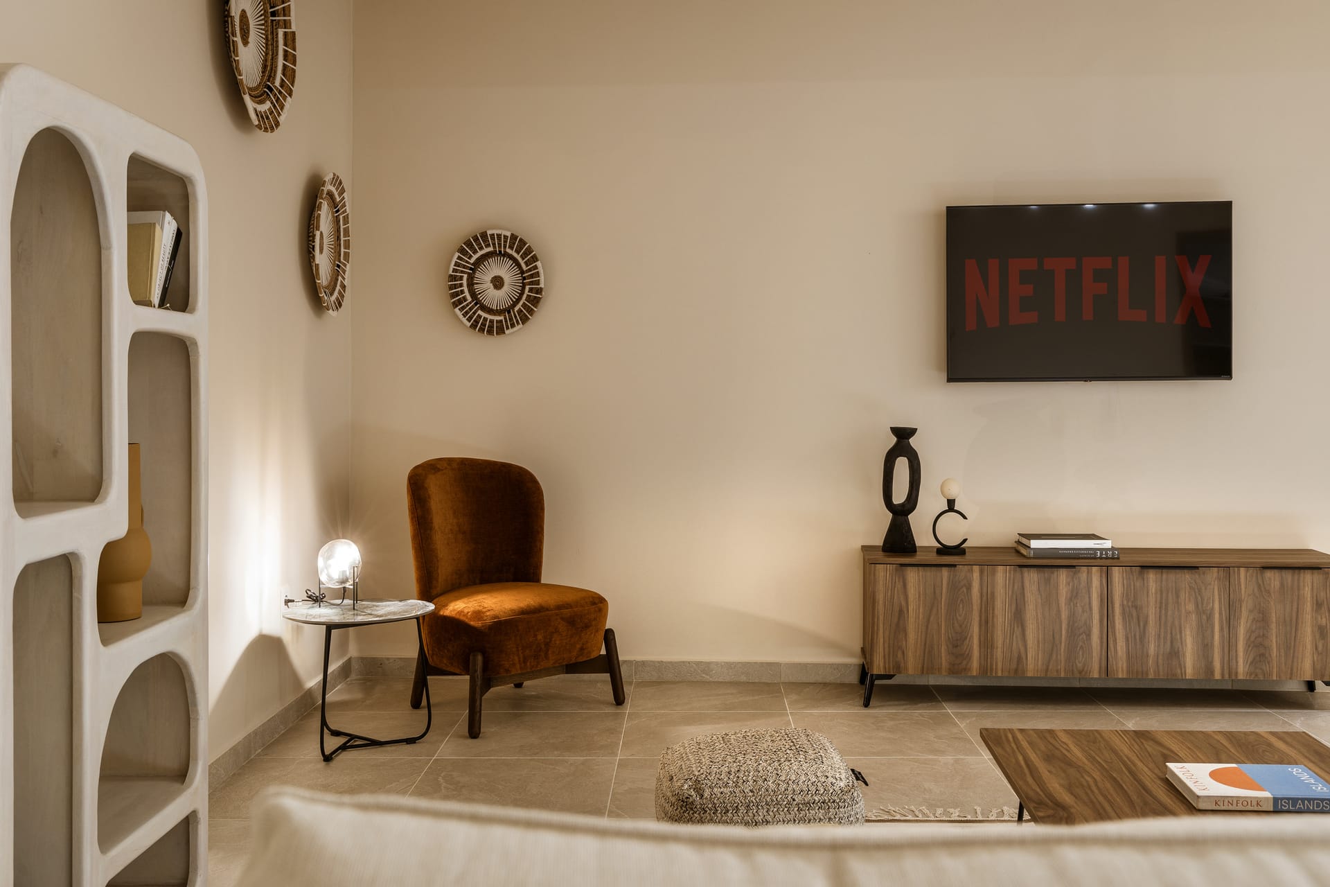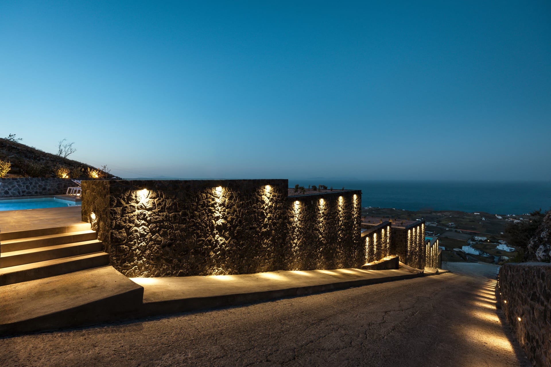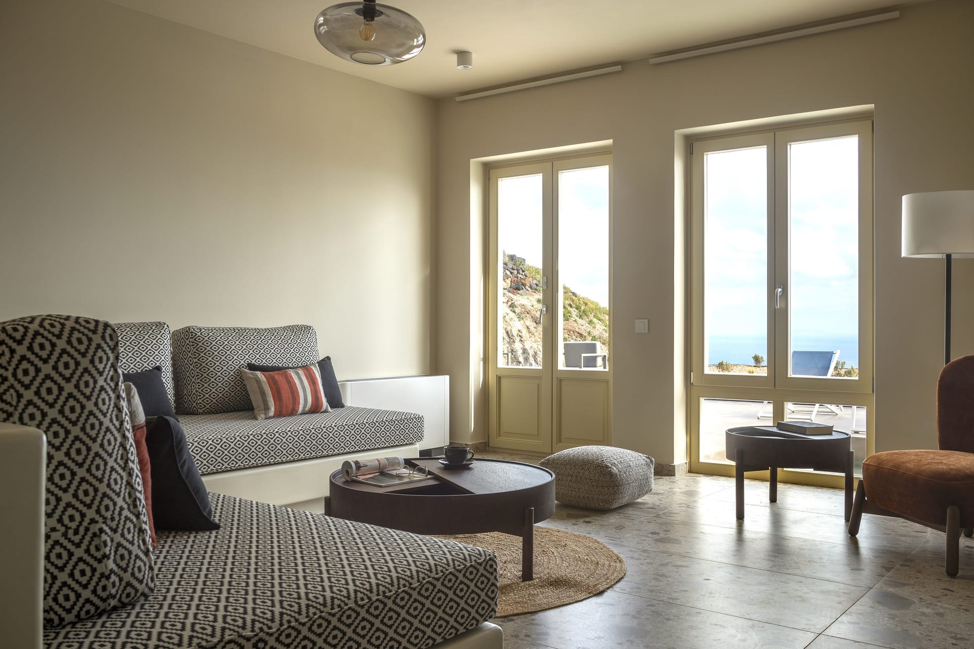 A villa of 170 sqm that comprises one (1) master bedroom of 30 sqm with an ensuite bathroom (the shower is separated from the WC). The living space comprises an open-plan kitchenette equipped with a fridge, a microwave and a Nespresso coffee maker. There is also a lounge with two (2) extra-long built-in sofas with anatomic mattresses which serve also as sofa beds. The lounge has also a guest bathroom. Going down, in the lower floor there is a very spacious recreational space with a 60-inch Smart TV and two (2) long built-in sofas that serve also as sofa beds. This space has also another full bathroom with a shower. There is a sea view from every space in the villa. Each villa has a very spacious private terrace with outdoor furnishing and a large 25 square meters swimming pool. The villa is equipped with top-quality linen, signature bath amenities and smart TV’s. There is also staff available 24/7 offering concierge services.