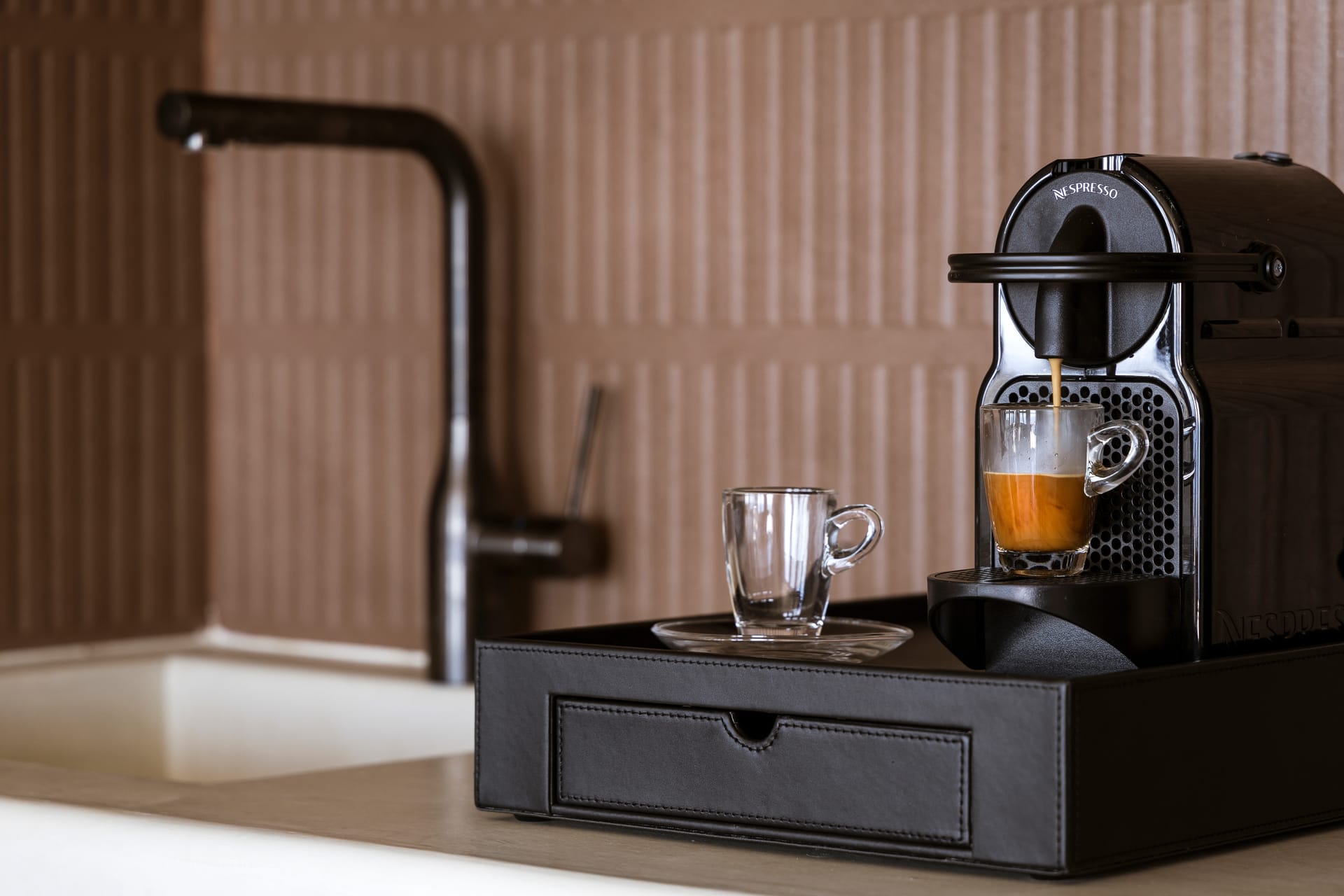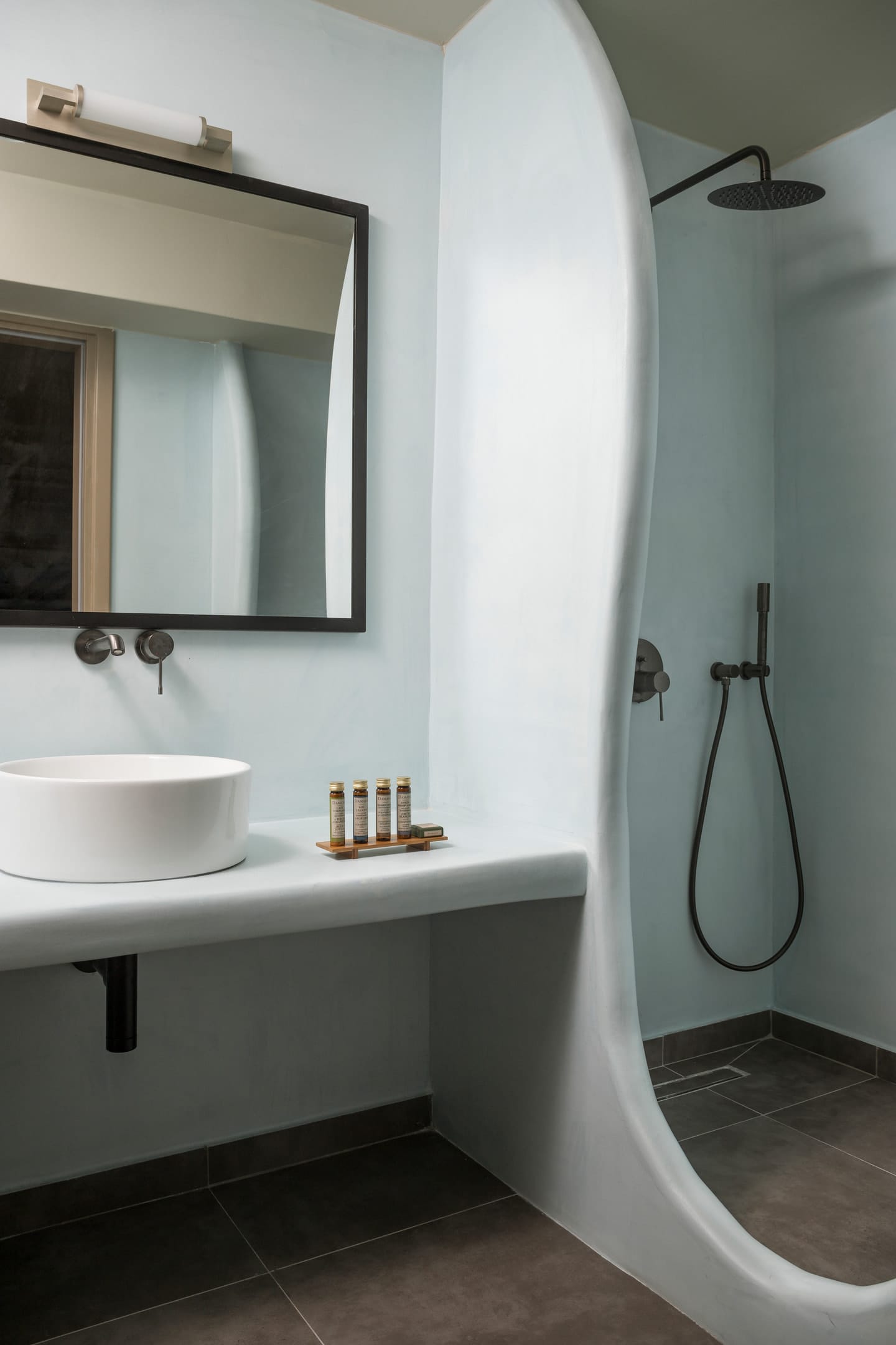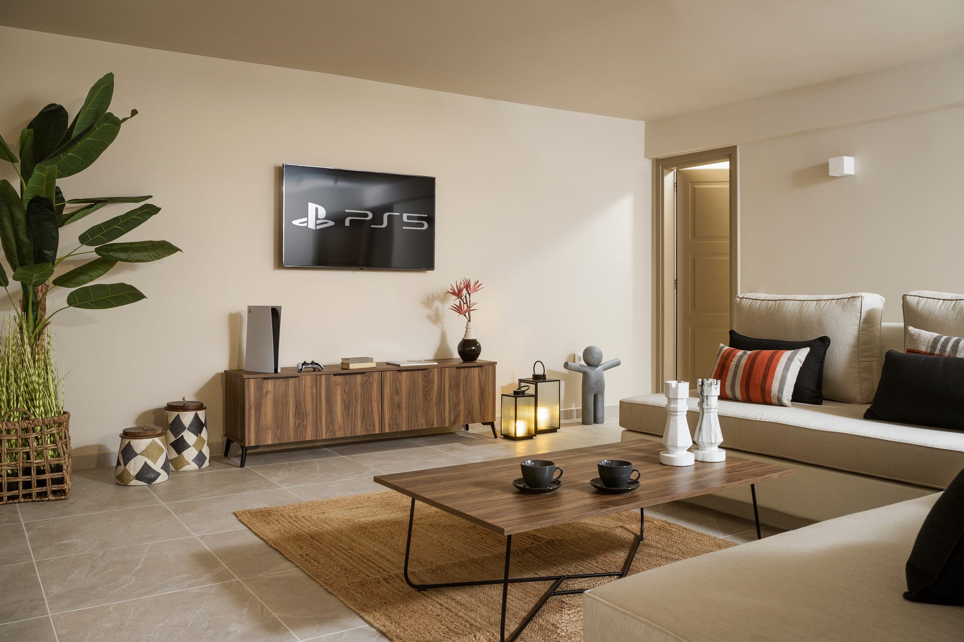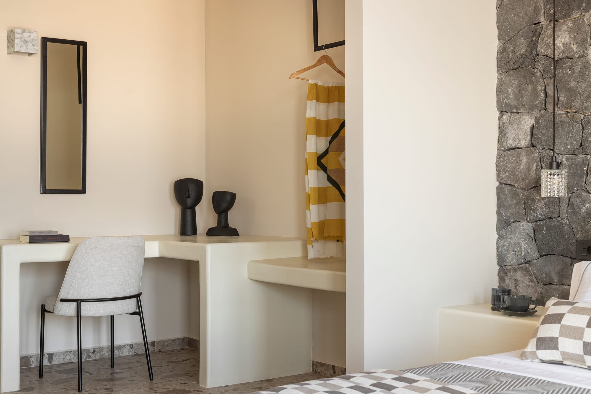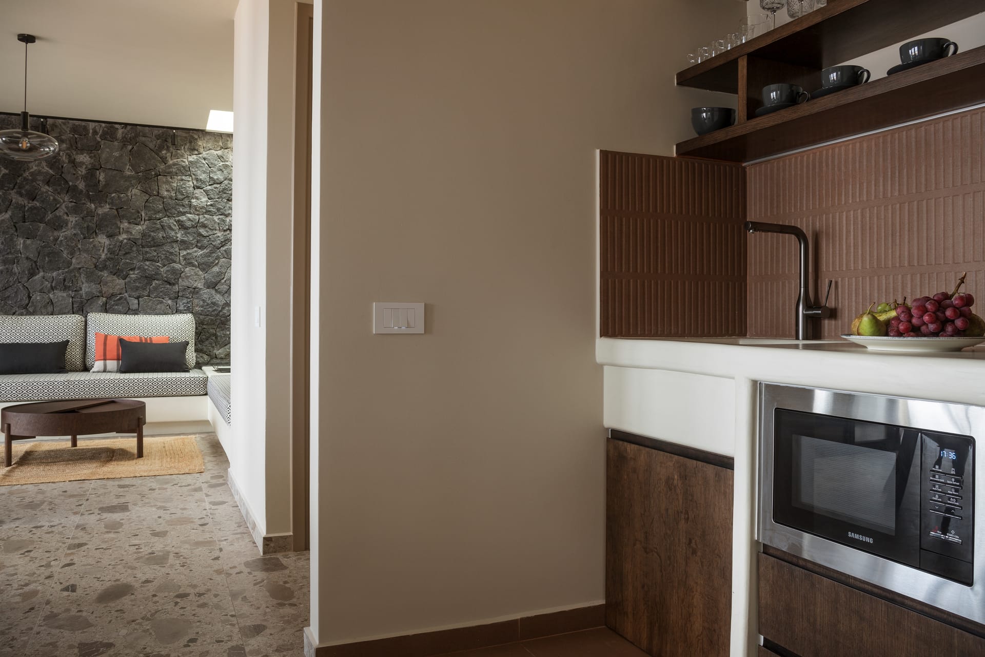 A villa of 170 sqm that comprises one (1) master bedroom of 30 sqm with an ensuite bathroom (the shower is separated from the WC). The living space comprises an open-plan kitchenette equipped with a fridge, a microwave and a Nespresso coffee maker. There is also a lounge with two (2) extra-long built-in sofas with anatomic mattresses which serve also as sofa beds. The lounge has also a guest bathroom. Going down, in the lower floor there is a very spacious recreational space with a 60-inch Smart TV and two (2) long built-in sofas that serve also as sofa beds. This space has also another full bathroom with a shower. There is a sea view from every space in the villa. Each villa has a very spacious private terrace with outdoor furnishing and a large 25 square meters swimming pool. The villa is equipped with top-quality linen, signature bath amenities and smart TV’s. There is also staff available 24/7 offering concierge services.
