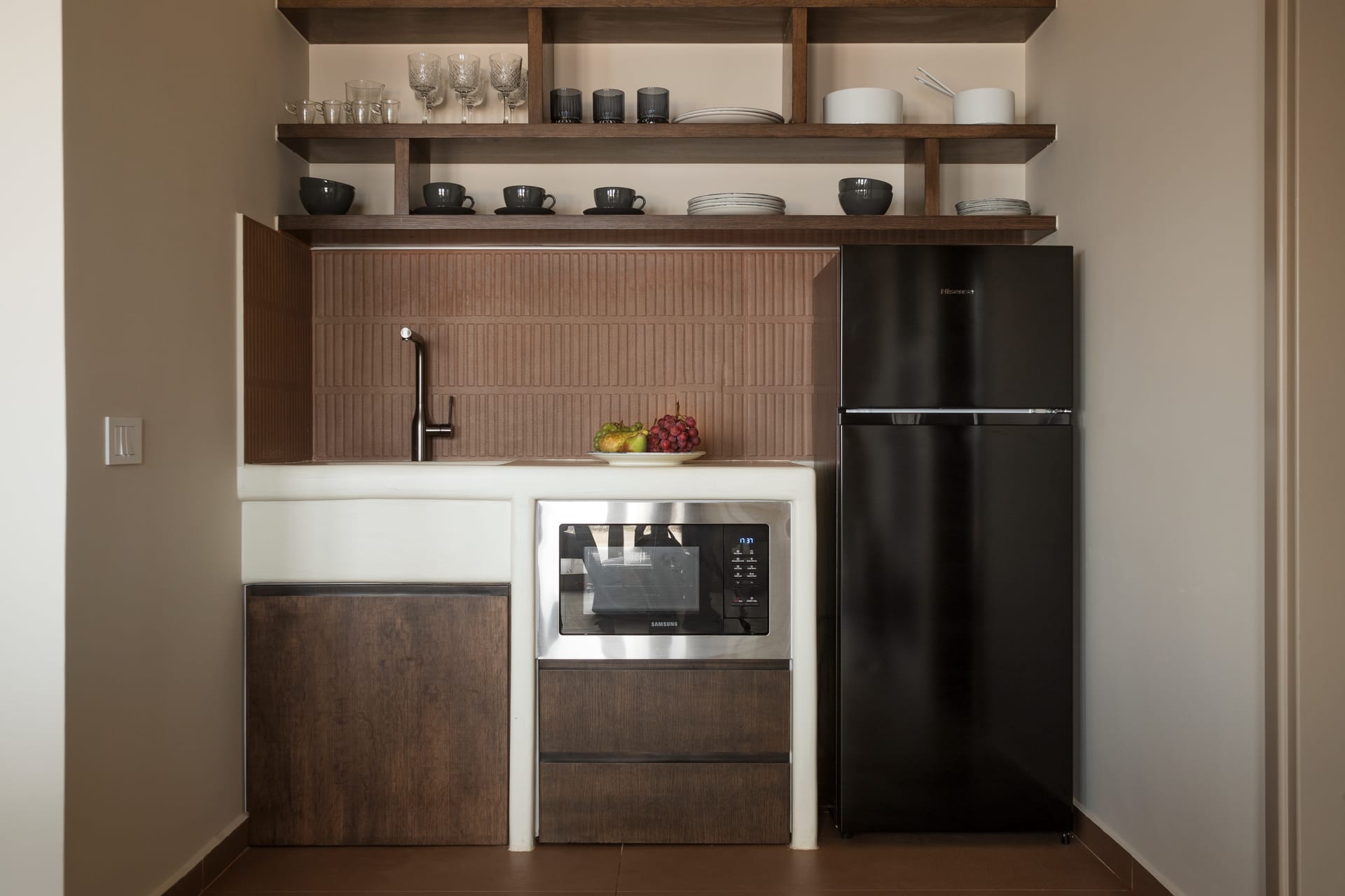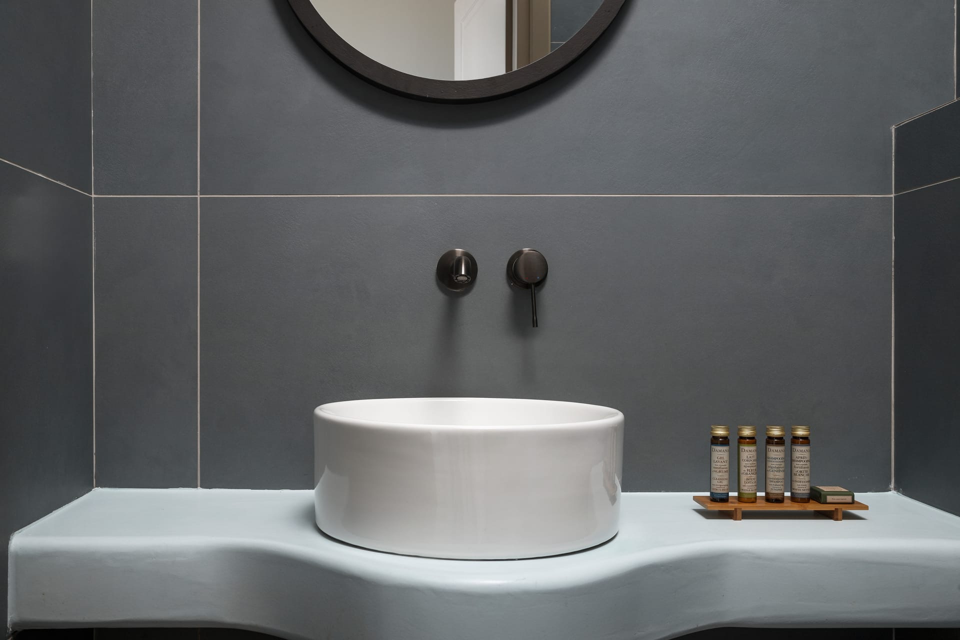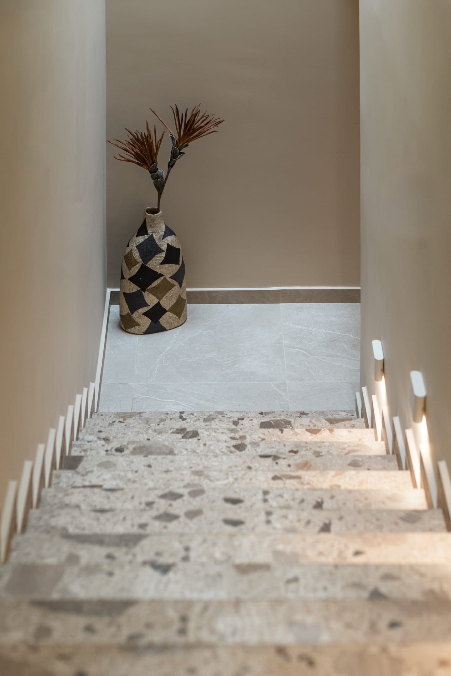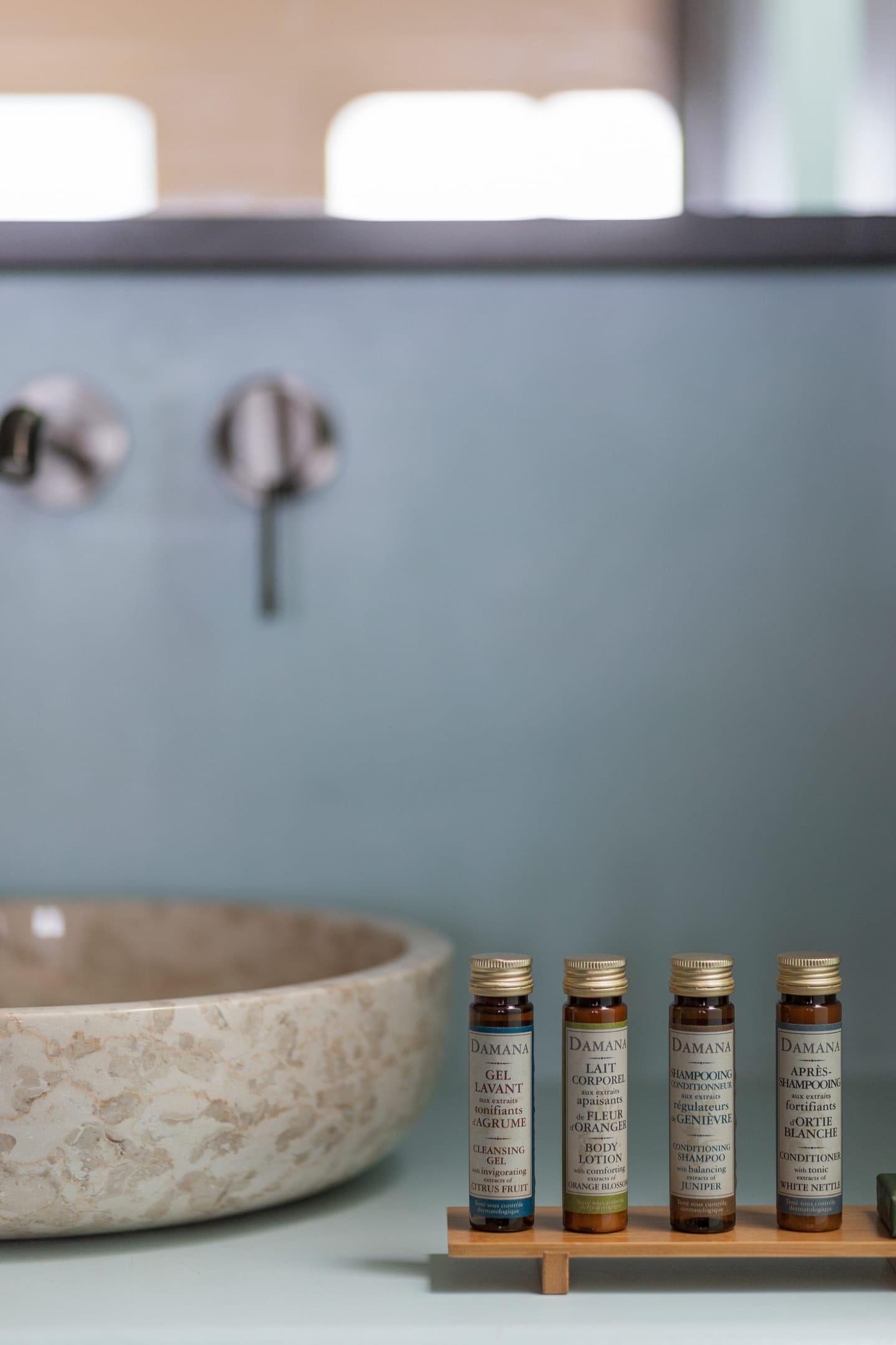 A villa of 170 sqm that comprises one (1) master bedroom of 30 sqm with an ensuite bathroom (the shower is separated from the WC). The living space comprises an open-plan kitchenette equipped with a fridge, a microwave and a Nespresso coffee maker. There is also a lounge with two (2) extra-long built-in sofas with anatomic mattresses which serve also as sofa beds. The lounge has also a guest bathroom. Going down, in the lower floor there is a very spacious recreational space with a 60-inch Smart TV and two (2) long built-in sofas that serve also as sofa beds. This space has also another full bathroom with a shower. There is a sea view from every space in the villa. Each villa has a very spacious private terrace with outdoor furnishing and a large 25 square meters swimming pool. The villa is equipped with top-quality linen, signature bath amenities and smart TV’s. There is also staff available 24/7 offering concierge services.