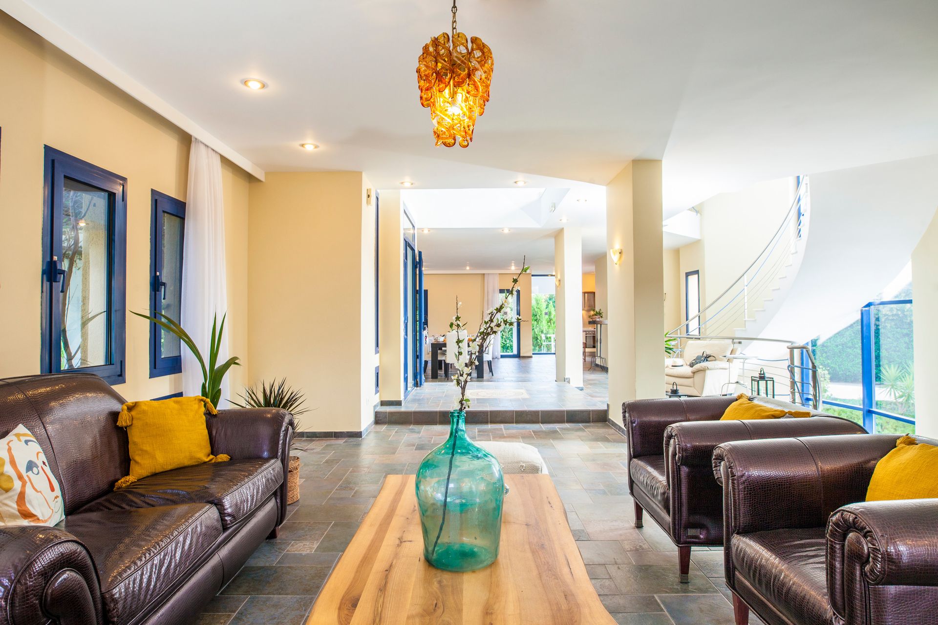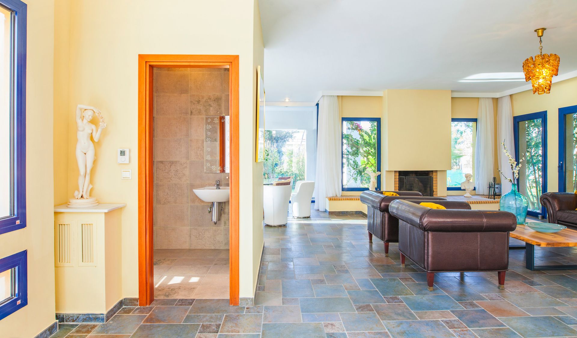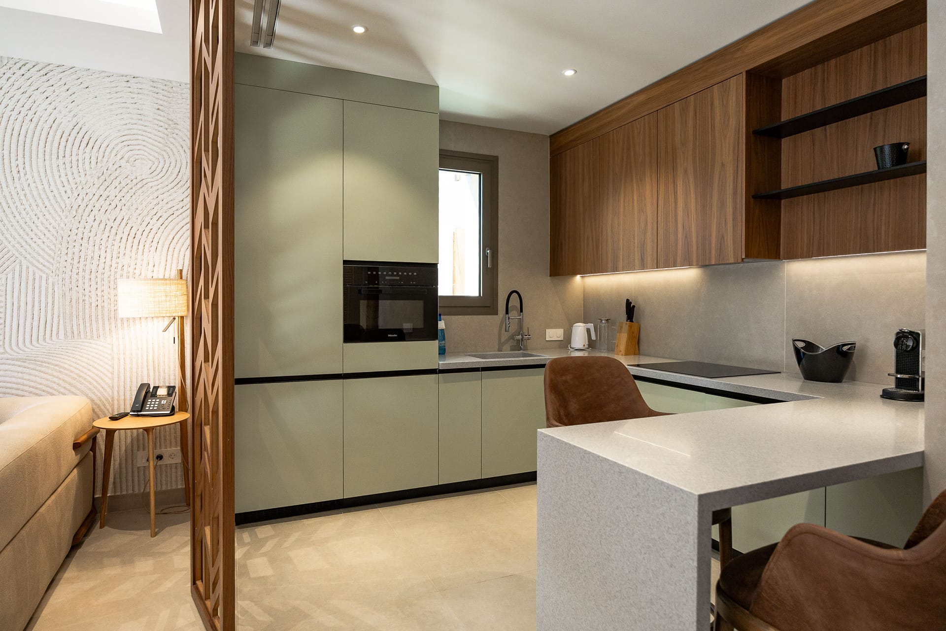In the northern part of Corfu, six newly built villas sit within the lush grounds of the renowned five-star Almyros Beach Resort and Spa. The villas are thoughtfully arranged across three stylish buildings, each housing two independent villas with the option of interconnected doors. Each villa has its own private pool and a leafy green garden where guests can enjoy themselves under the sun of the day or the stars of the mesmerizing black sky.