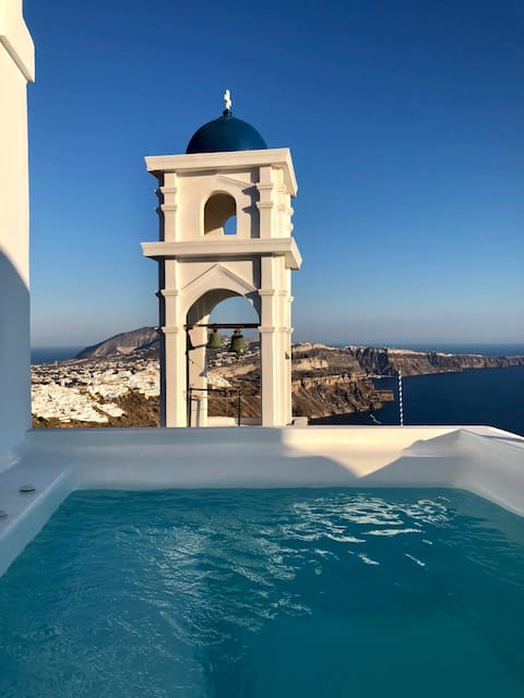 On the terrace, a private outdoor plunge pool and large day-bed offer breath-taking views to the caldera.