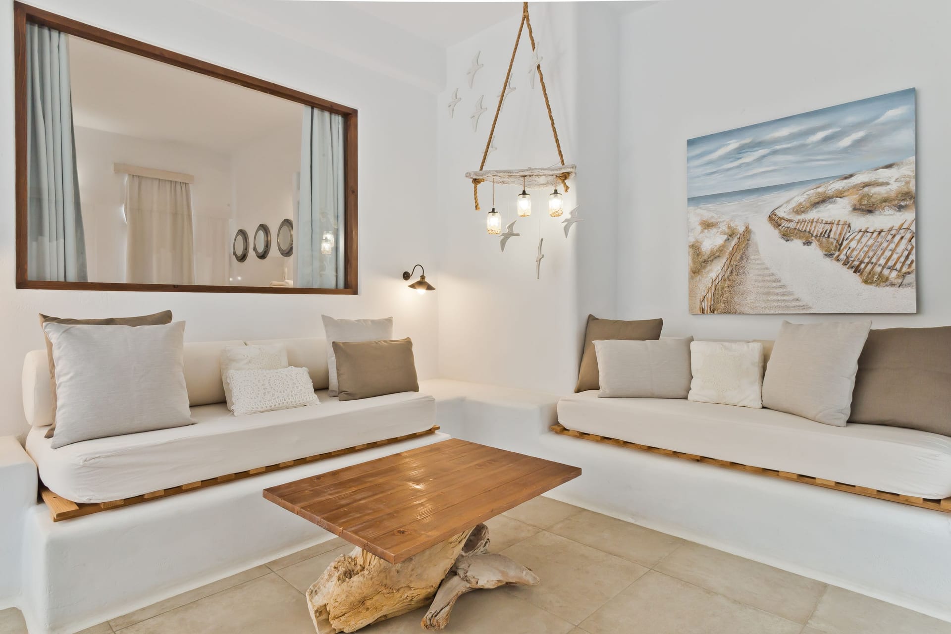 This large Bungalow of 55m² can accommodate up to 5 people. Its private spacious bedroom features a queen size bed, an open closet but also direct sea view when the shades of the large window division are open. The living room area has two sofa beds with twin size mattresses 0,90x2,00m. The kitchen with dining area, features ceramic cooking hobs, electric oven and basic electrical appliances that might be needed. The bathroom has a walk-in shower and luxury amenities from bio Karpathian Honey.