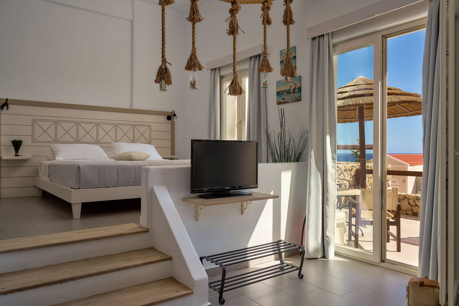 The Poolfront Open Plan Suite consists of a bedroom, a sitting area with a sofa bed and a kitchen, all in an open plan layout. The kitchen offers a dining area, and features ceramic cooking hobs, electric oven and basic electrical appliances that might be needed. The bathroom has a walk-in shower, and luxury amenities from bio Karpathian Honey.