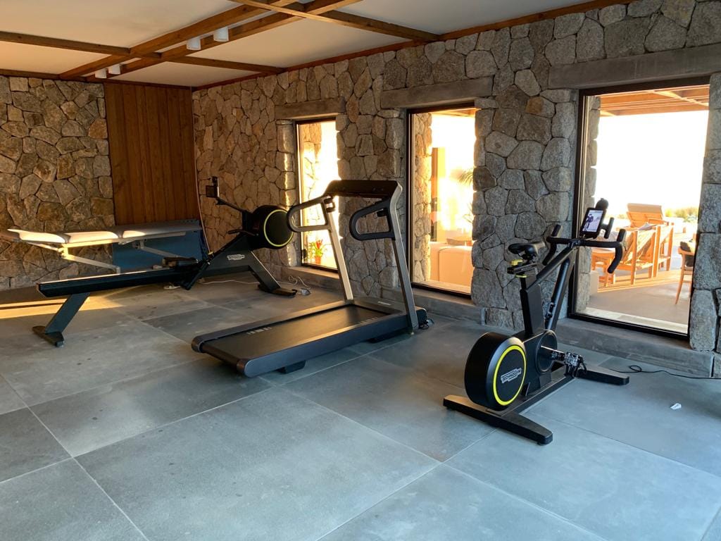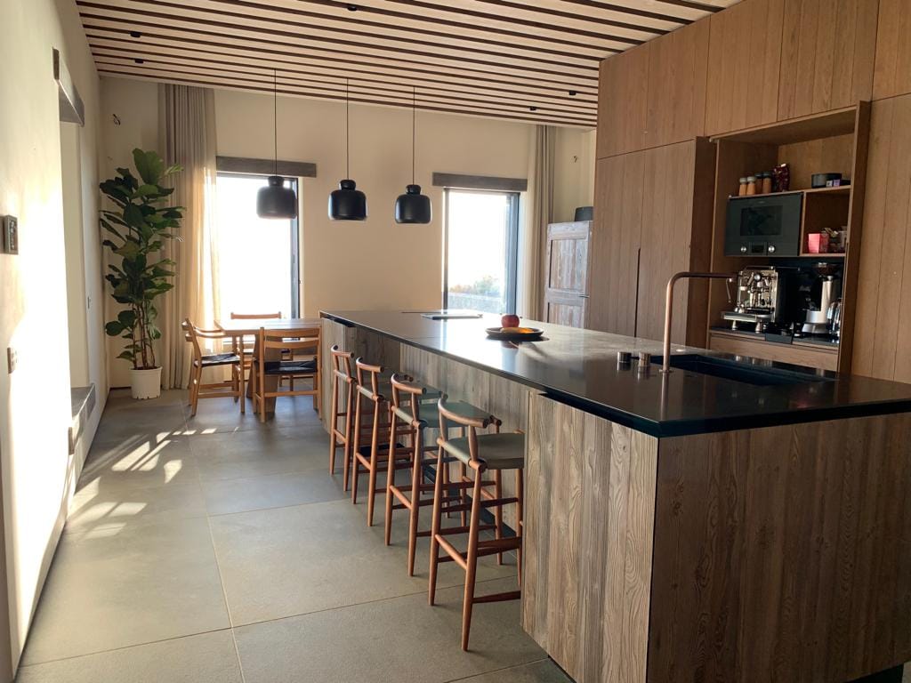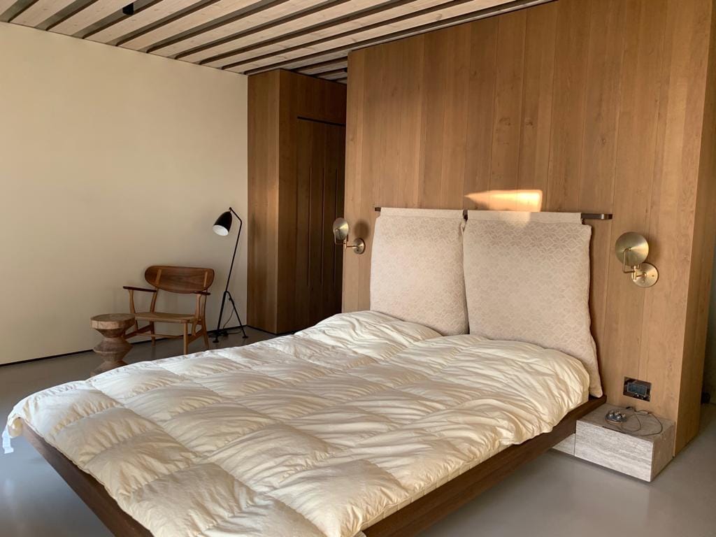 The villa’s design is a tribute to contemporary industrial aesthetics, featuring concrete ceilings, sleek metal fixtures, and elegant stone-grey tiles.