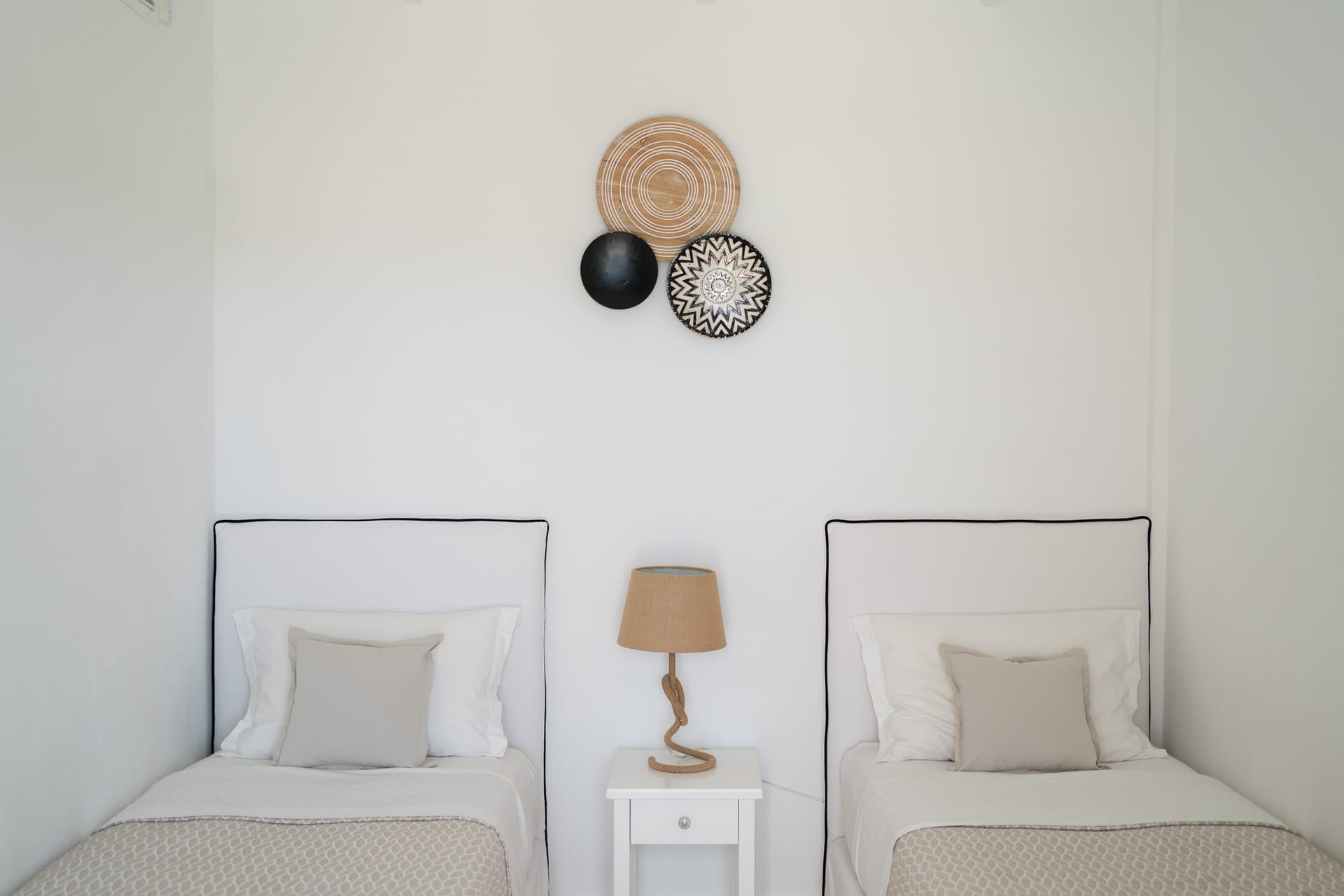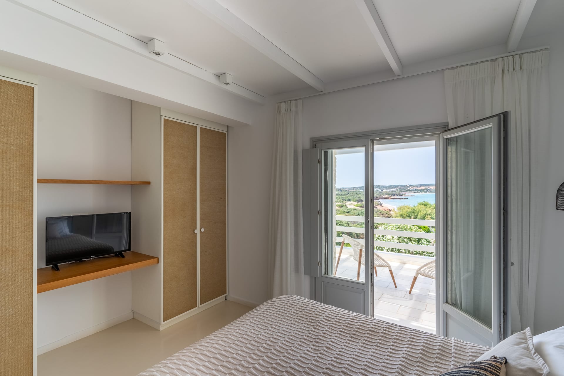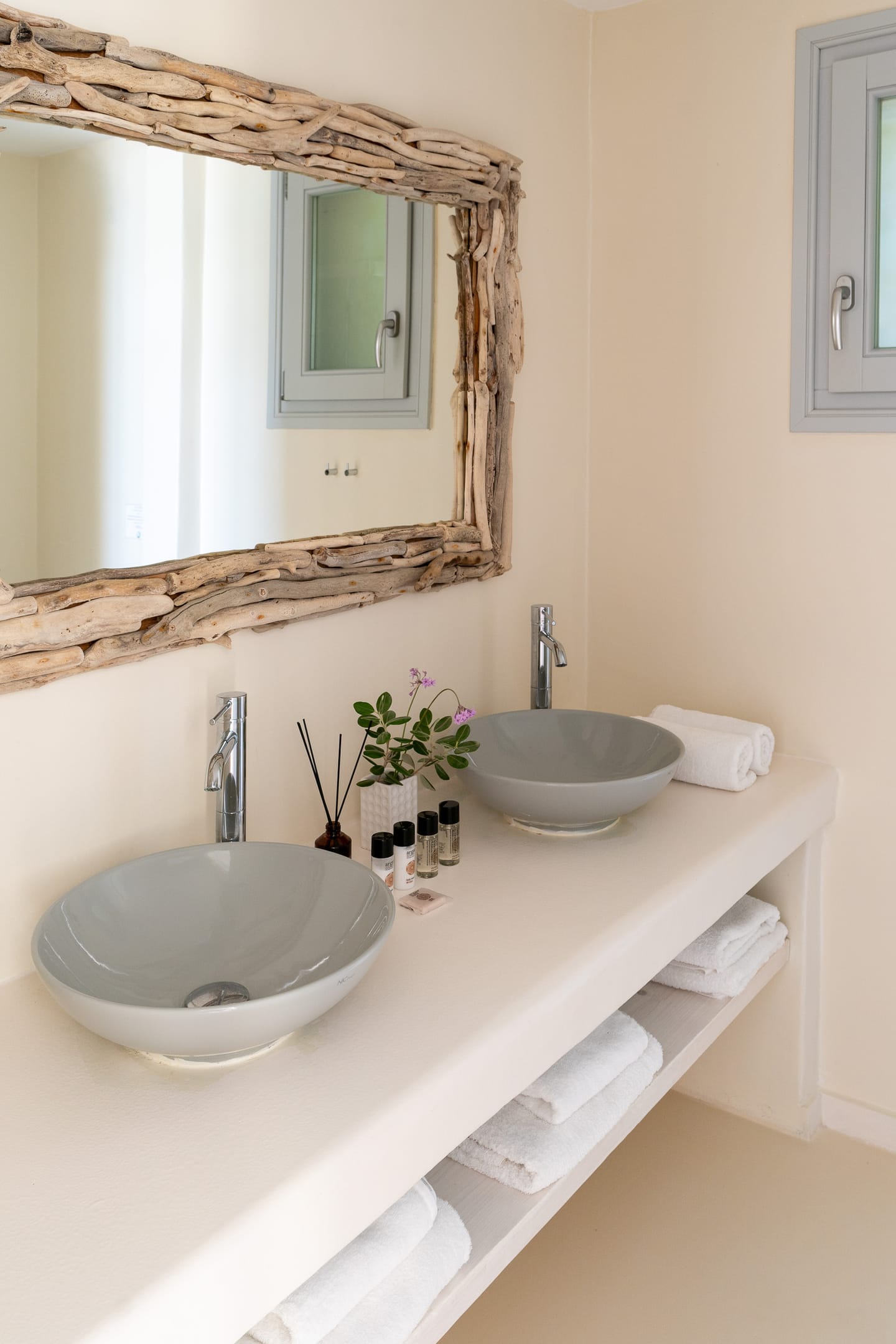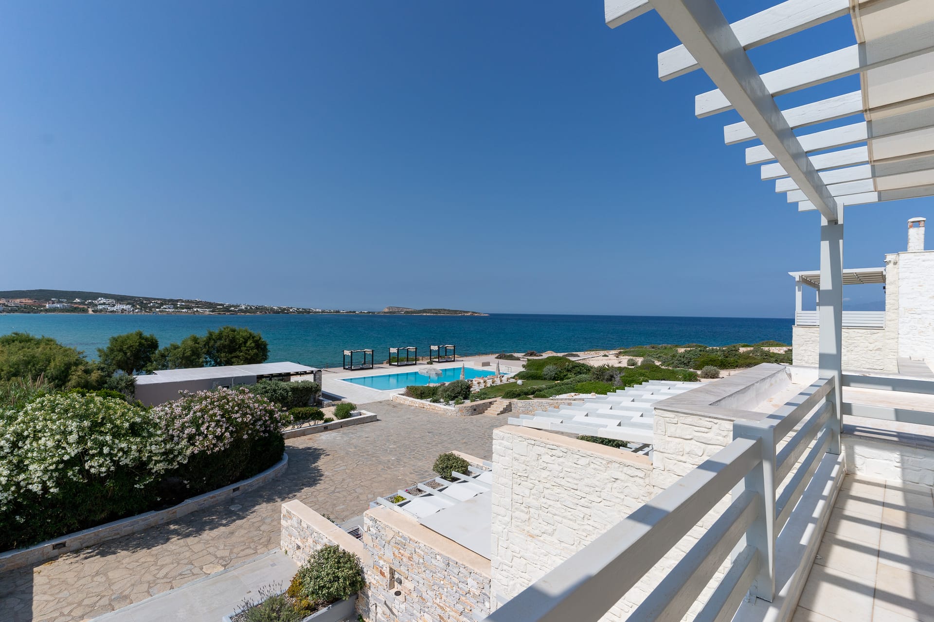 The two-story Junior villa (130sq.m.) faces a spectacular view of the sea and Santa Maria beach and is welcoming you to bright, stylish spaces set up with three cozy bedrooms—ideal for seven persons. The ground floor consists of a bedroom with a modern en-suite bathroom, a fully equipped kitchen and an open-plan dining room with a lounge area having a dazzling view over the Aegean from the large windows. The second floor is set with two bedrooms, one with a king-size bed and the other with twin beds, along with a large bathroom. The Junior Villa opens out on a balcony and a veranda, both beautifully furnished – the ideal hangouts to unwind relishing the views.