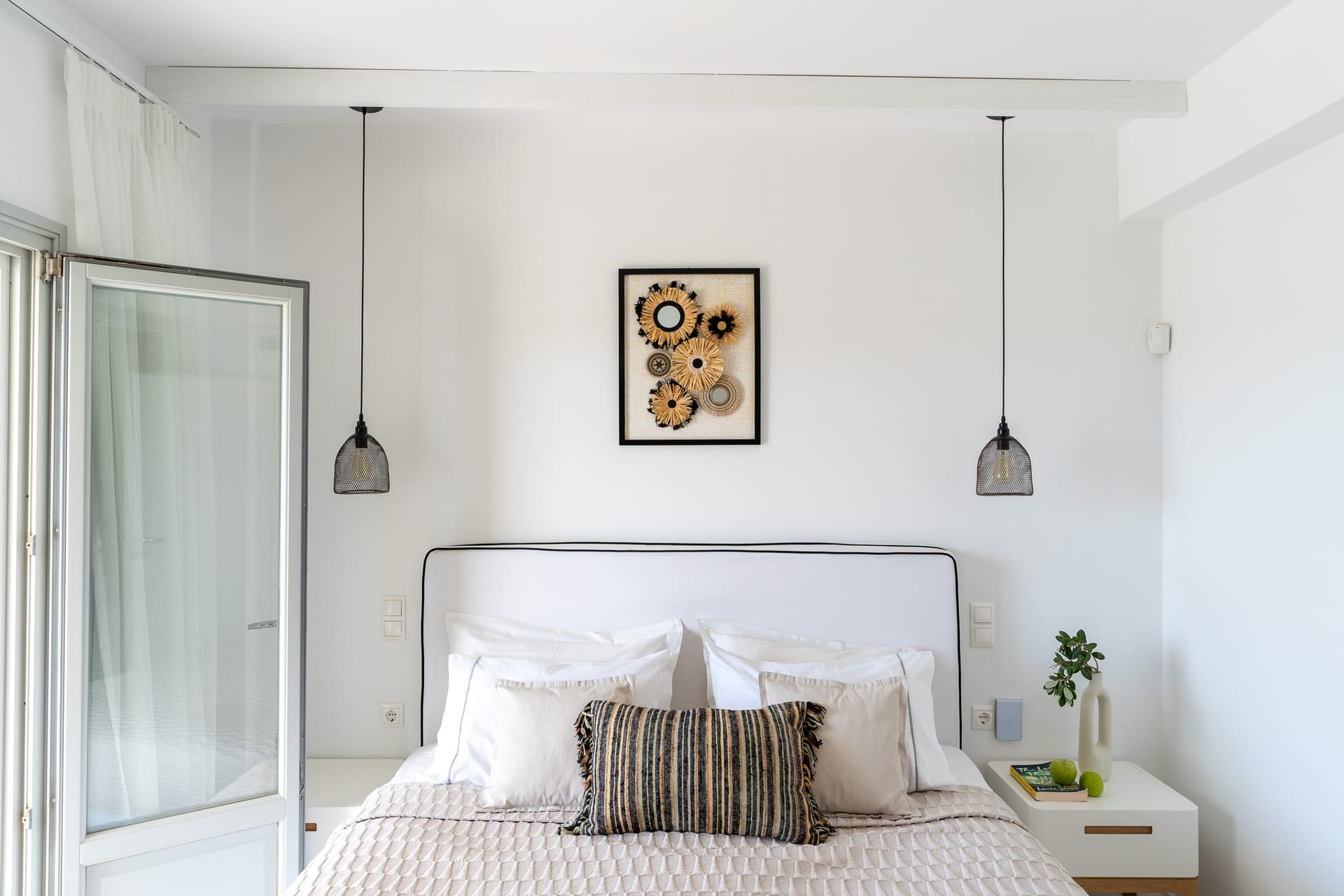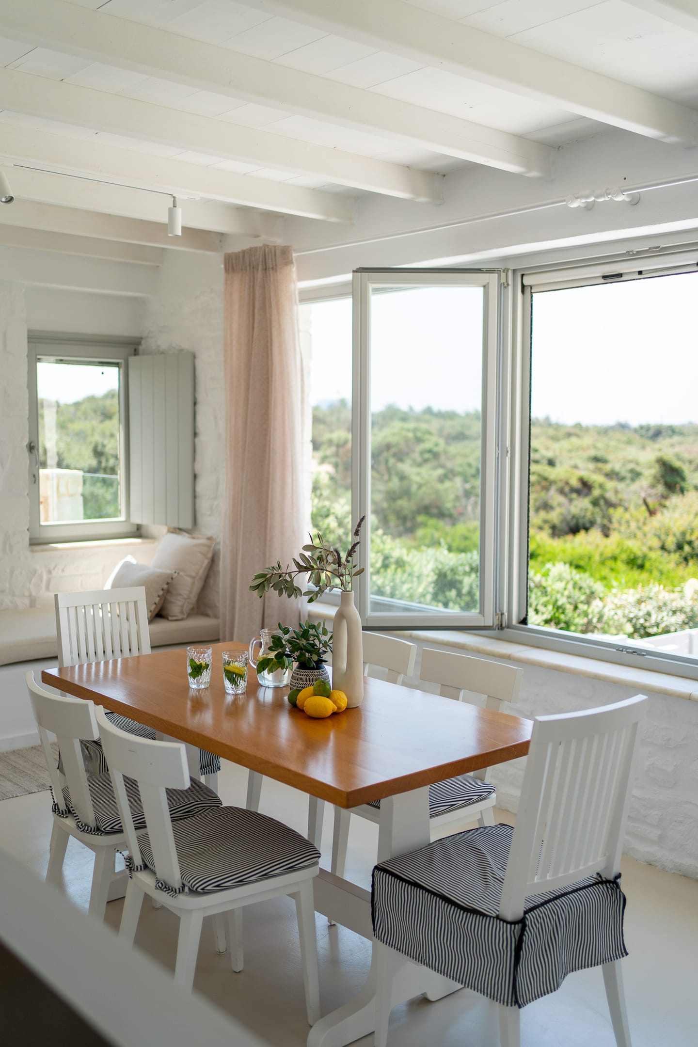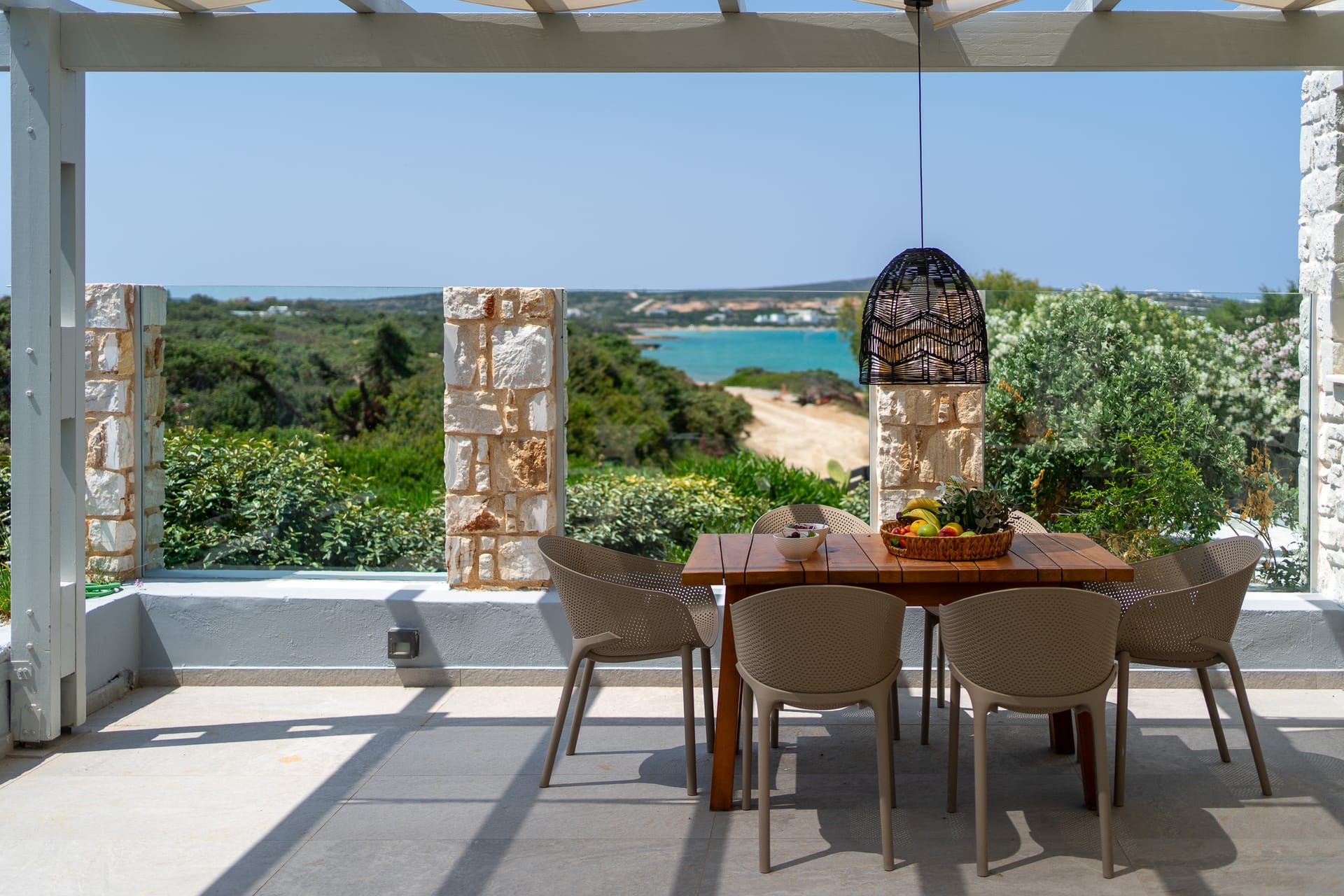 The two-story Junior villa (130sq.m.) faces a spectacular view of the sea and Santa Maria beach and is welcoming you to bright, stylish spaces set up with three cozy bedrooms—ideal for seven persons. The ground floor consists of a bedroom with a modern en-suite bathroom, a fully equipped kitchen and an open-plan dining room with a lounge area having a dazzling view over the Aegean from the large windows. The second floor is set with two bedrooms, one with a king-size bed and the other with twin beds, along with a large bathroom. The Junior Villa opens out on a balcony and a veranda, both beautifully furnished – the ideal hangouts to unwind relishing the views.