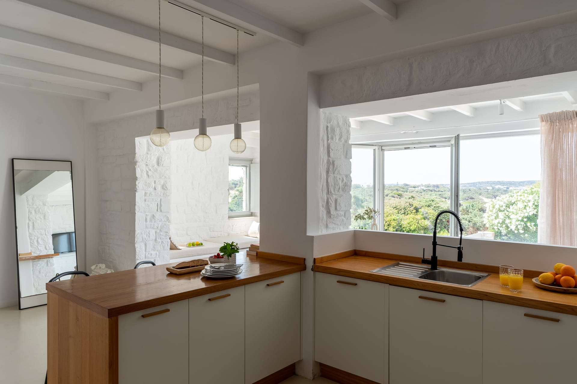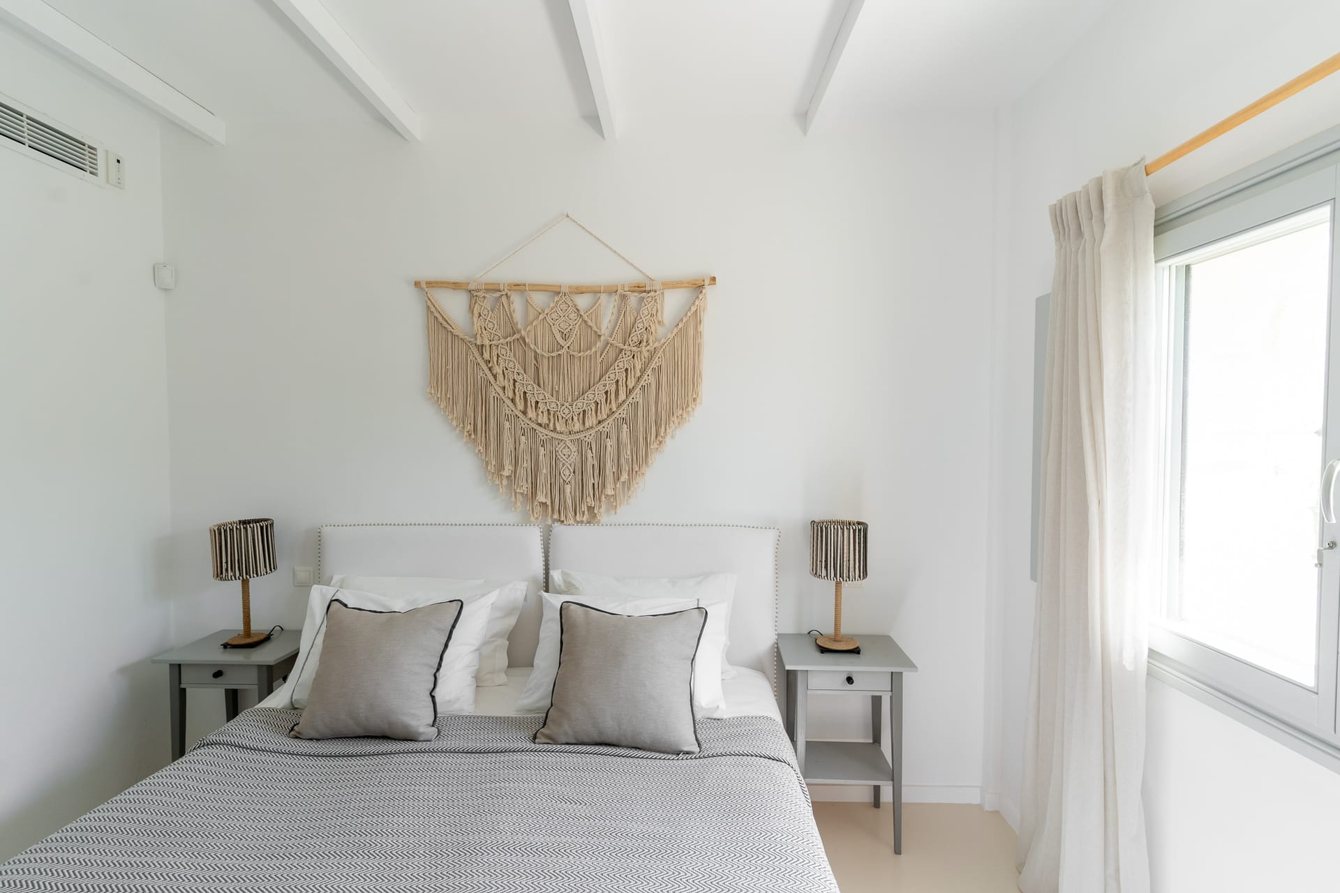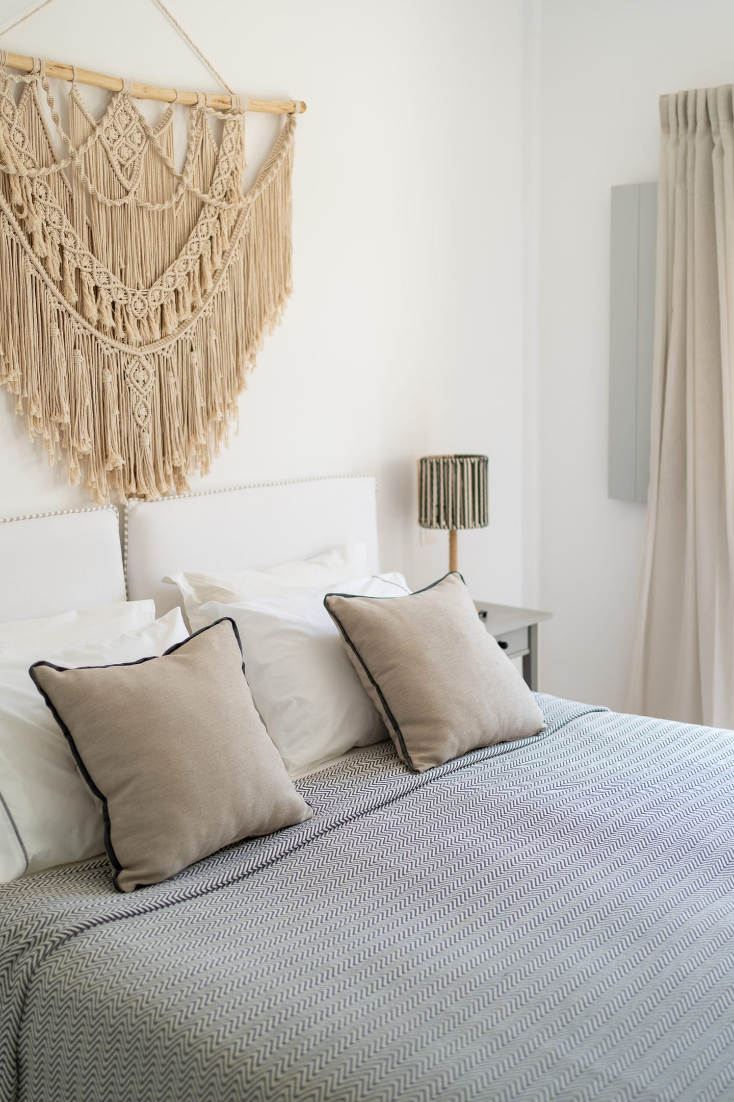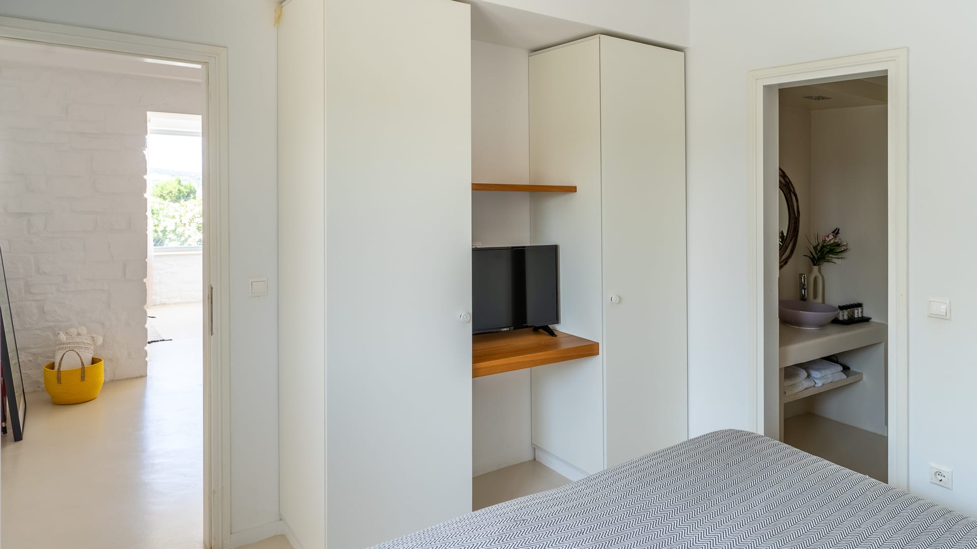 The two-story Junior villa (130sq.m.) faces a spectacular view of the sea and Santa Maria beach and is welcoming you to bright, stylish spaces set up with three cozy bedrooms—ideal for seven persons. The ground floor consists of a bedroom with a modern en-suite bathroom, a fully equipped kitchen and an open-plan dining room with a lounge area having a dazzling view over the Aegean from the large windows. The second floor is set with two bedrooms, one with a king-size bed and the other with twin beds, along with a large bathroom. The Junior Villa opens out on a balcony and a veranda, both beautifully furnished – the ideal hangouts to unwind relishing the views.