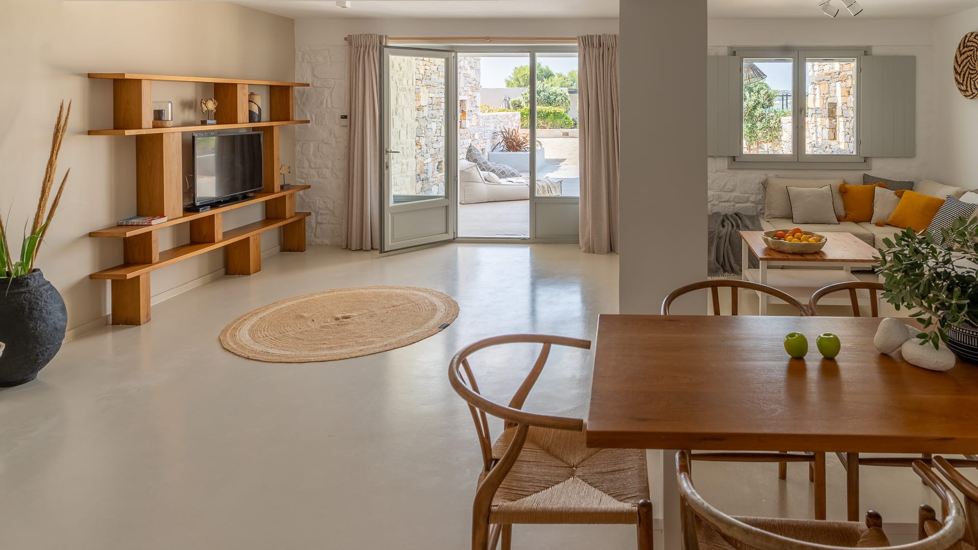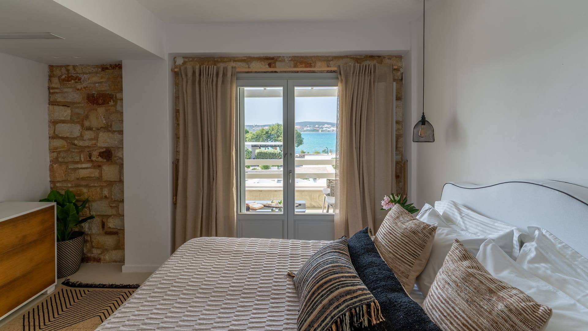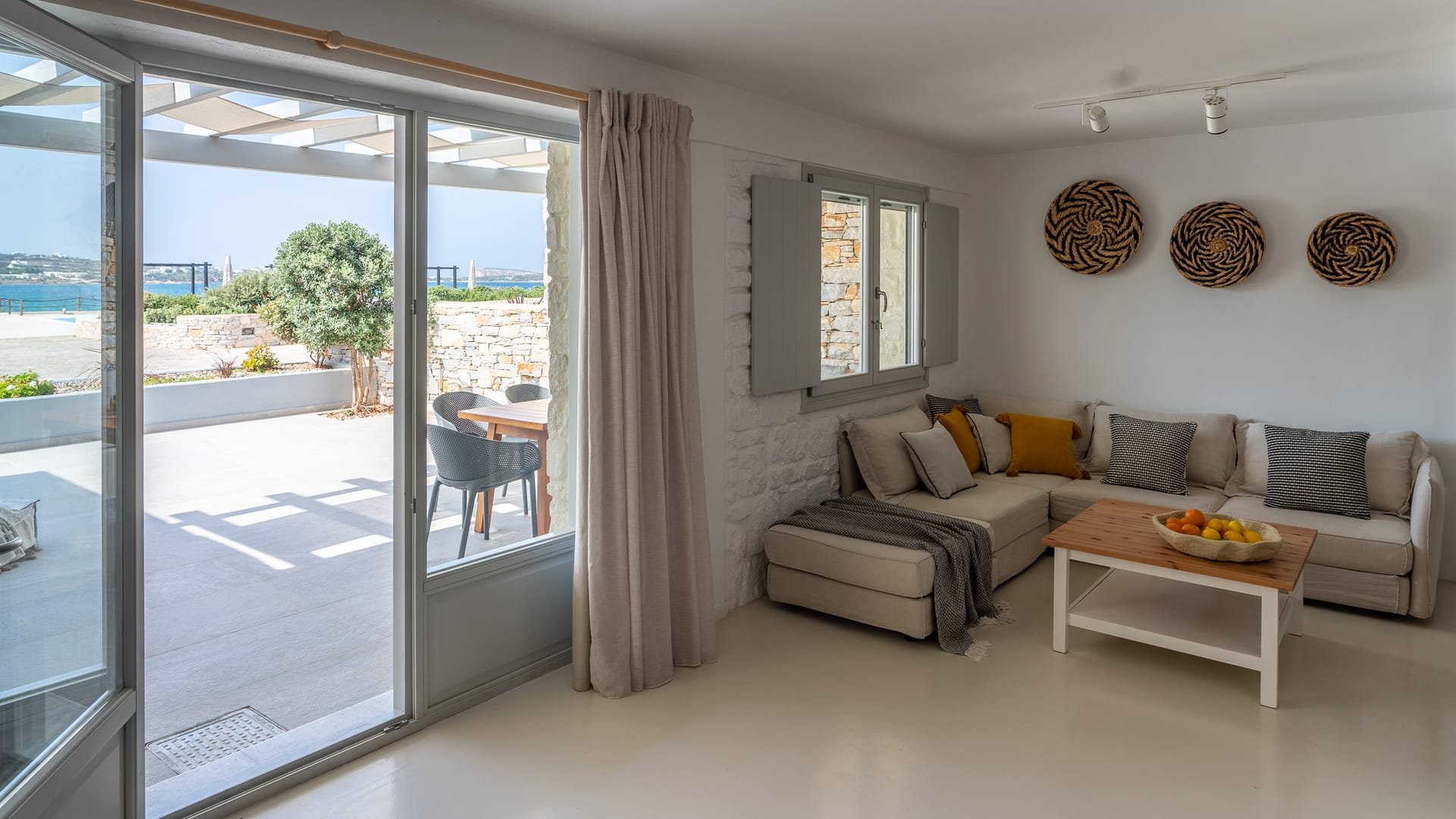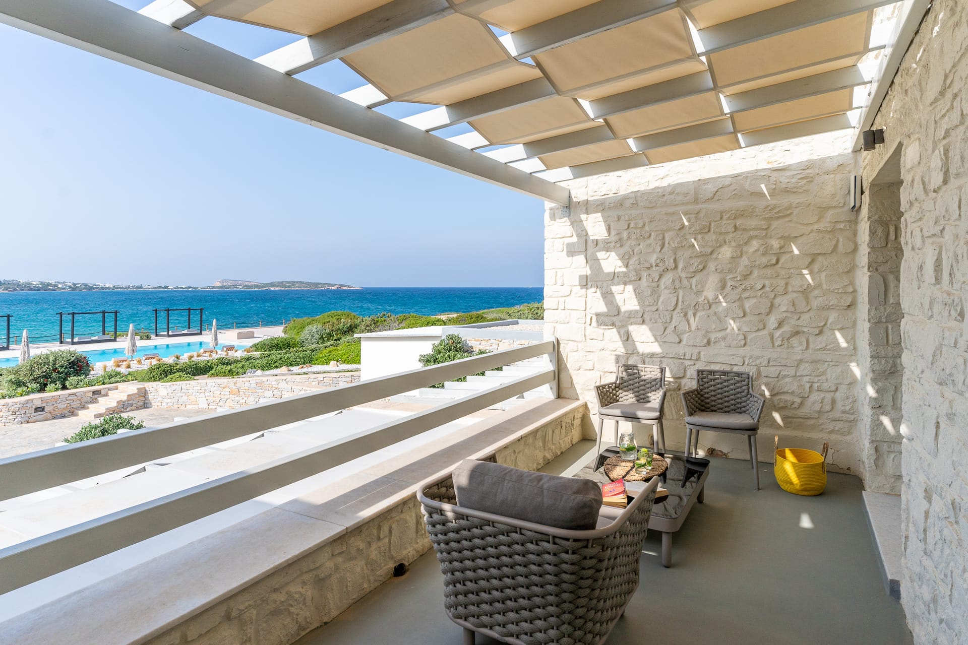 The Superior Villa (130sq.m.) unfolds on two floors with elegant interiors that radiate warmth and finesse and are decorated with charming little details that make a big difference. This delightful villa is perfect for seven persons offering two snug bedrooms with en-suite bathrooms on the first floor and another cozy bedroom with an en-suite bathroom at ground level. There on the first floor, the villa also features an open-plan fully-equipped kitchen with a dining table and a stylish living space with cushy sofas. Lay back, unwind, and marvel at the views of the Aegean Sea and Santa Maria area from the first floor’s balcony and the charming veranda at the ground floor of the villa, which also has direct access to the scintillating, turquoise pool.