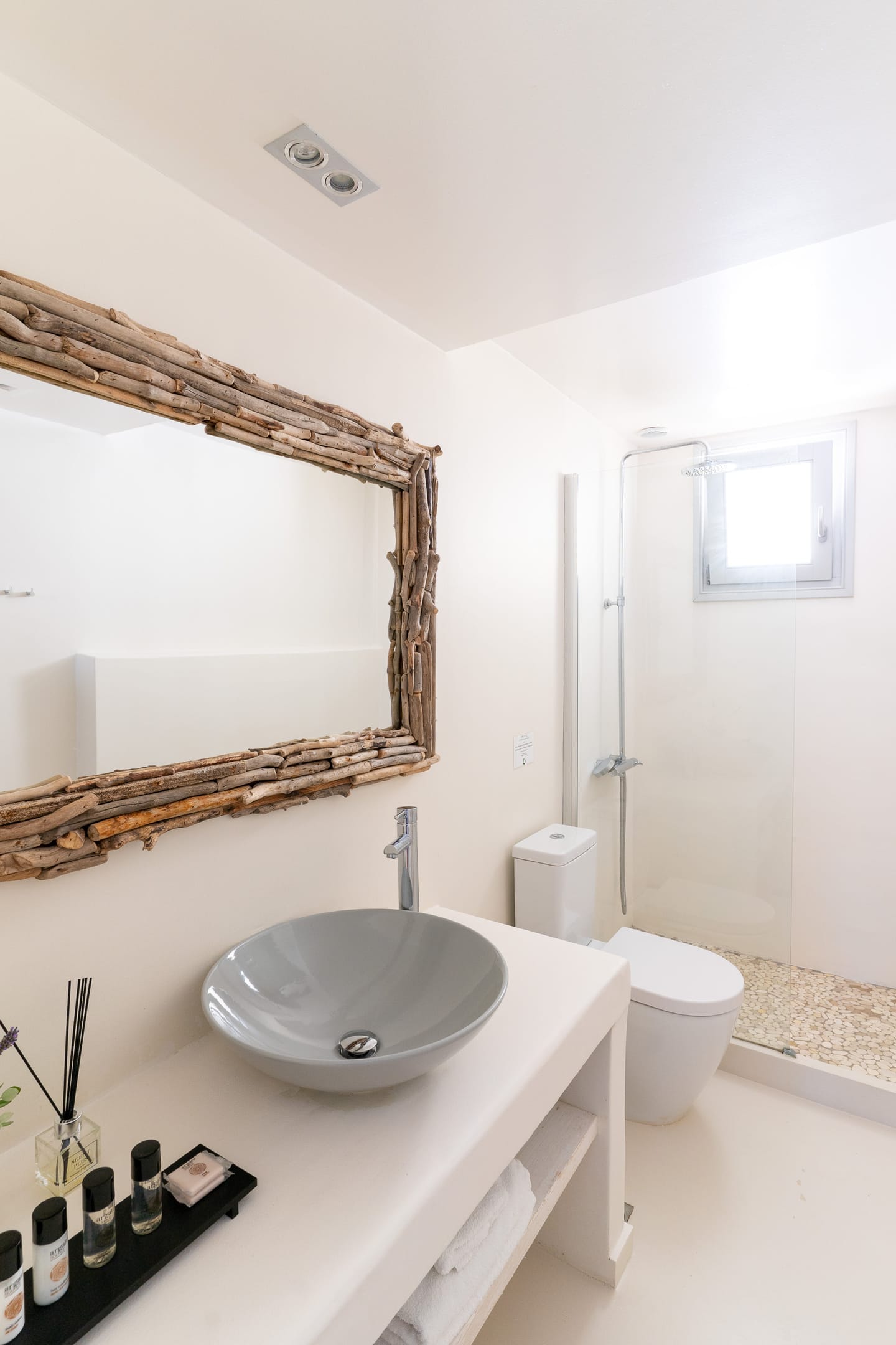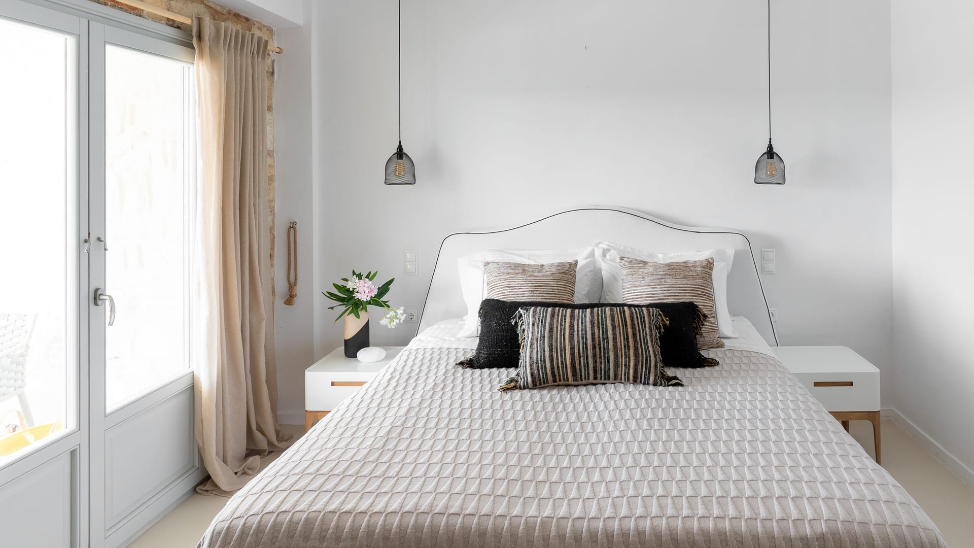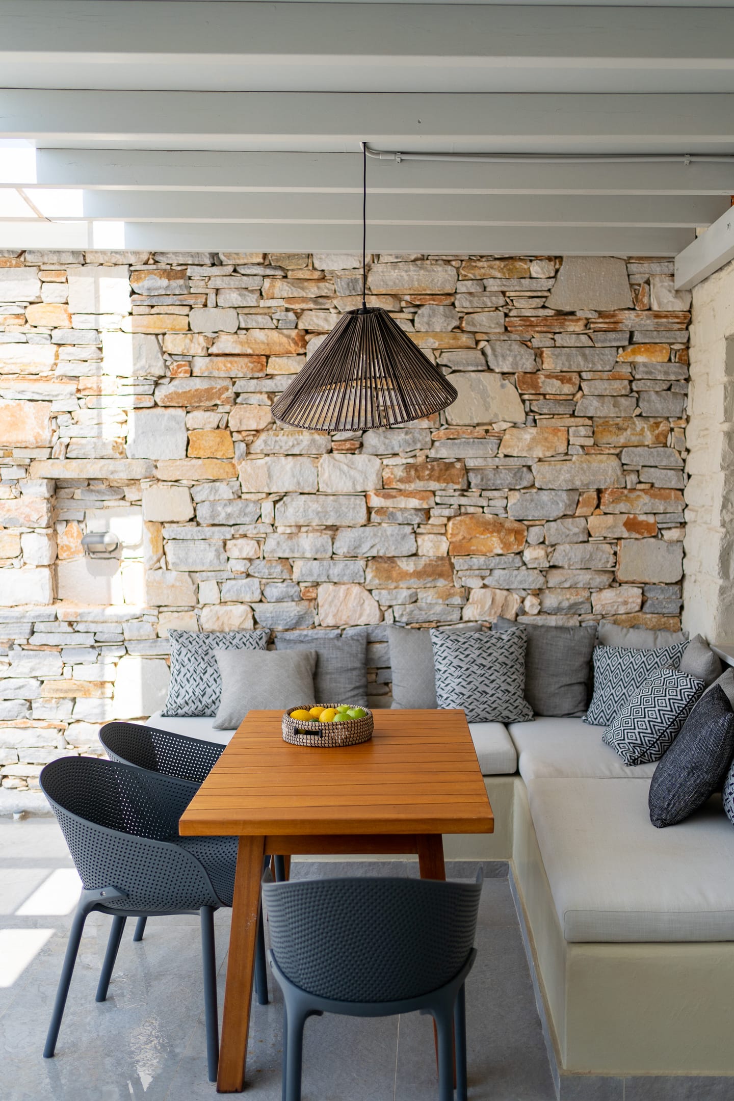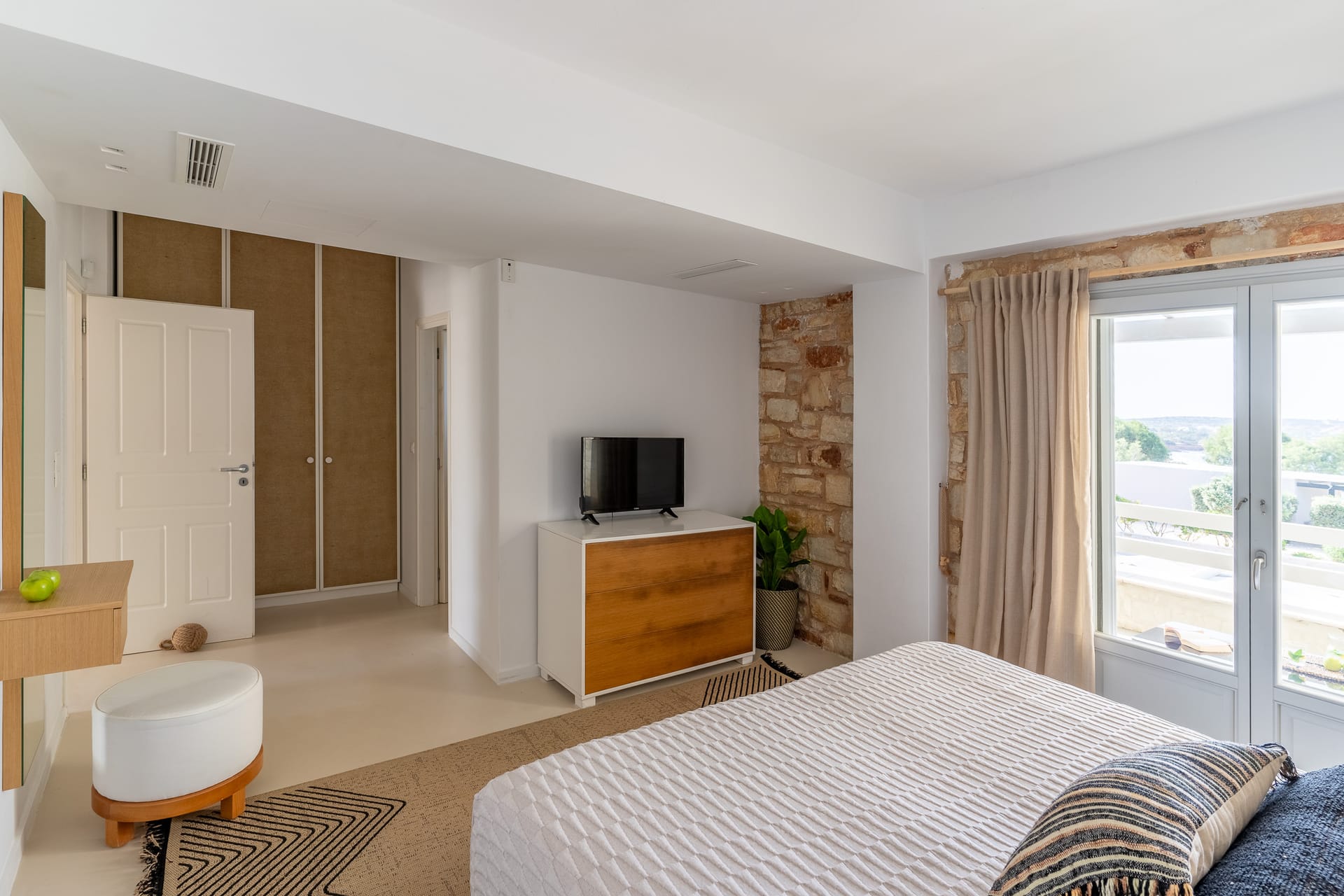 The Superior Villa (130sq.m.) unfolds on two floors with elegant interiors that radiate warmth and finesse and are decorated with charming little details that make a big difference. This delightful villa is perfect for seven persons offering two snug bedrooms with en-suite bathrooms on the first floor and another cozy bedroom with an en-suite bathroom at ground level. There on the first floor, the villa also features an open-plan fully-equipped kitchen with a dining table and a stylish living space with cushy sofas. Lay back, unwind, and marvel at the views of the Aegean Sea and Santa Maria area from the first floor’s balcony and the charming veranda at the ground floor of the villa, which also has direct access to the scintillating, turquoise pool.