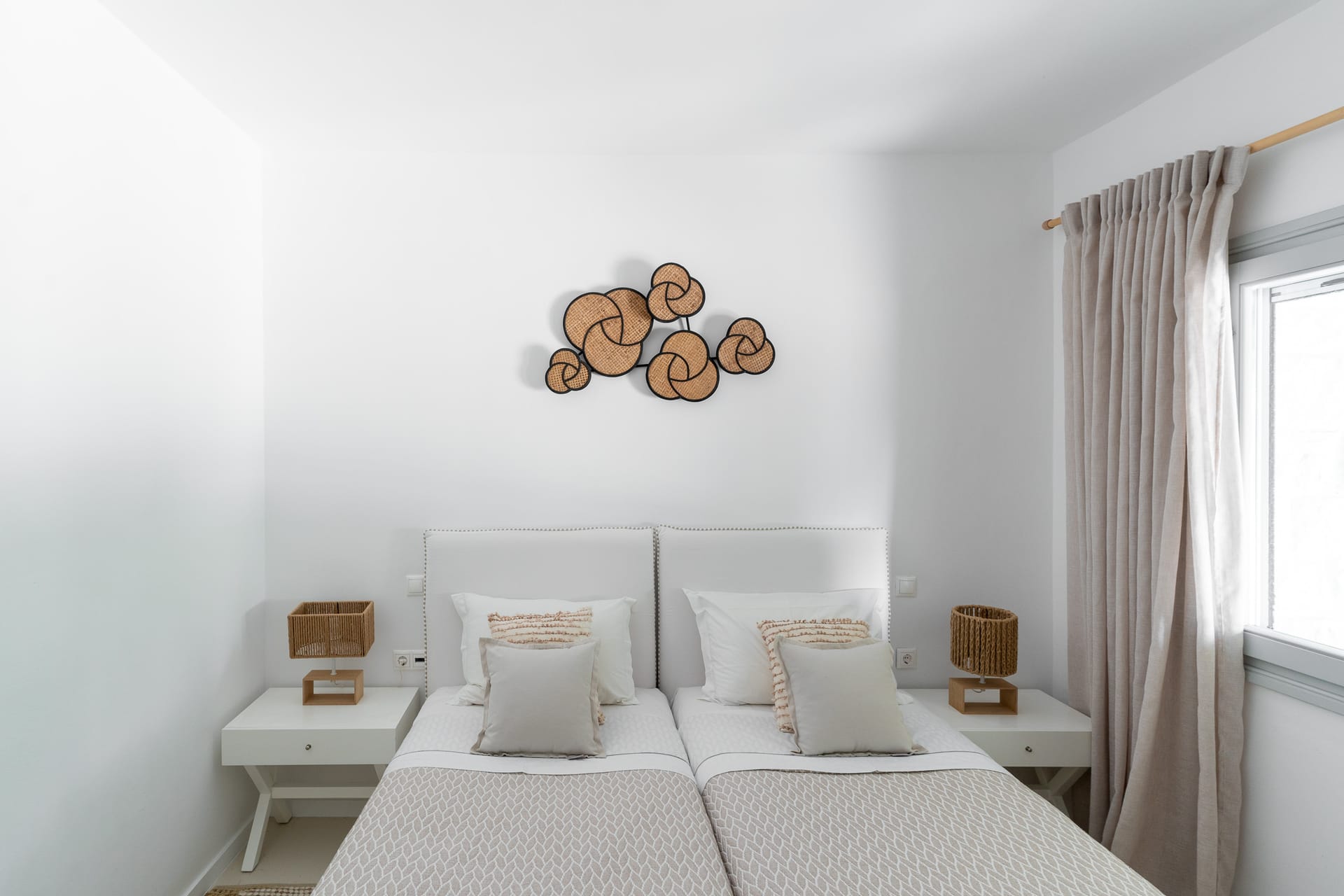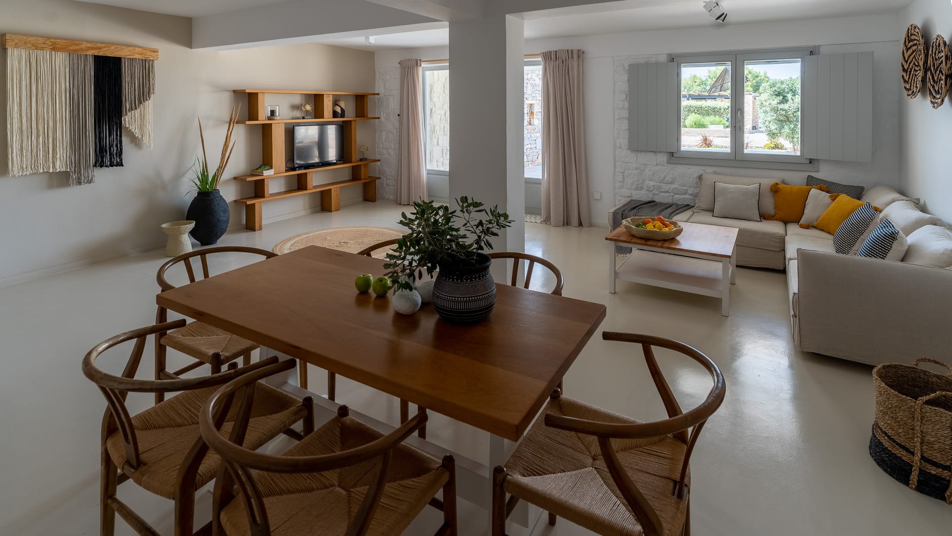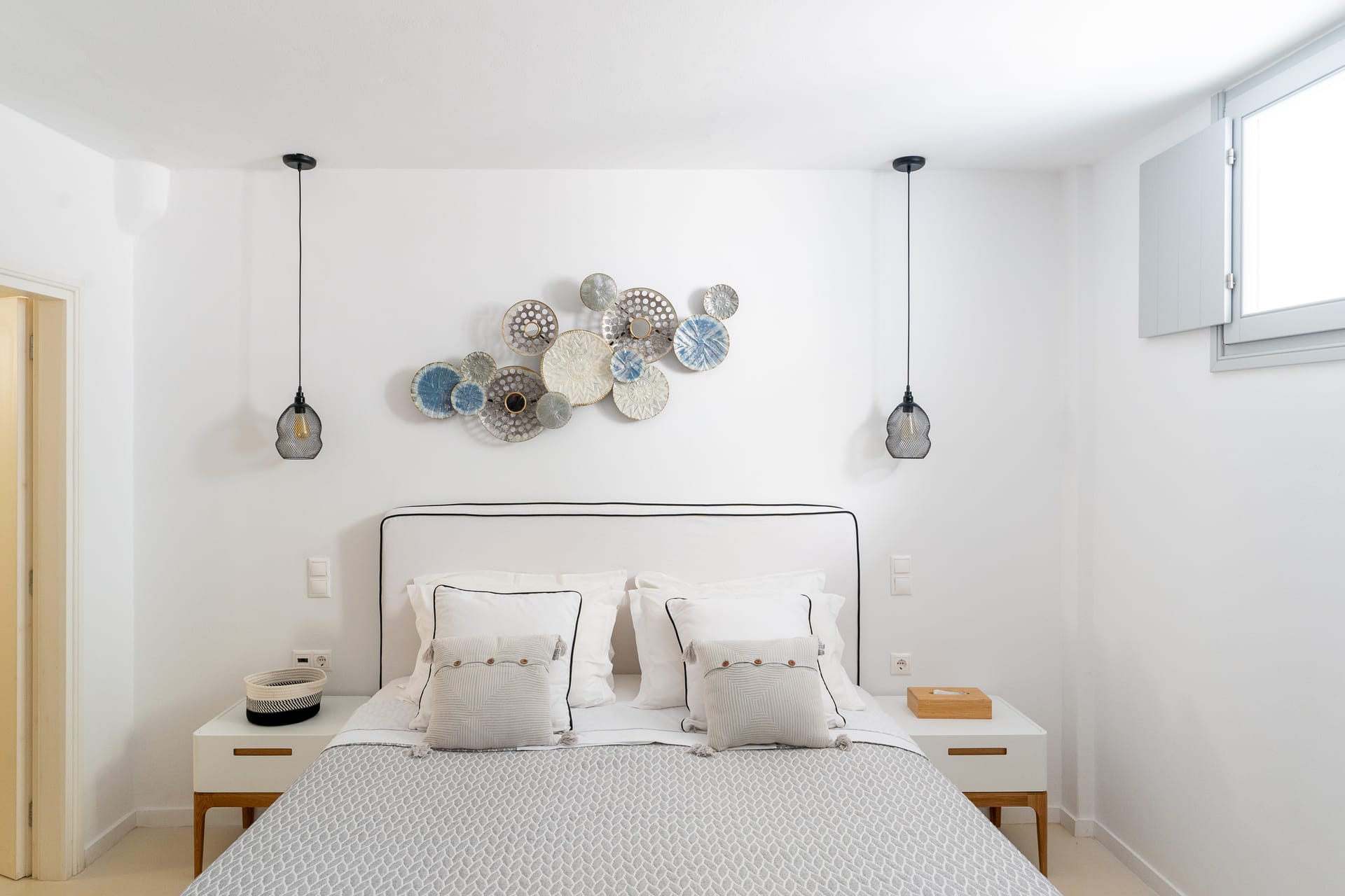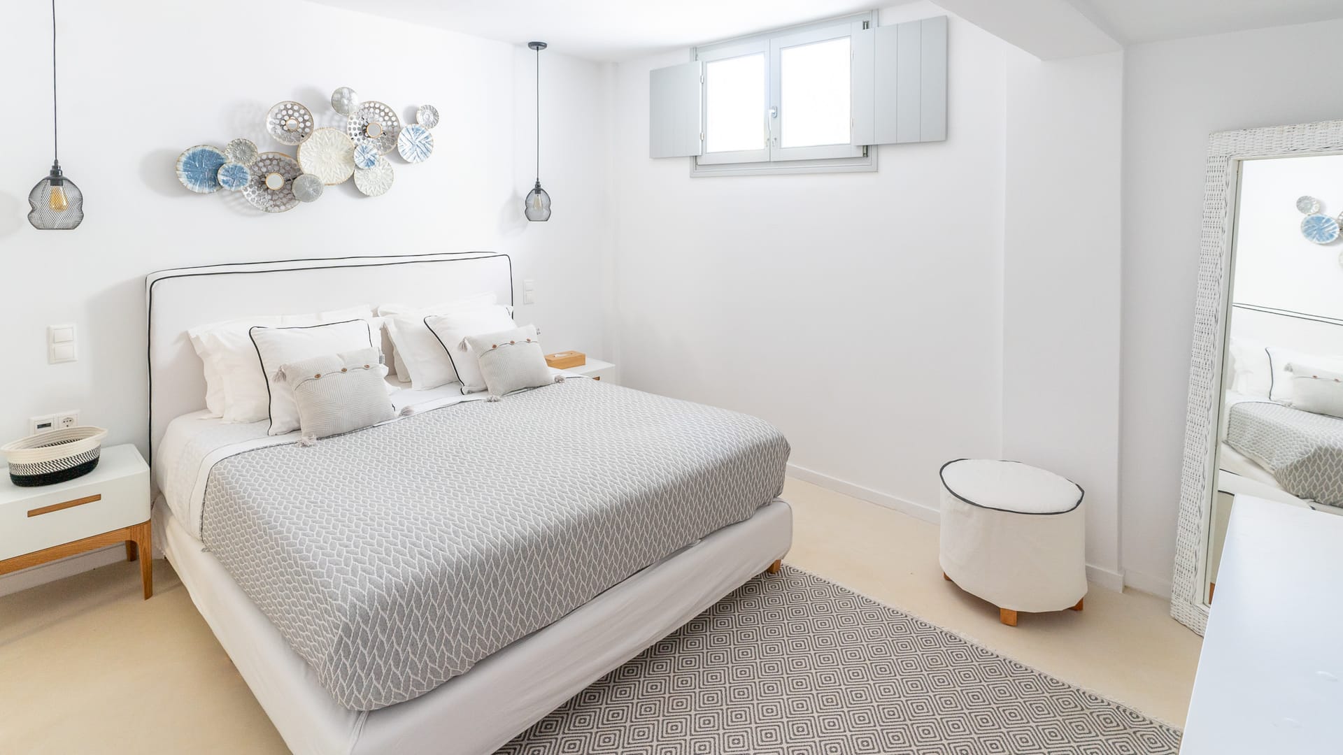 The Superior Villa (130sq.m.) unfolds on two floors with elegant interiors that radiate warmth and finesse and are decorated with charming little details that make a big difference. This delightful villa is perfect for seven persons offering two snug bedrooms with en-suite bathrooms on the first floor and another cozy bedroom with an en-suite bathroom at ground level. There on the first floor, the villa also features an open-plan fully-equipped kitchen with a dining table and a stylish living space with cushy sofas. Lay back, unwind, and marvel at the views of the Aegean Sea and Santa Maria area from the first floor’s balcony and the charming veranda at the ground floor of the villa, which also has direct access to the scintillating, turquoise pool.