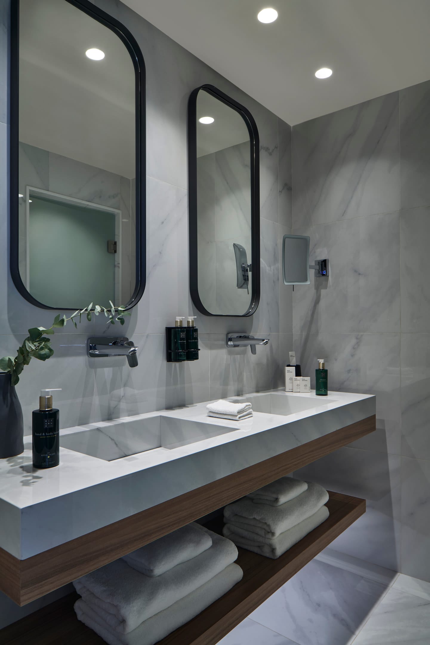 A chic design of new spacious and superb Smart rooms with a relaxing atmosphere. Location : 1st , 2nd floor, View: Side Sea View ,Space : 35 m2, Layout: Open Plan, Beds: 1 Double Bed + 1 Sofa Bed, Bathroom: Modern Style with Double Sinks and Shower