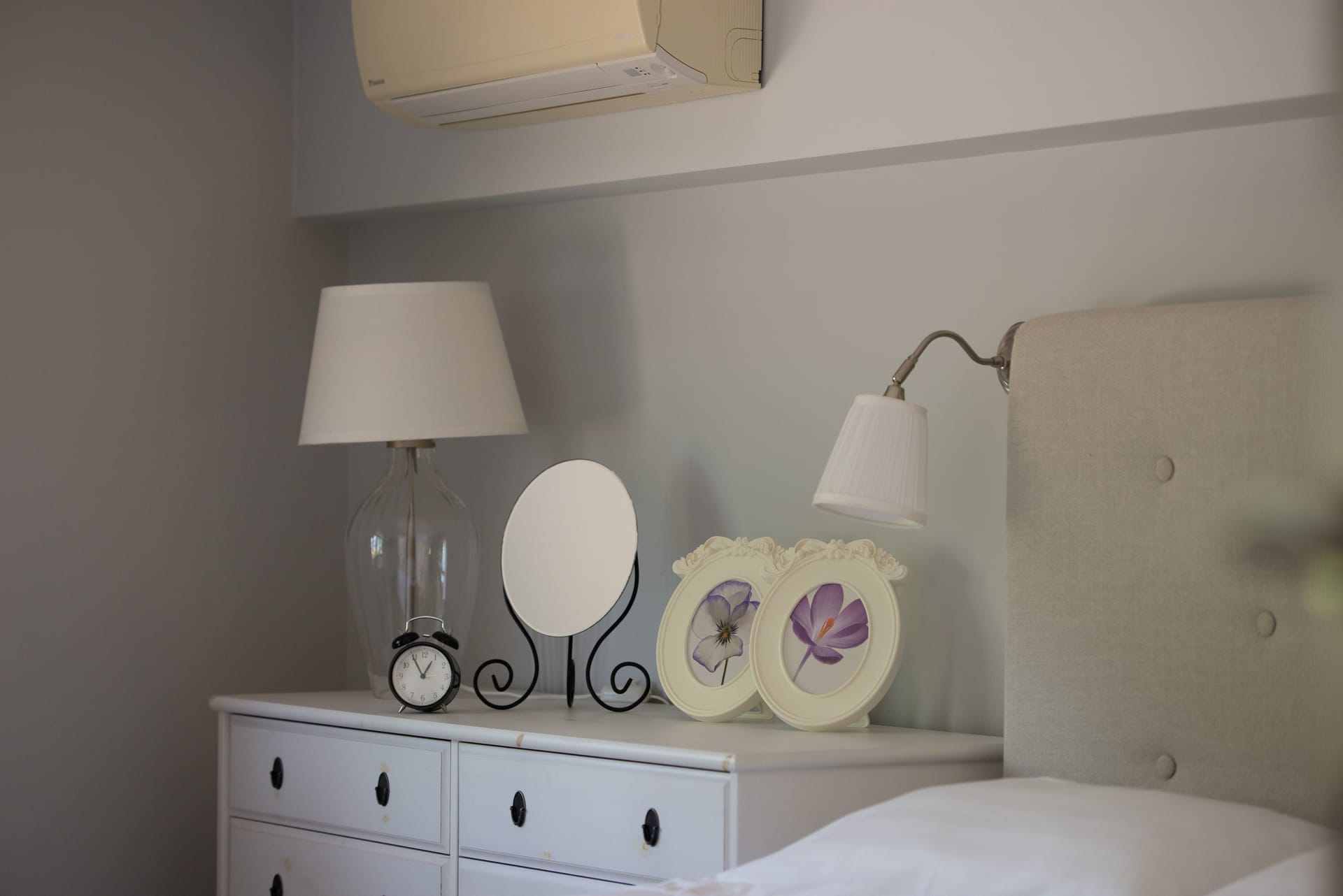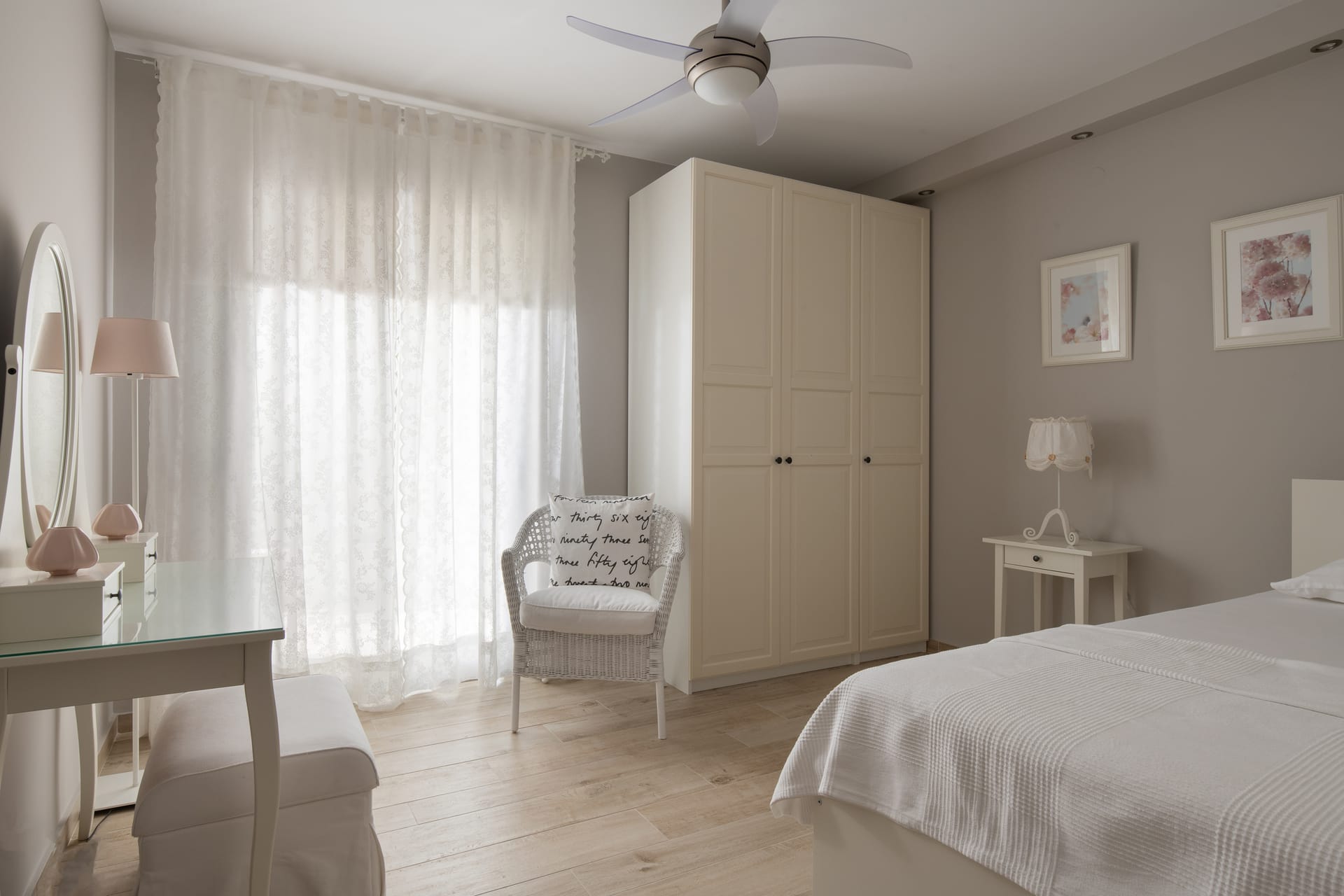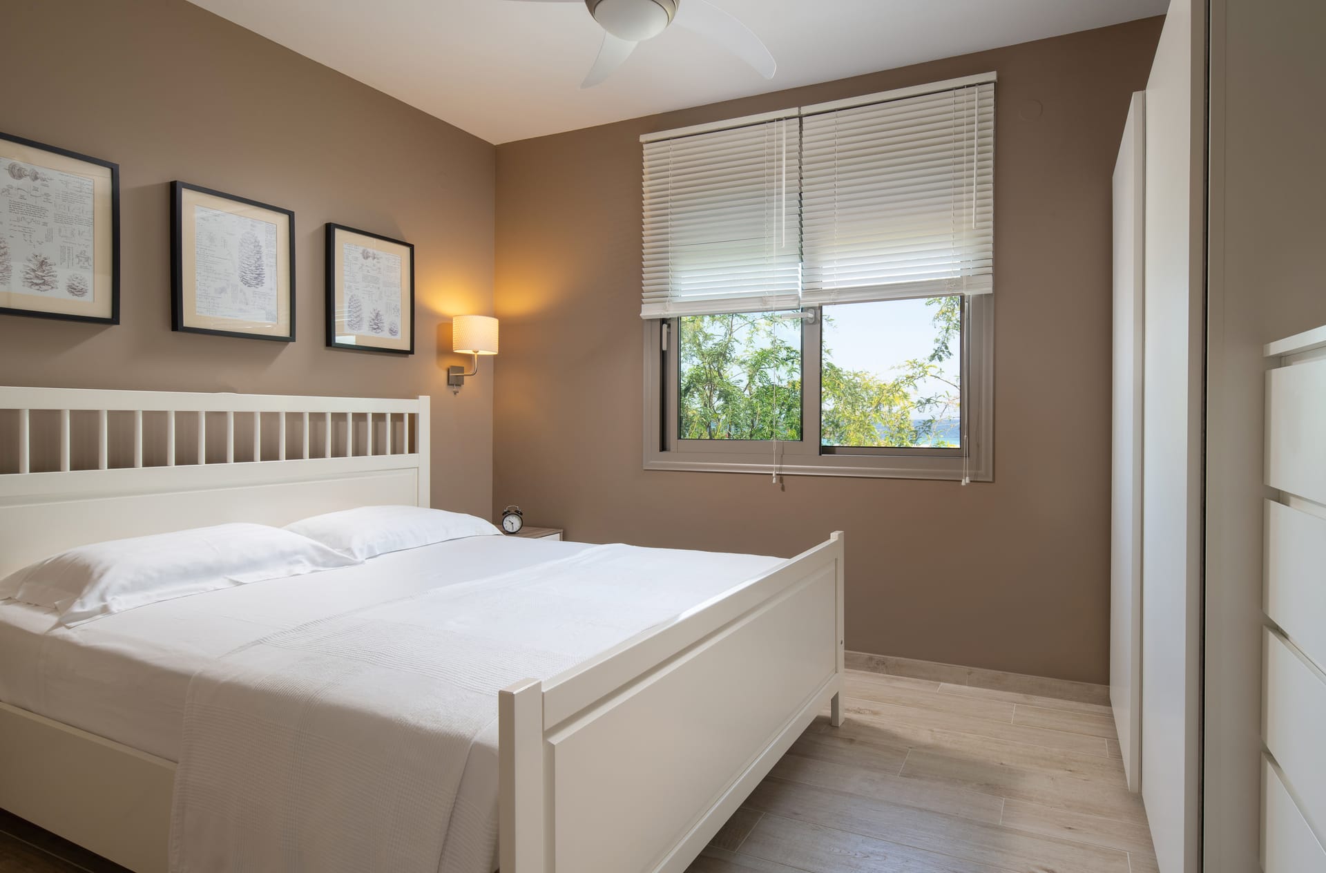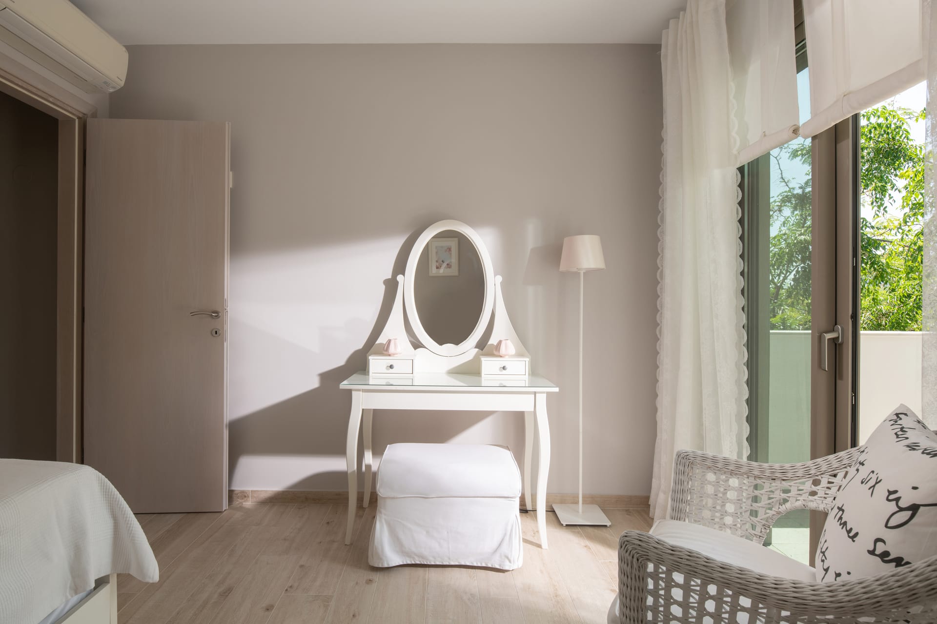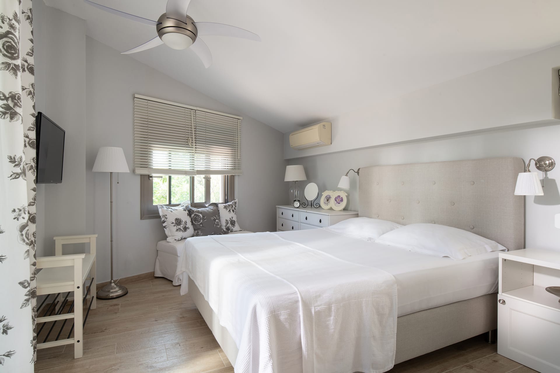 But the list of amenities offered in Ammouda Villas does not end here. Each villa can boost its guest capacity by 2 persons (6+2). Next to the main entrance of each villa there is a guest room available, a small studio which features its own separate entrance, a double bed and bathroom, and all the amenities such as: flat screen TV, air-condition, ceiling fan, refrigerator and equipment for coffee. The Guest room is available with an extra charge.