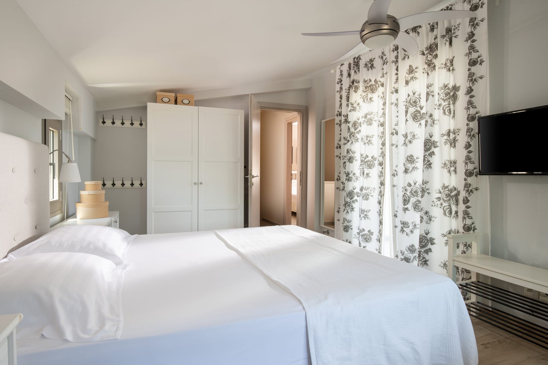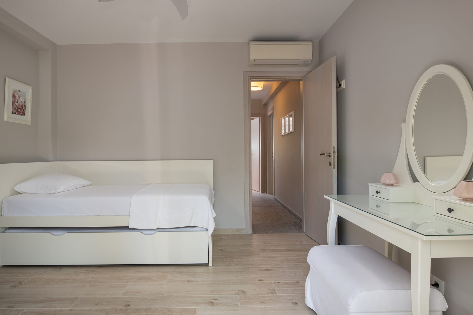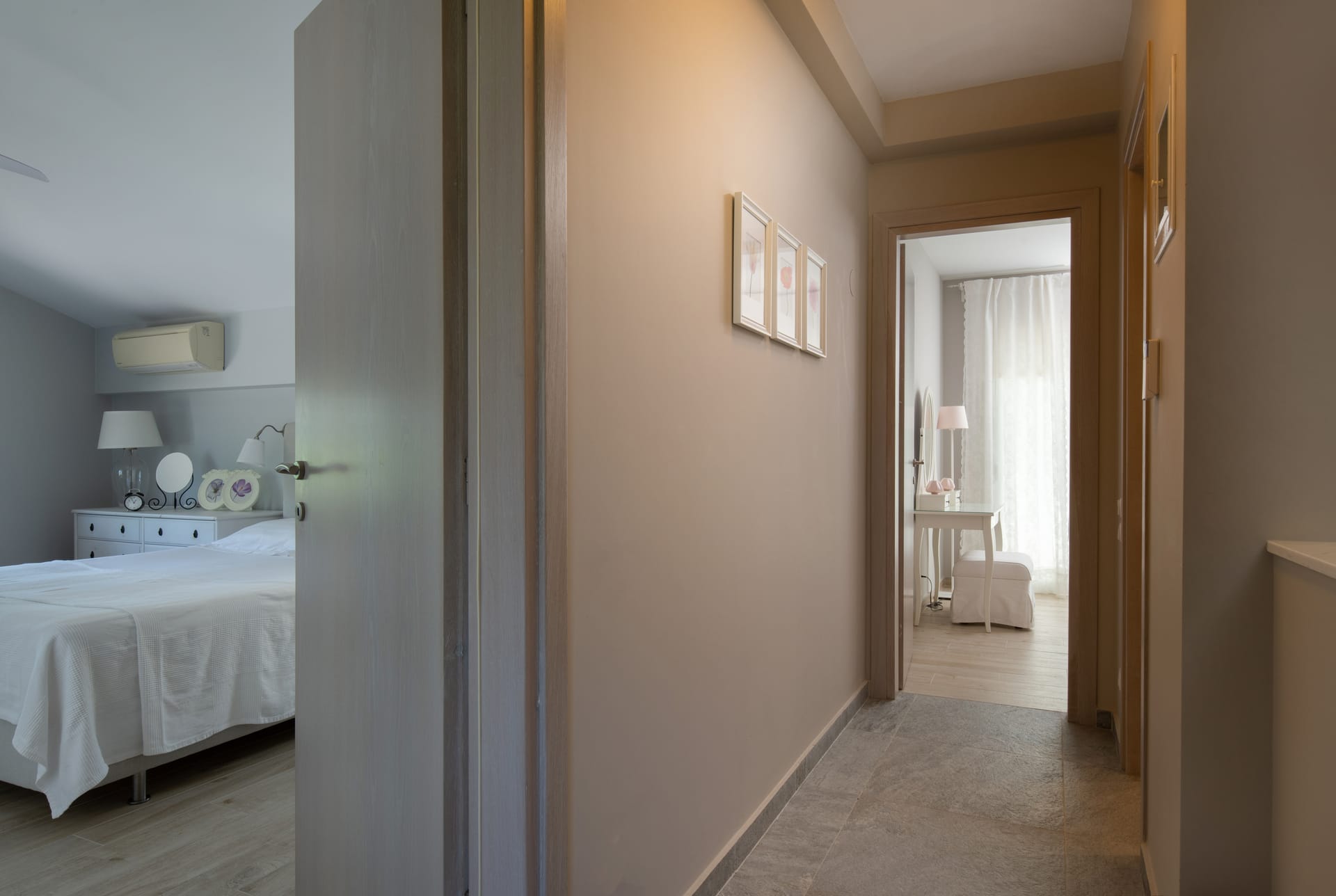 Each of the 5 villas features its own personality, but they all offer the same infrastructures and amenities: on the ground level, there is a single spacious living room, featuring the dinning table and the fully equipped modern kitchen, which also comes with a dishwasher. This level also features a WC. In the 1st floor there are the bedrooms and a second bigger bathroom which comes with a washing machine. The master bedroom with the king size bed and the other two bedrooms (2 single beds in each) offer a unique view of the Trani Ammouda bay and the evergreen garden of the resort. All villas feature air-condition units, ceiling fans in all rooms and the terrace on the ground floor, flat-screen TV, dvd player, HiFi systems, hair dryer, ventilators, while guests get free wi-fi and free parking for 2 cars per villa.
