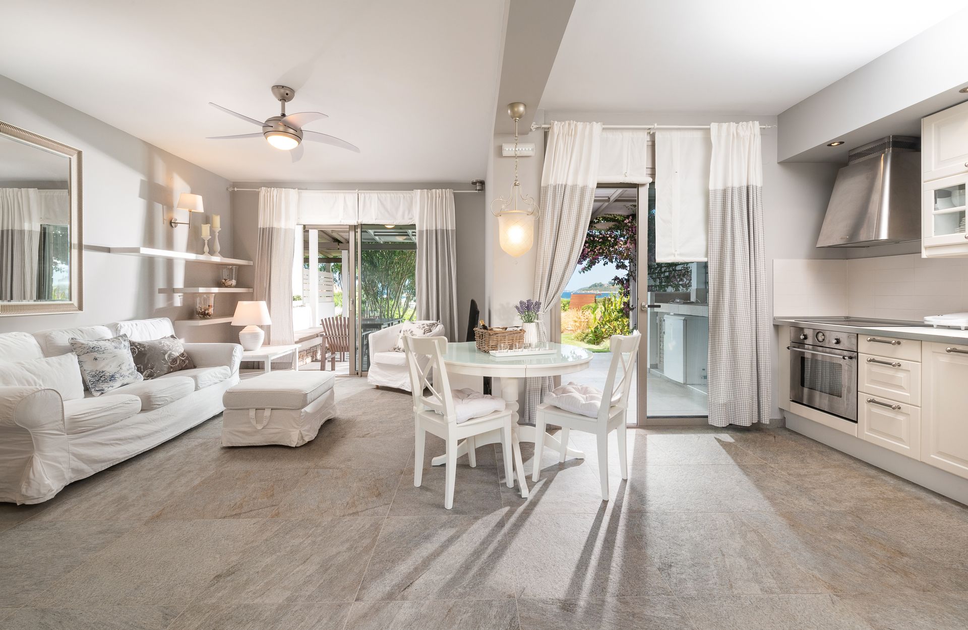 Each of the 5 villas features its own personality, but they all offer the same infrastructures and amenities: on the ground level, there is a single spacious living room, featuring the dinning table and the fully equipped modern kitchen, which also comes with a dishwasher. This level also features a WC. In the 1st floor there are the bedrooms and a second bigger bathroom which comes with a washing machine. The master bedroom with the king size bed and the other two bedrooms (2 single beds in each) offer a unique view of the Trani Ammouda bay and the evergreen garden of the resort. All villas feature air-condition units, ceiling fans in all rooms and the terrace on the ground floor, flat-screen TV, dvd player, HiFi systems, hair dryer, ventilators, while guests get free wi-fi and free parking for 2 cars per villa.