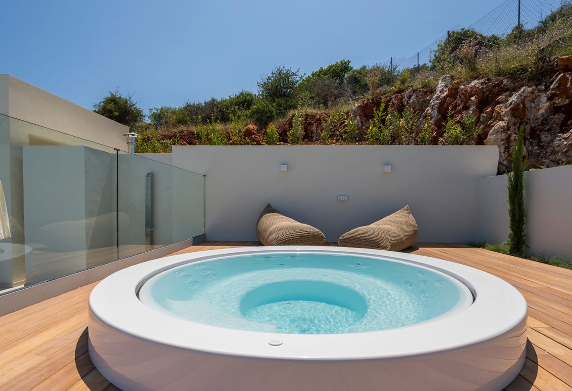 Each of the 5 villas features its own personality, but they all offer the same infrastructures and amenities: on the ground level, there is a single spacious living room, featuring the dinning table and the fully equipped modern kitchen, which also comes with a dishwasher. This level also features a WC. In the 1st floor there are the bedrooms and a second bigger bathroom which comes with a washing machine. The master bedroom with the king size bed and the other two bedrooms (2 single beds in each) offer a unique view of the Trani Ammouda bay and the evergreen garden of the resort. All villas feature air-condition units, ceiling fans in all rooms and the terrace on the ground floor, flat-screen TV, dvd player, HiFi systems, hair dryer, ventilators, while guests get free wi-fi and free parking for 2 cars per villa.