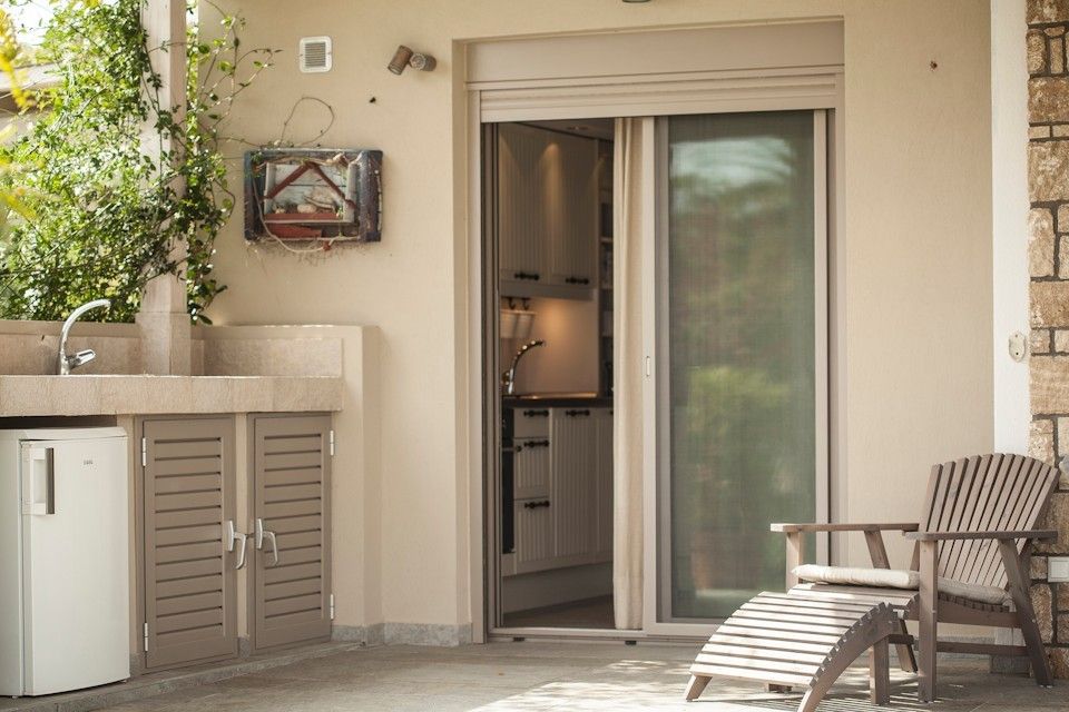 But the list of amenities offered in Ammouda Villas does not end here. Each villa can boost its guest capacity by 2 persons (6+2). Next to the main entrance of each villa there is a guest room available, a small studio which features its own separate entrance, a double bed and bathroom, and all the amenities such as: flat screen TV, air-condition, ceiling fan, refrigerator and equipment for coffee. The Guest room is available with an extra charge.