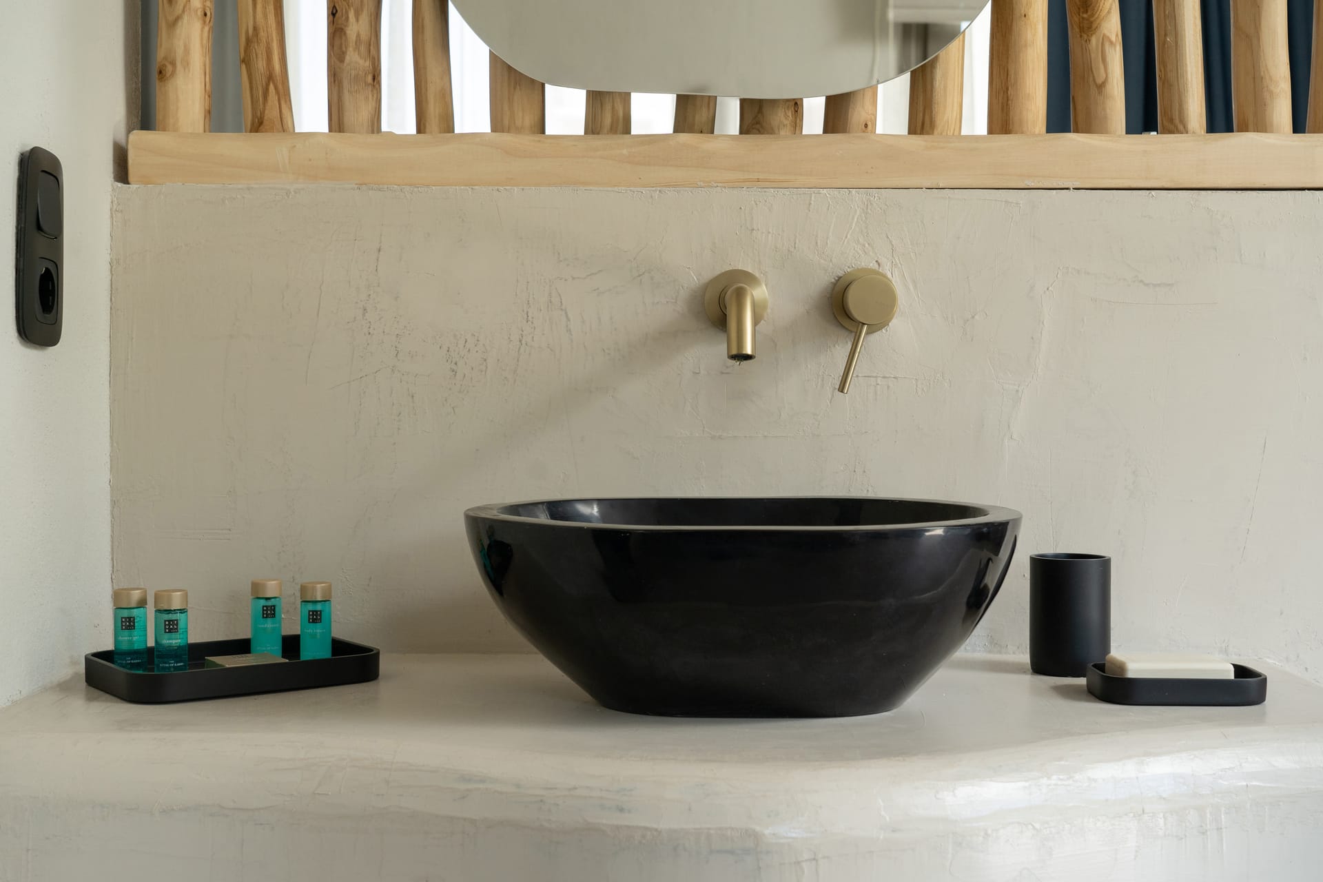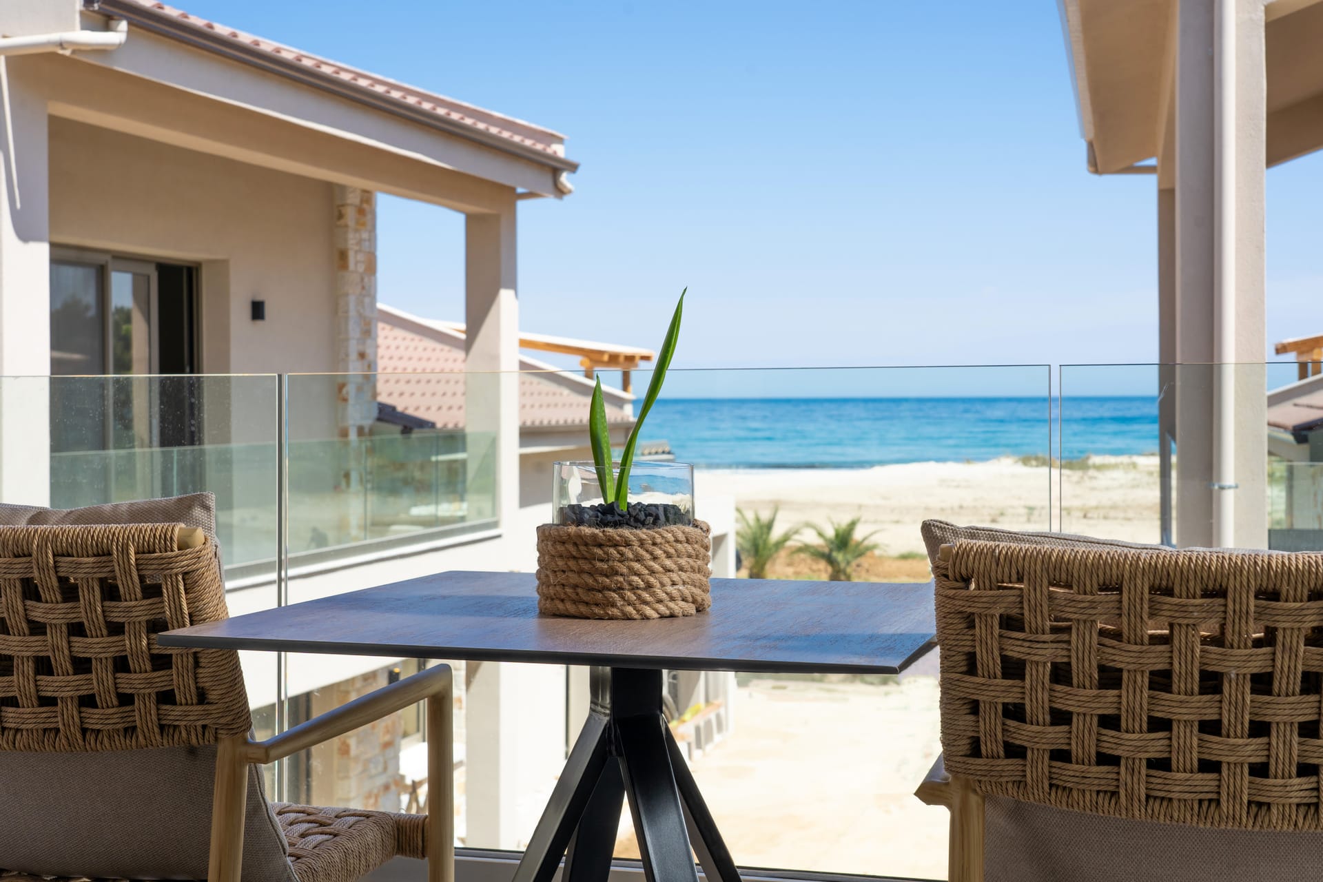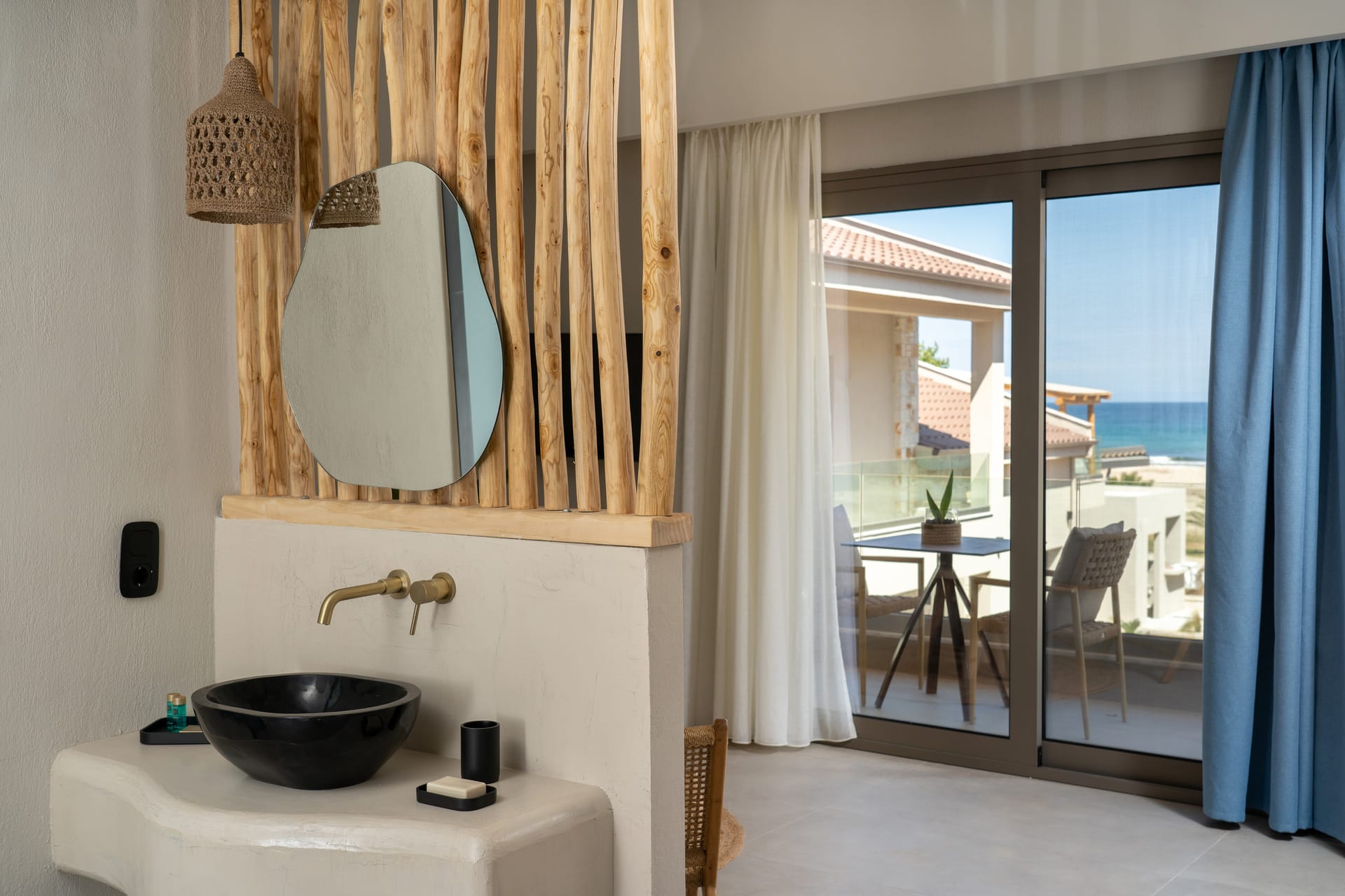 Discover these unique two-storey suites located on the upper floor of the third building, with an area of 44 m2, offering an incomparable view of the sea. The natural beauty of the landscape is perfectly reflected in the earthy colours and boho décor. Each suite with a double bed upstairs, a sofa on the ground floor that converts into two single beds accommodating up to 4 people and private balcony to lounge, relax and treat yourself to the luxury of the dazzling sun, the deep blue sea, the sounds of nature and peaceful landscape.