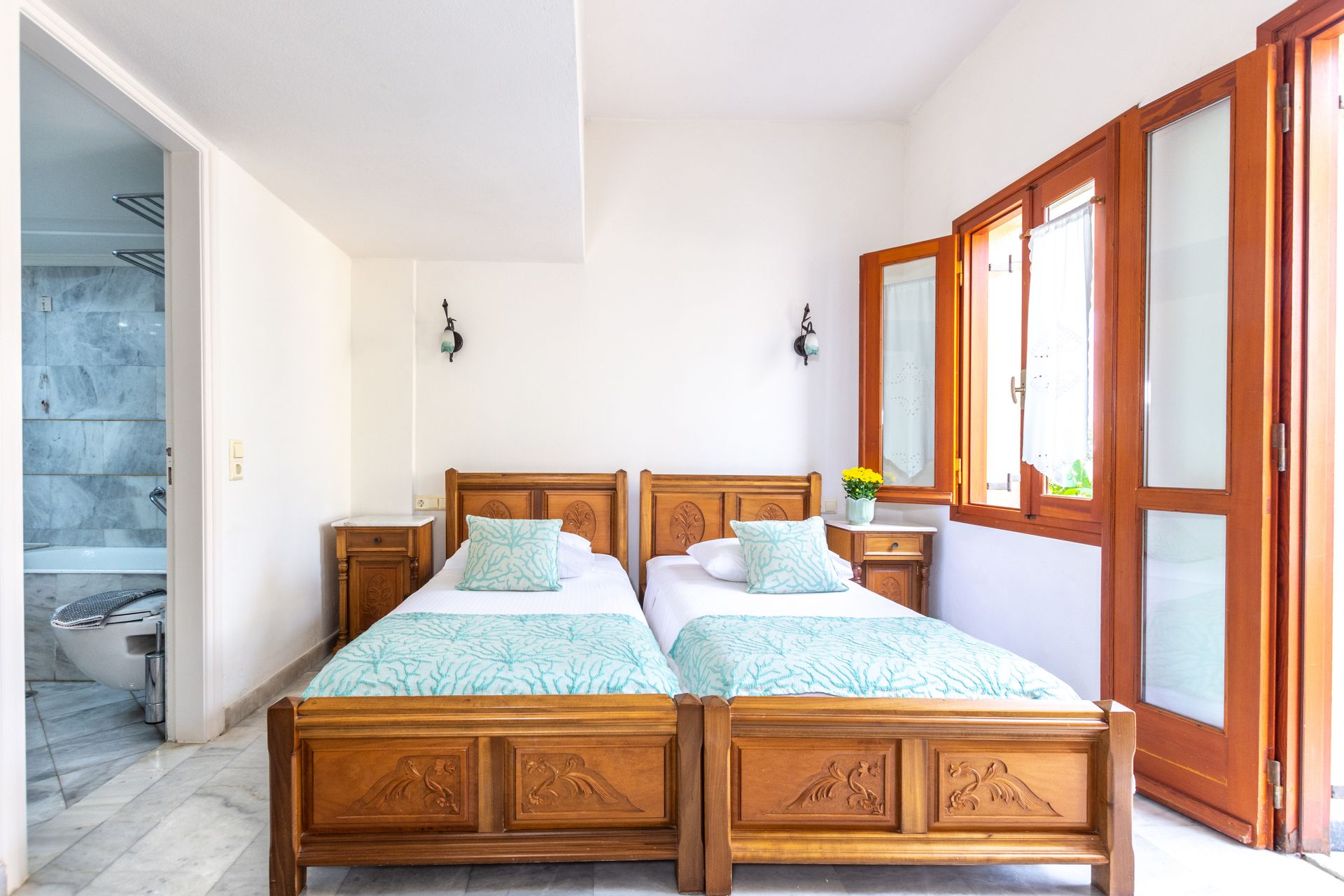 This two storey room type comes with a double bed or twin beds, two marble bathrooms with bathtub and shower, a fully equipped kitchen with electric appliances (Coffee Maker, Toaster, Kettle and Microwave Oven) and a furnished balcony or terrace, with sea view, pool view or garden view.