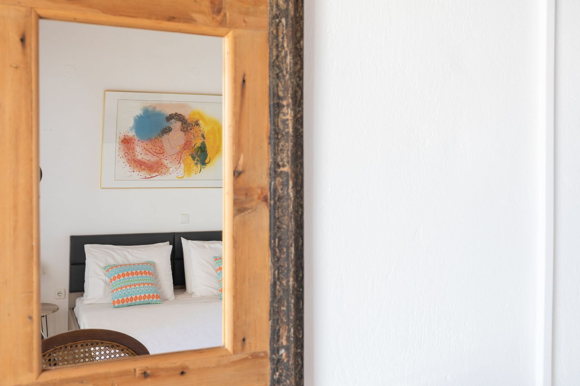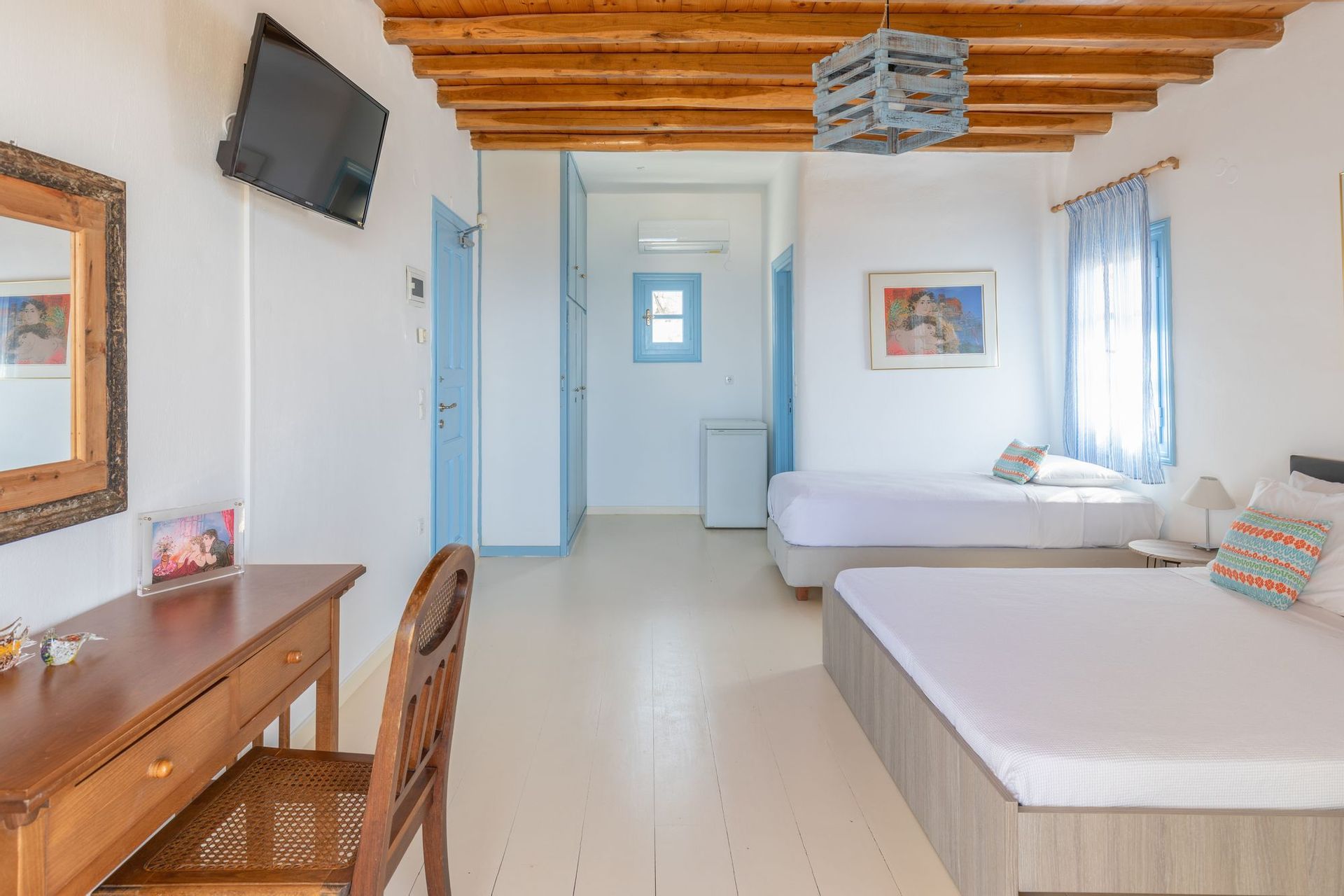 This room, Daphne 8, is a stylish room that accommodates up to three guests, offering a queen-size bed and a single bed. It includes a bathroom with shower and a private balcony with stunning sea view.
