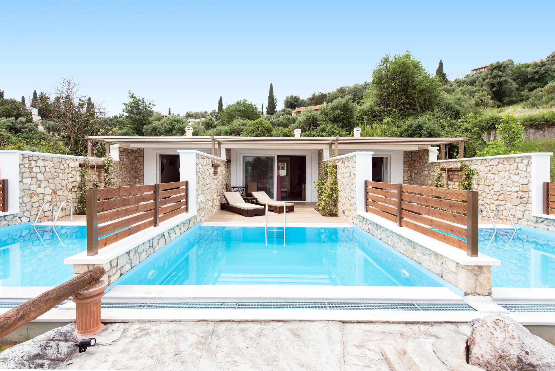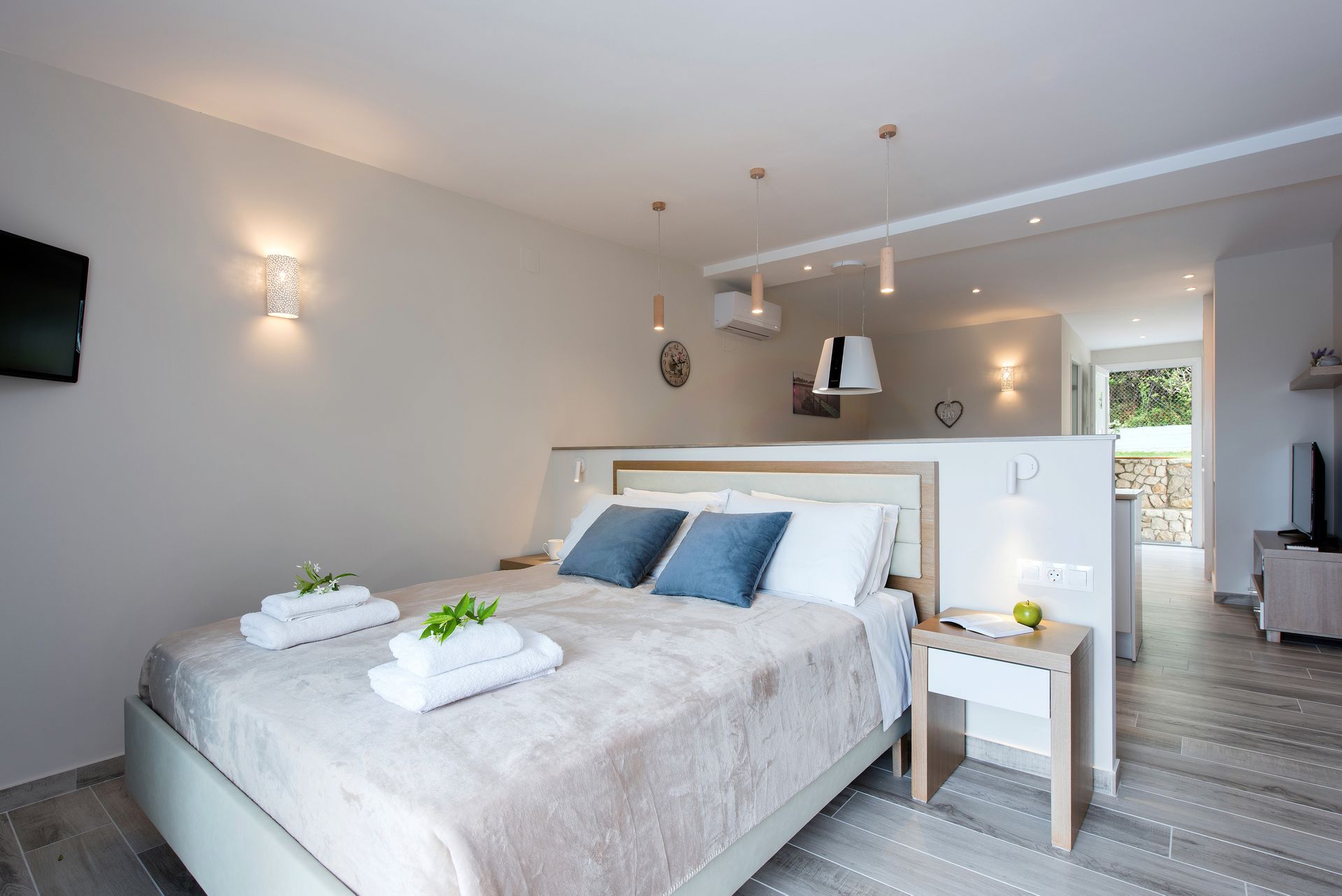Each apartment studio has its own private pool from the front terrace. The studio features a bedroom area with a double bed, an open plan fully equipped kitchen with breakfast bar dining area and lounge. Also a feature fire place and air-condition.