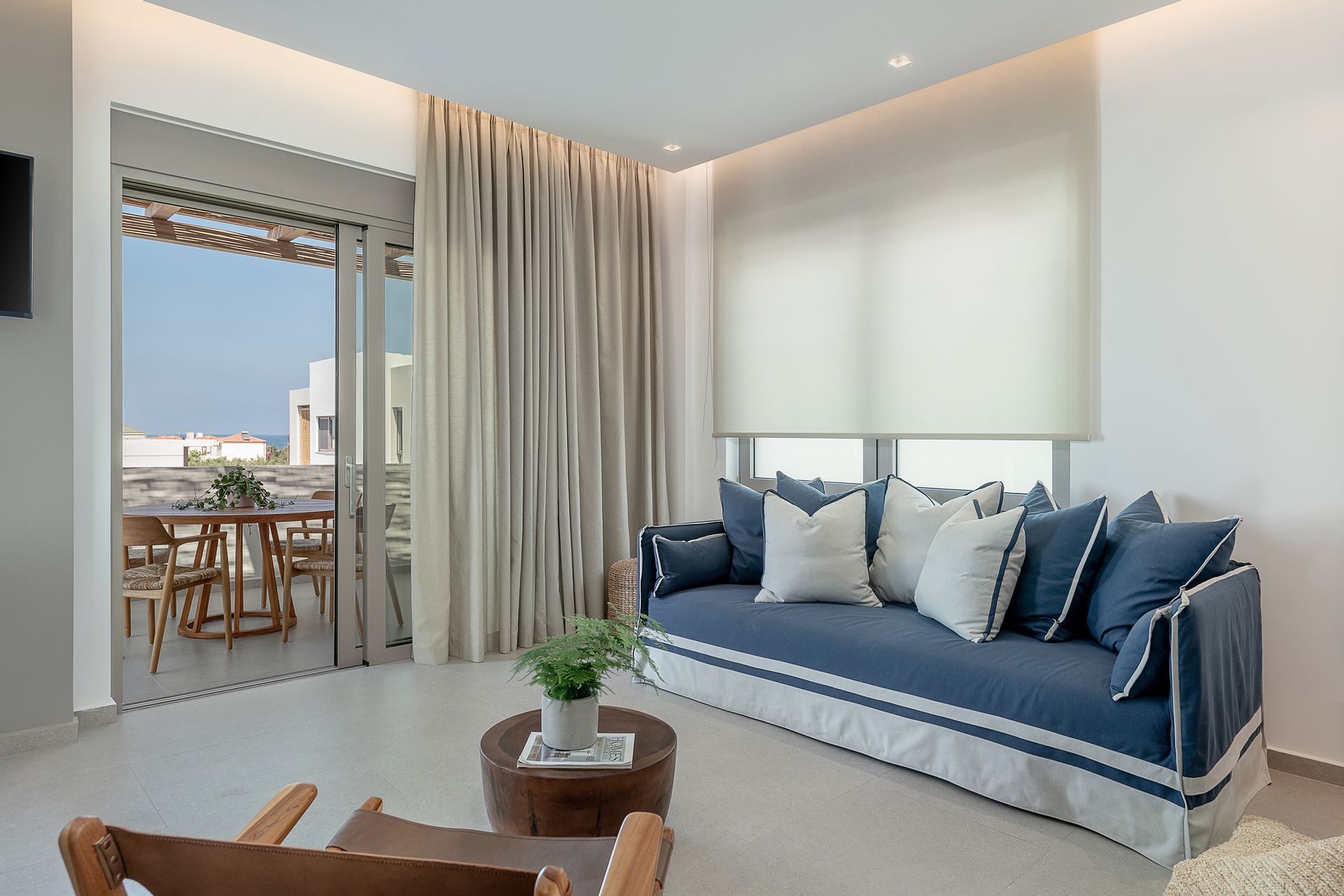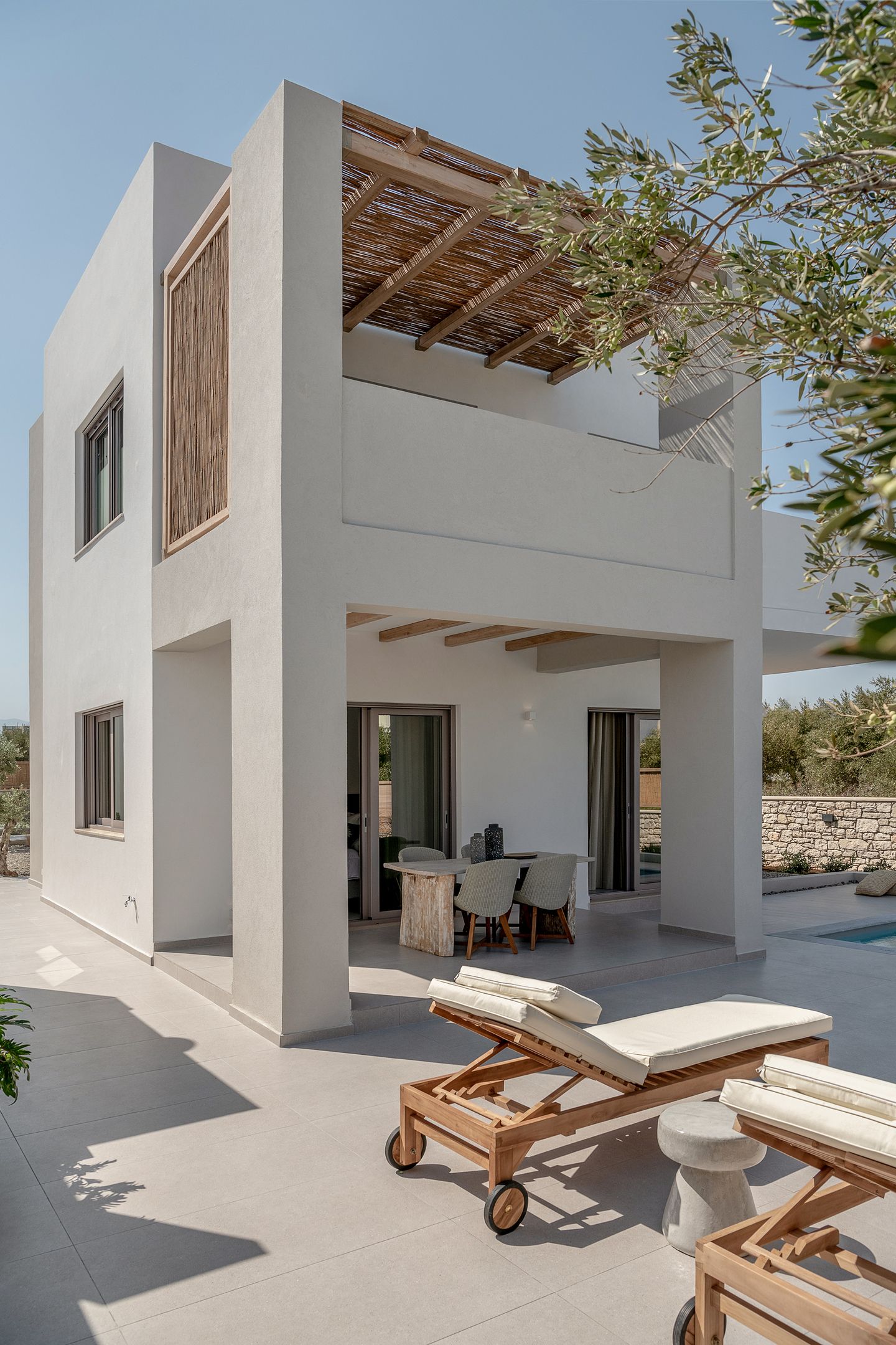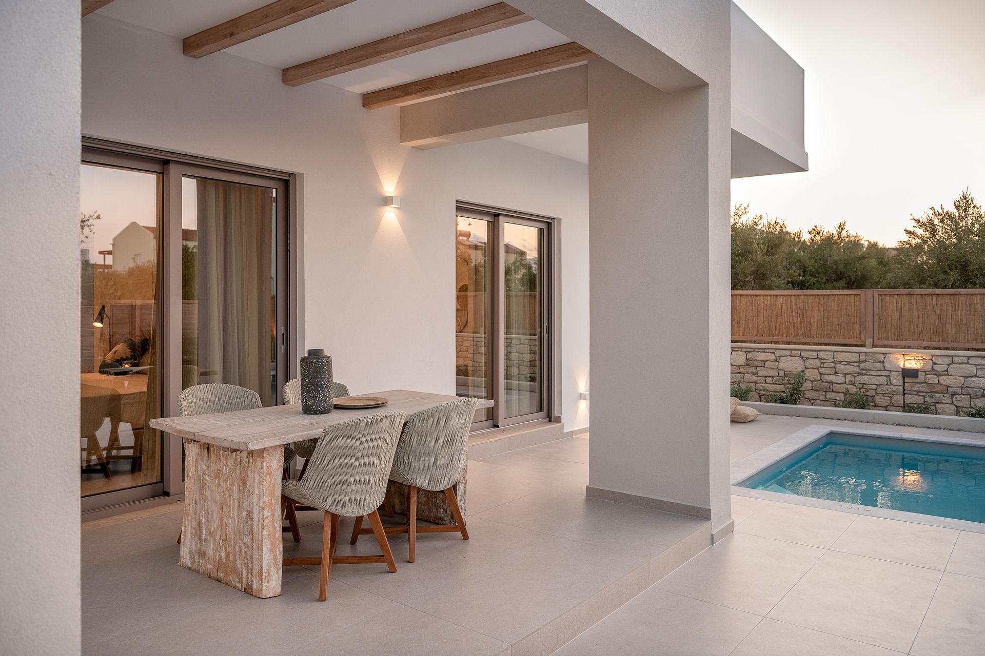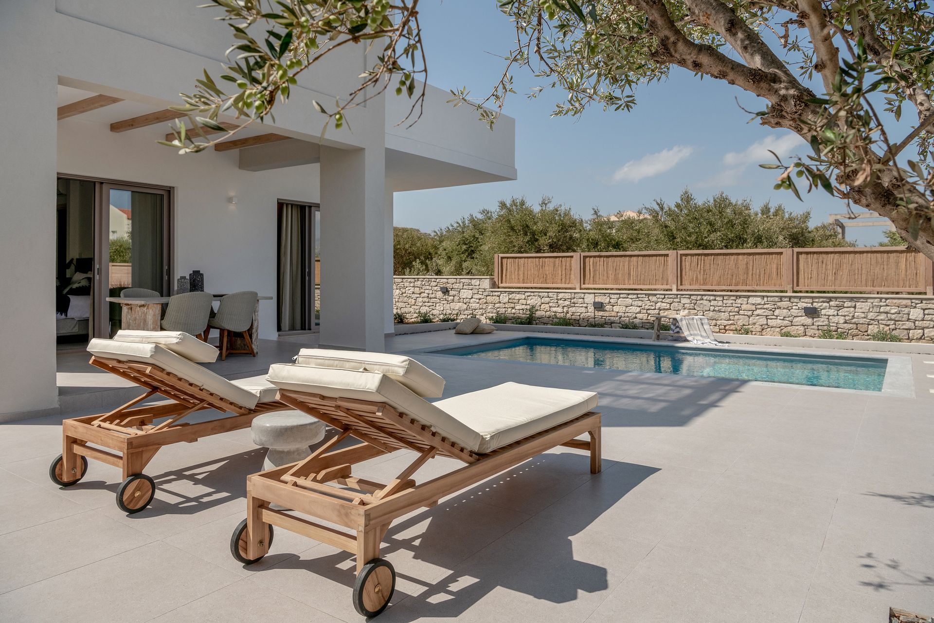 Kritamos Villa measures 100 sq.m and consists of two bedrooms (one with a queen bed and a single bed and the other with two single beds), living room, dining area, fully equipped kitchen, two bathrooms and spacious private veranda with comfortable lounge and dinning area.