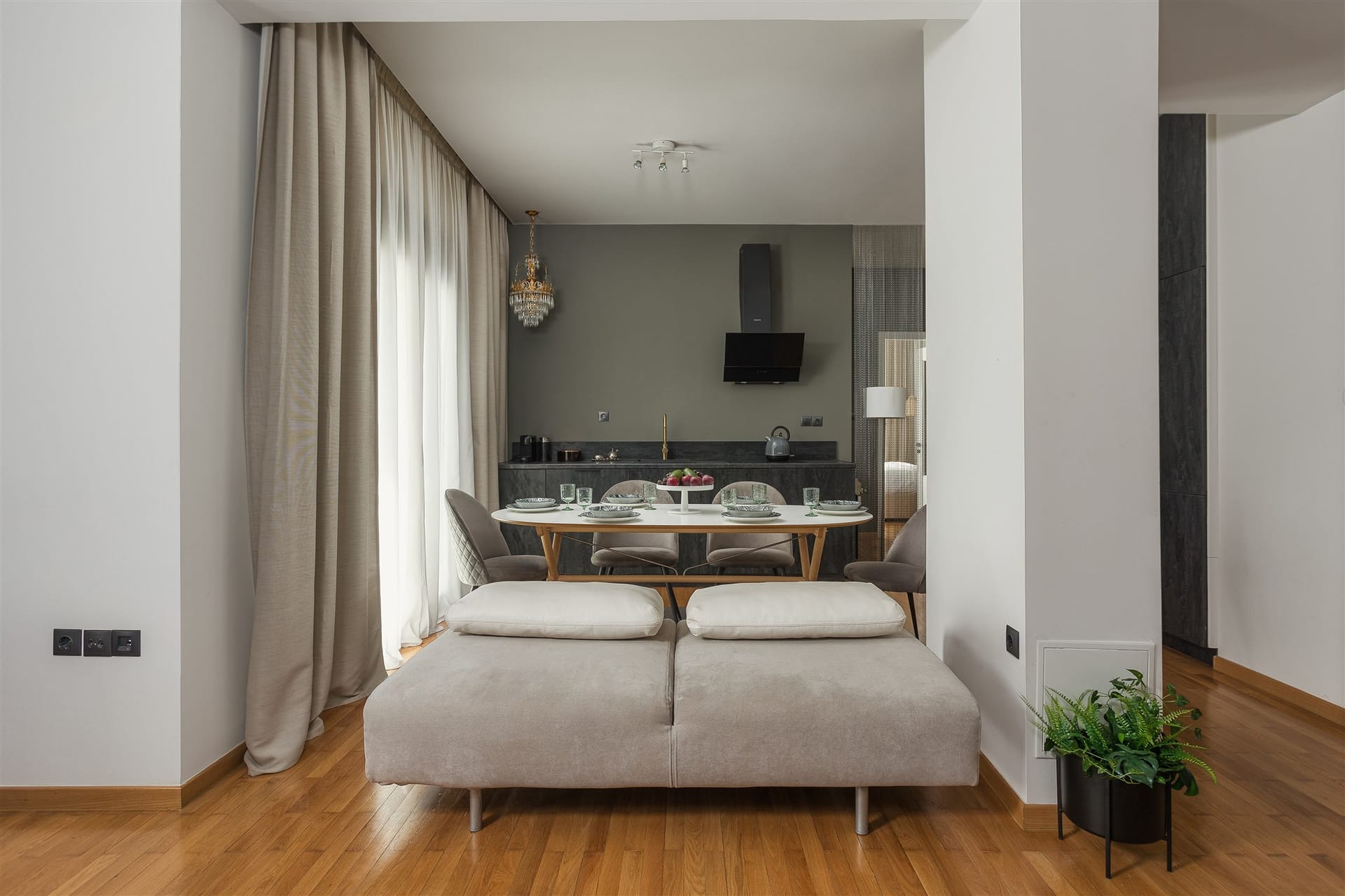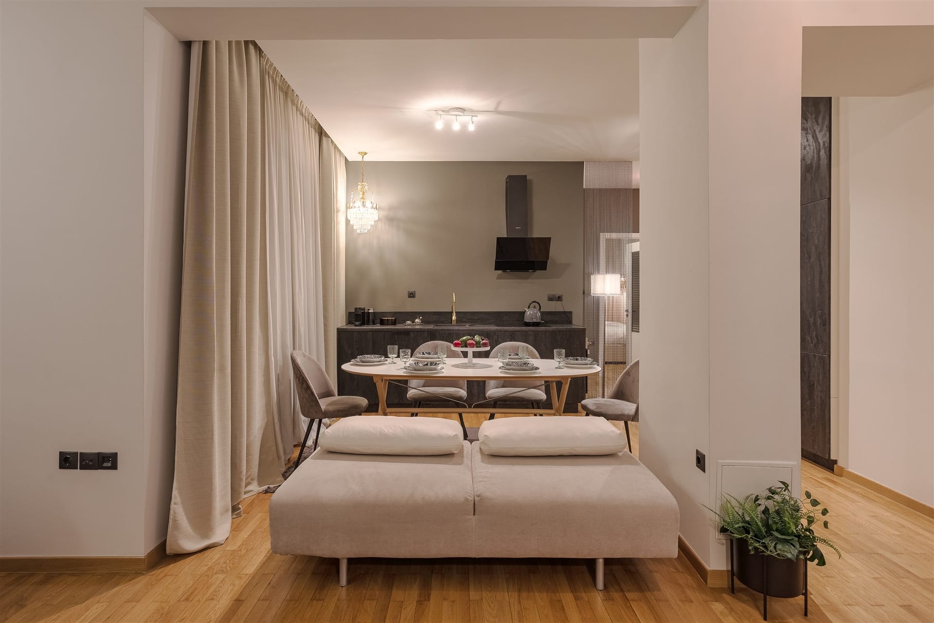 The comfortable and elegant three-bedroom suite offers the perfect space and amenities for up to 6 guests. Experience tranquility in this beautiful apartment that features a modern living room, two bedrooms with a queen size bed and one bedroom with two single beds. Enjoy the convenience of a fully equipped kitchen and 2 bathrooms with showers. The furnished balcony invites you to end the evening with a glass of wine and let the impressions of the day ''sink in''.