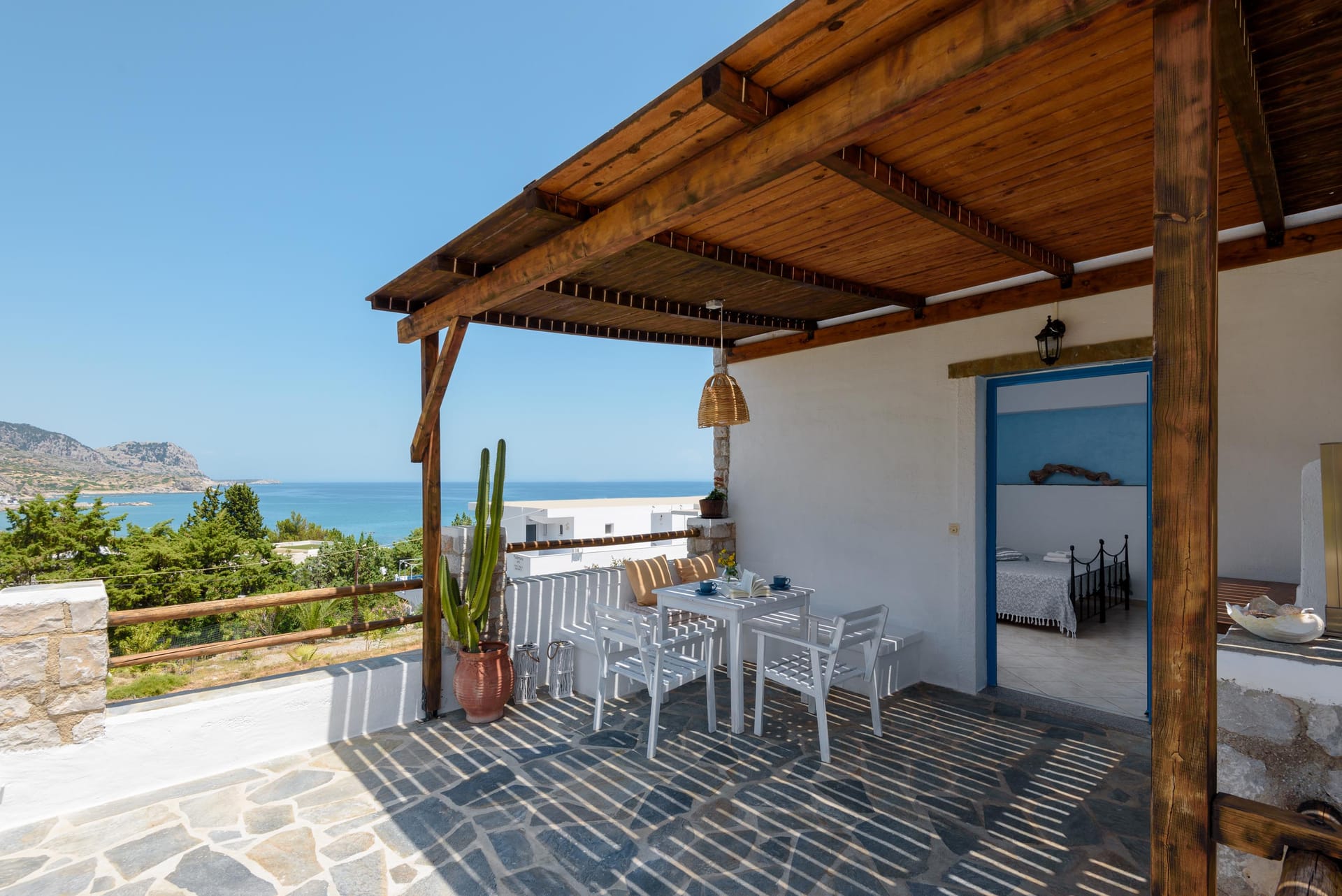 The open-plan living area includes a light beige corner sofa, flat-screen TV, and a fully equipped kitchen with fridge/freezer, washing machine, and essentials. The balcony is furnished with a table and chairs, perfect for enjoying the spectacular scenery.