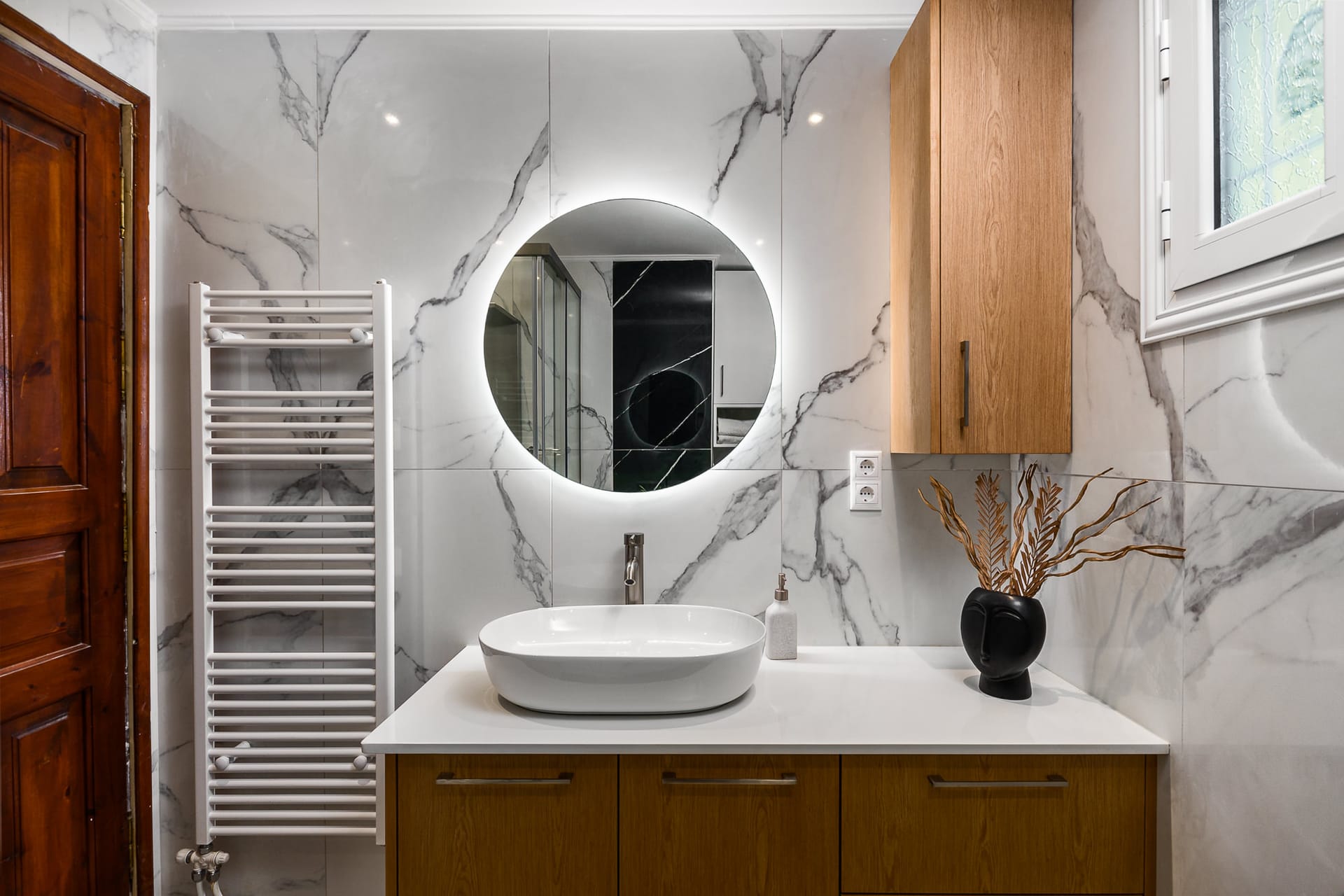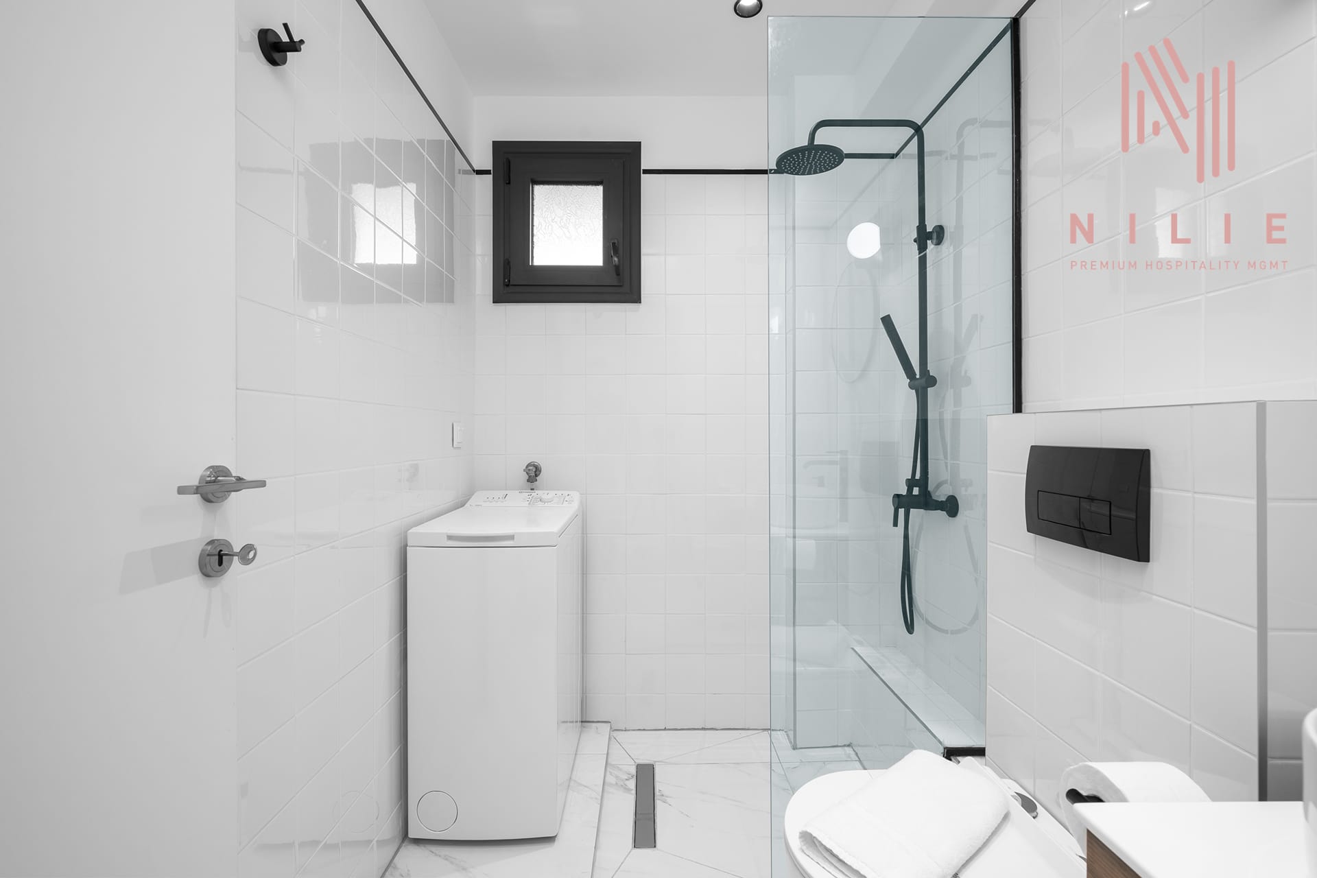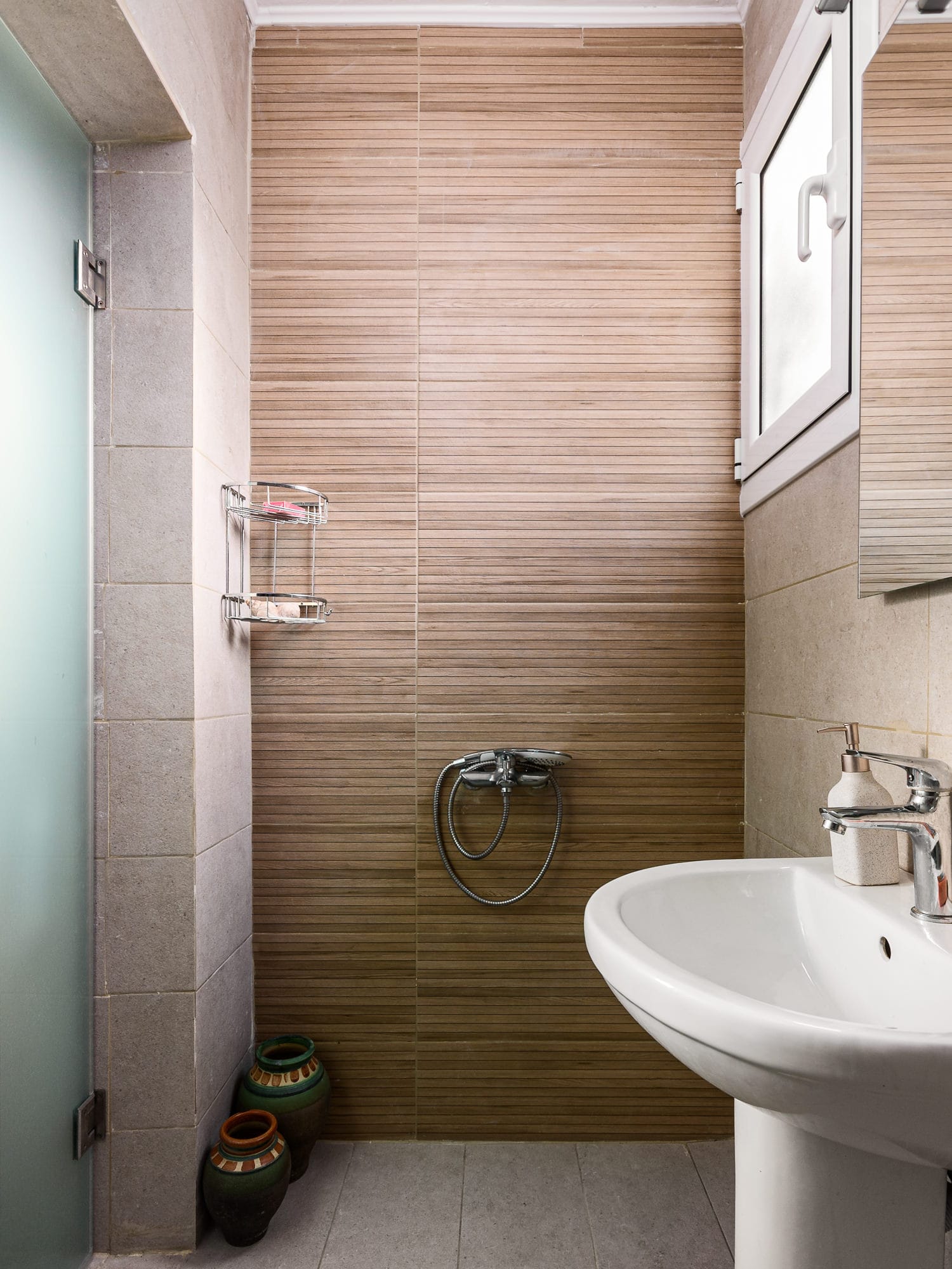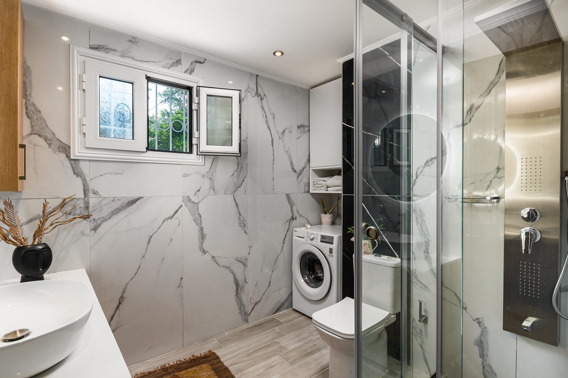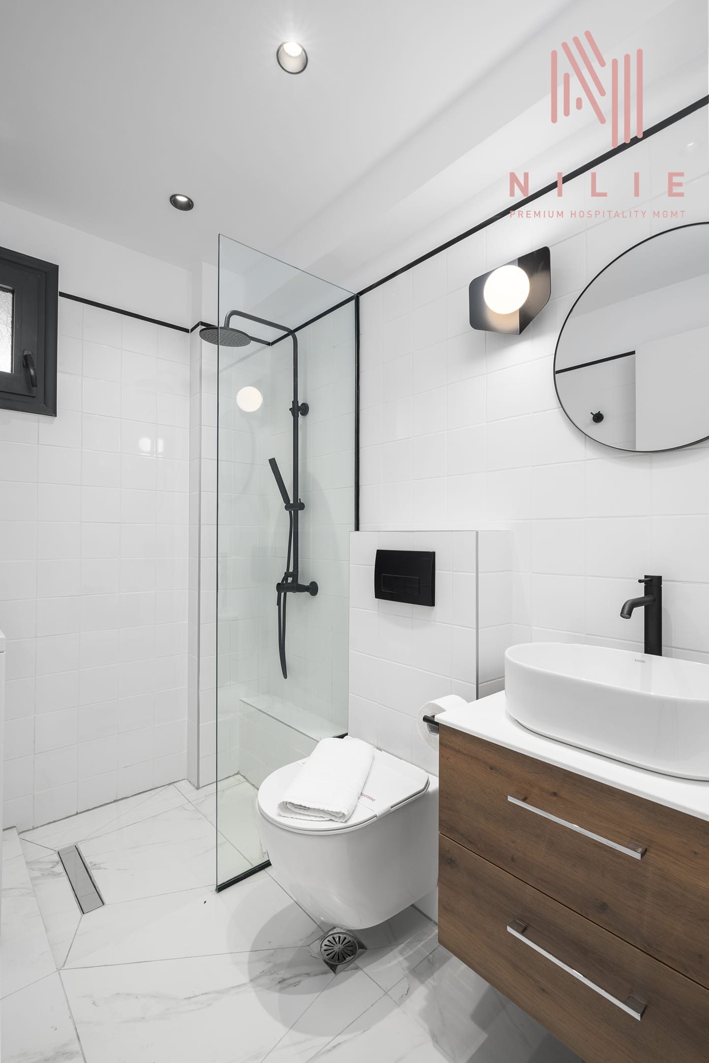 This one-bedroom apartment at Adonis Village offers stunning Mediterranean views of the sea, ravine, and 7th tee. The bedroom features a double bed (zip & lock) with shuttered French doors opening onto the balcony. A full bathroom with bath/shower, WC, and basin is adjacent.