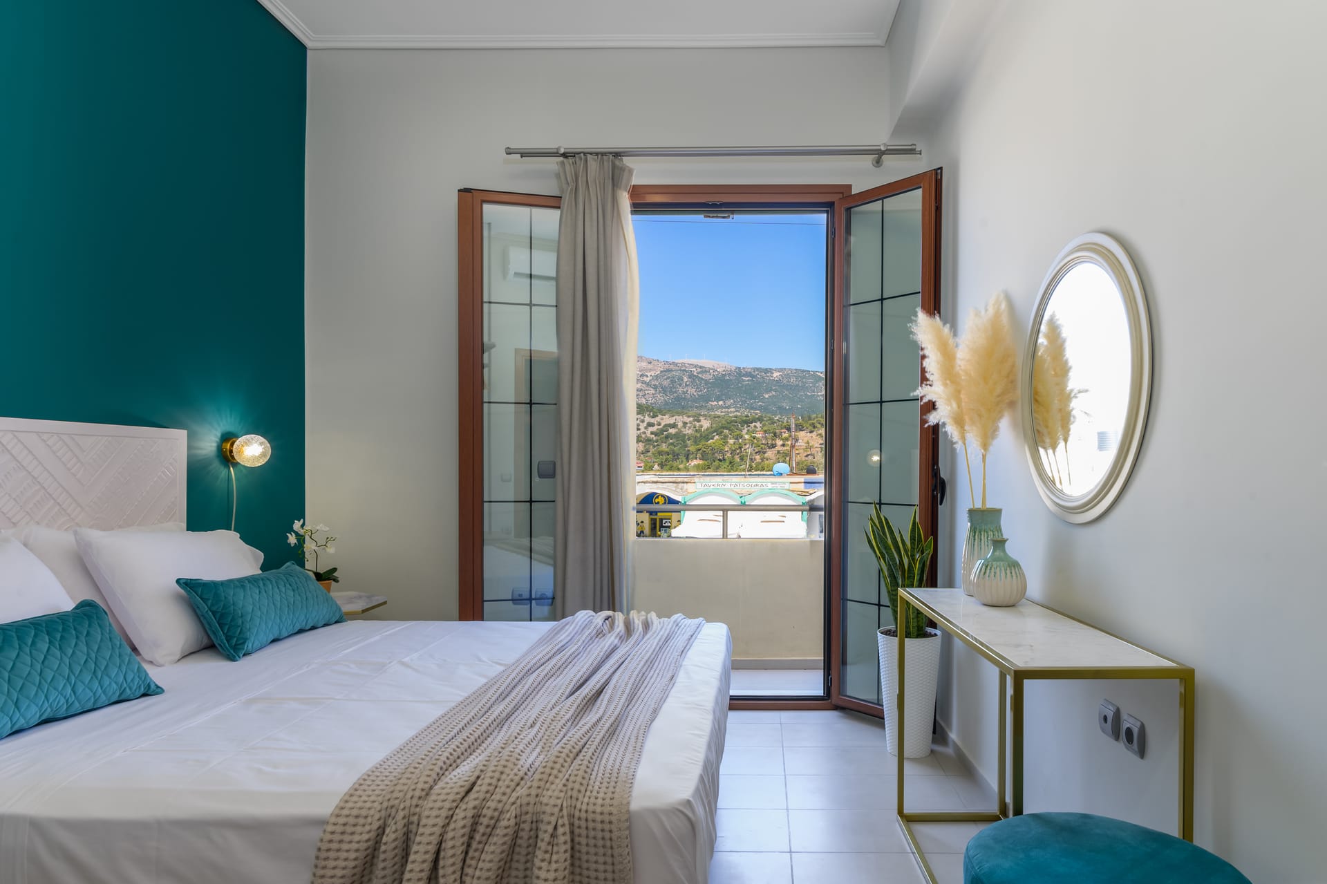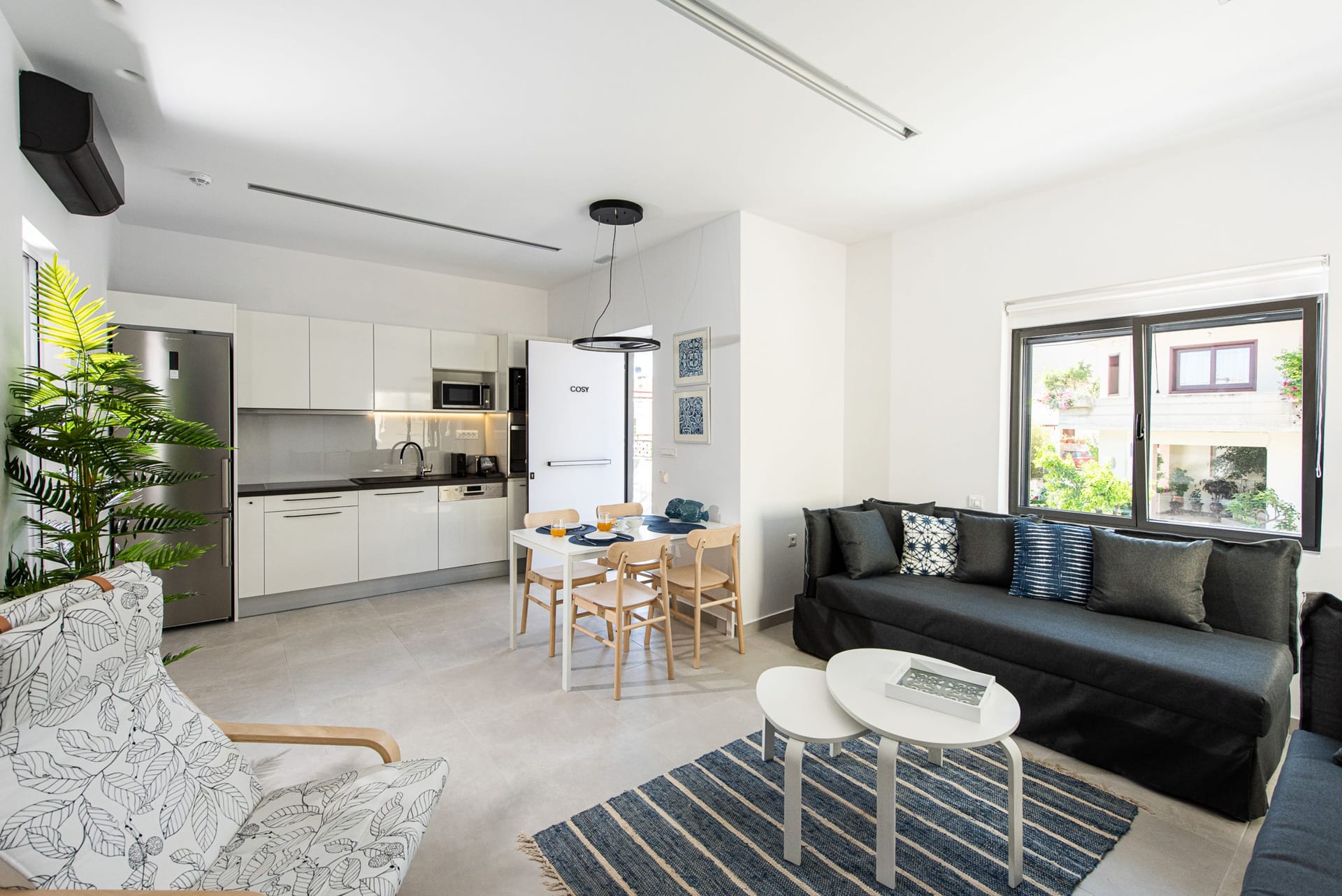 Decorated in neutral tones with contemporary fixtures, the living area features a modern L-shaped sofa, armchair, flat-screen TV, and French doors opening to a spacious rear balcony. The dining area seats four, and the adjacent kitchen has granite worktops and modern appliances, including oven, hob, microwave, dishwasher, and washing machine.