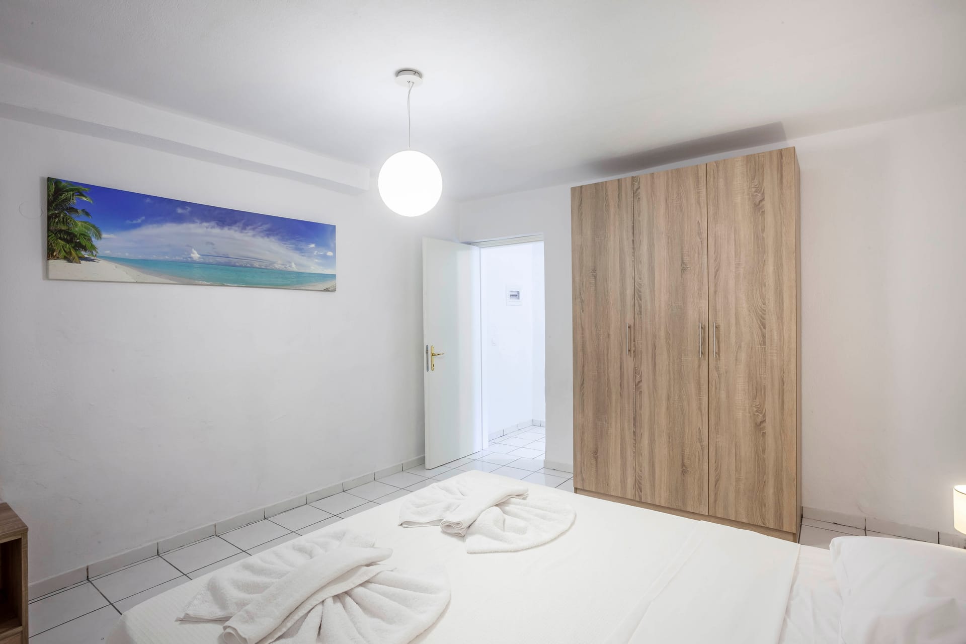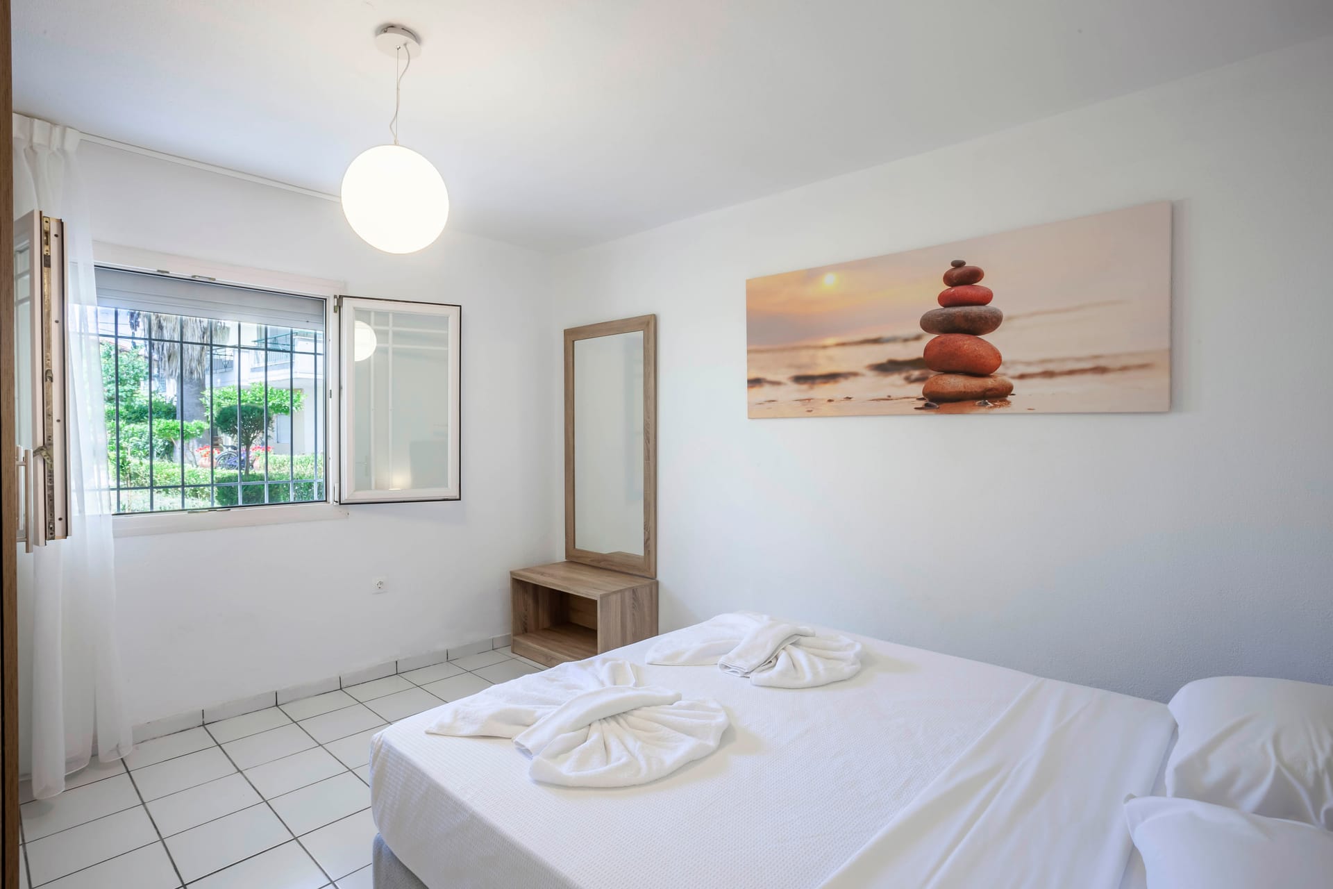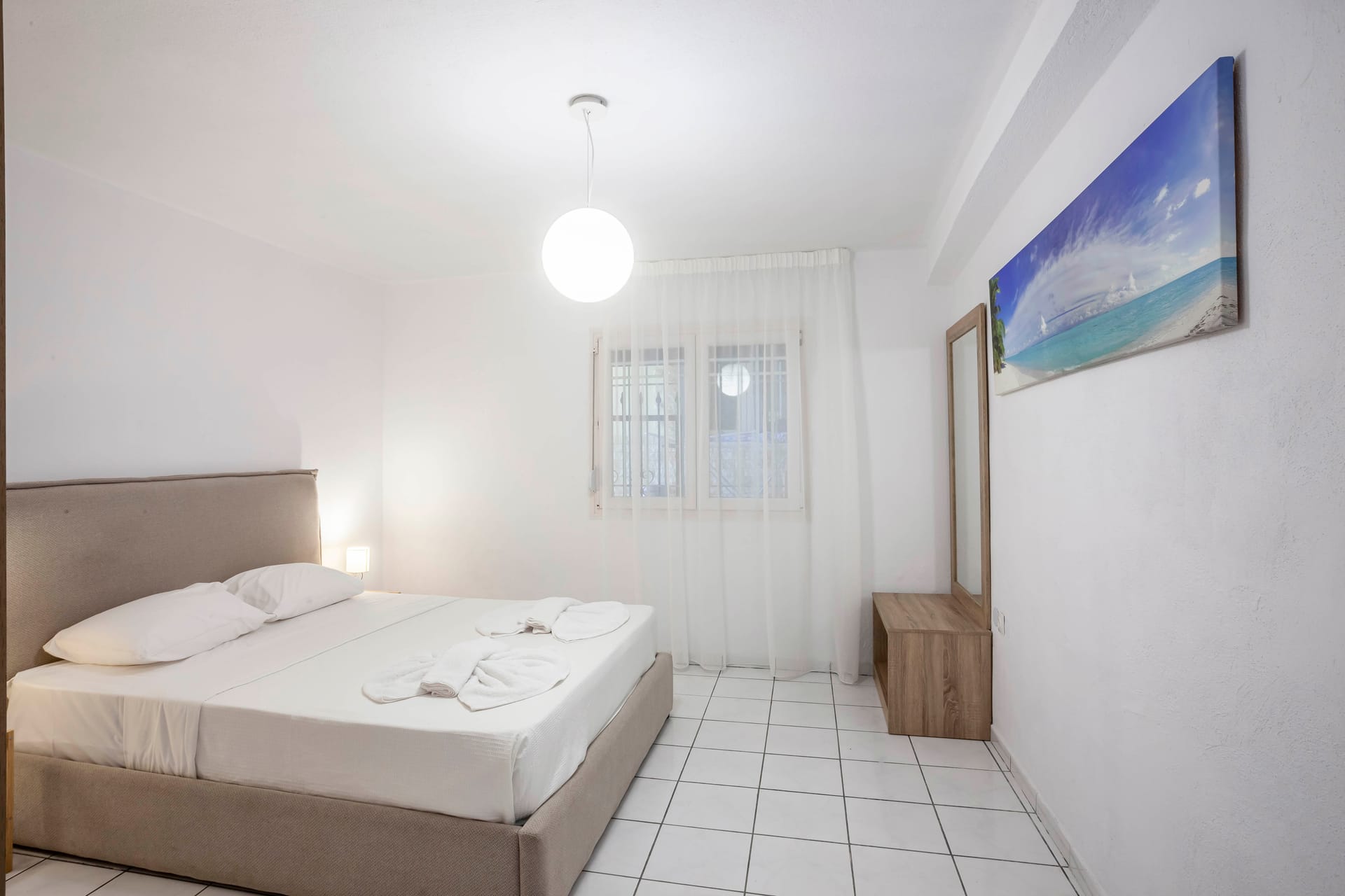 The master bedroom boasts a zip & lock bed ( double), fitted wardrobes, parquet flooring, bedside lamps, and French doors to a rear balcony, plus an en-suite with bath, separate shower, and dual sinks set in marble. The second bedroom offers also zip & lock beds.