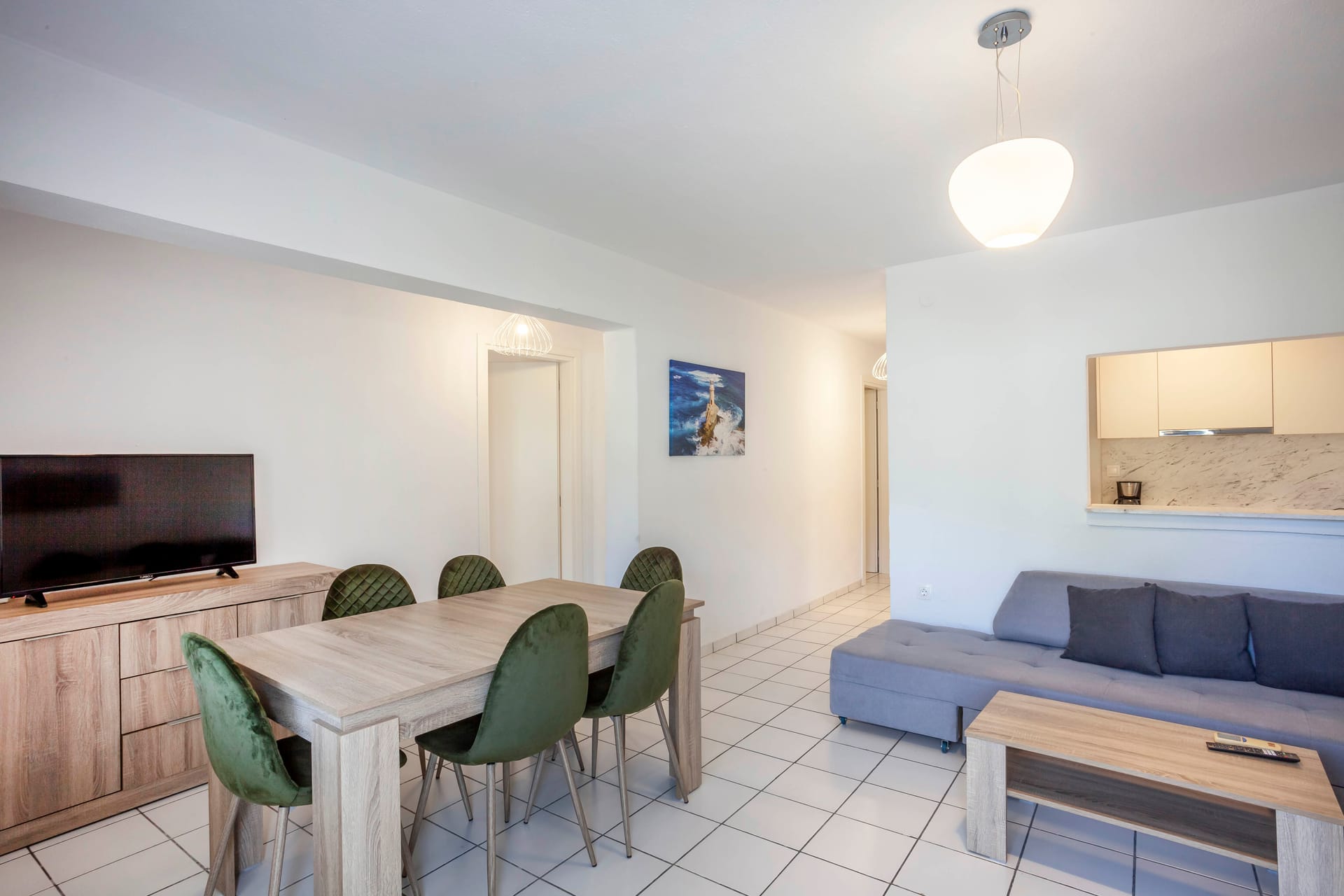 The open-plan living and dining area is modern and leads to a spacious covered balcony with table and chairs for al-fresco dining. The fully equipped kitchen features granite worktops, all essential utensils, and modern appliances, including a coffee machine, dishwasher, and washing machine.