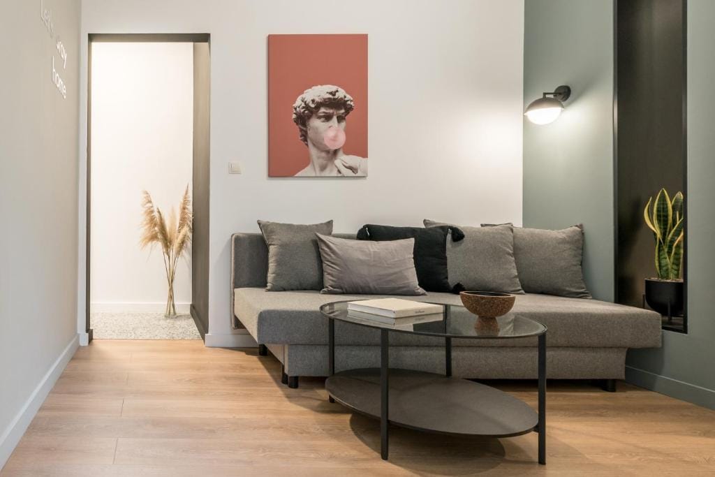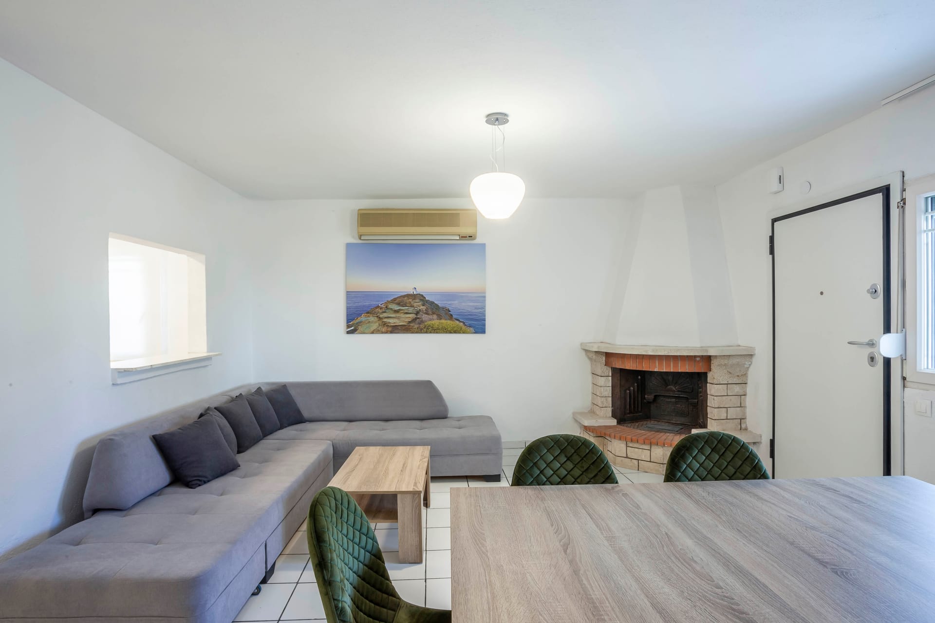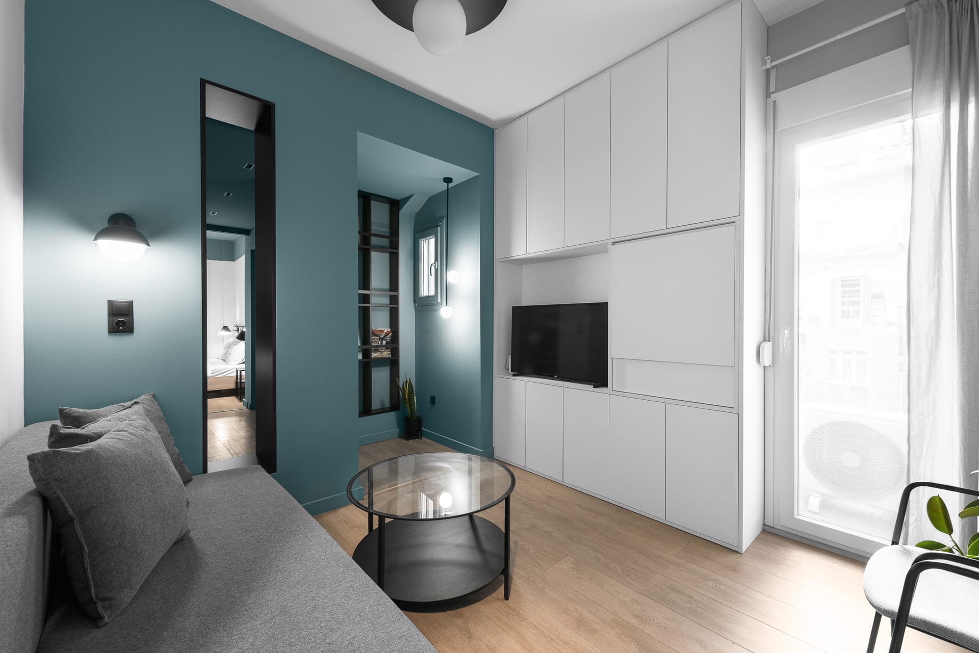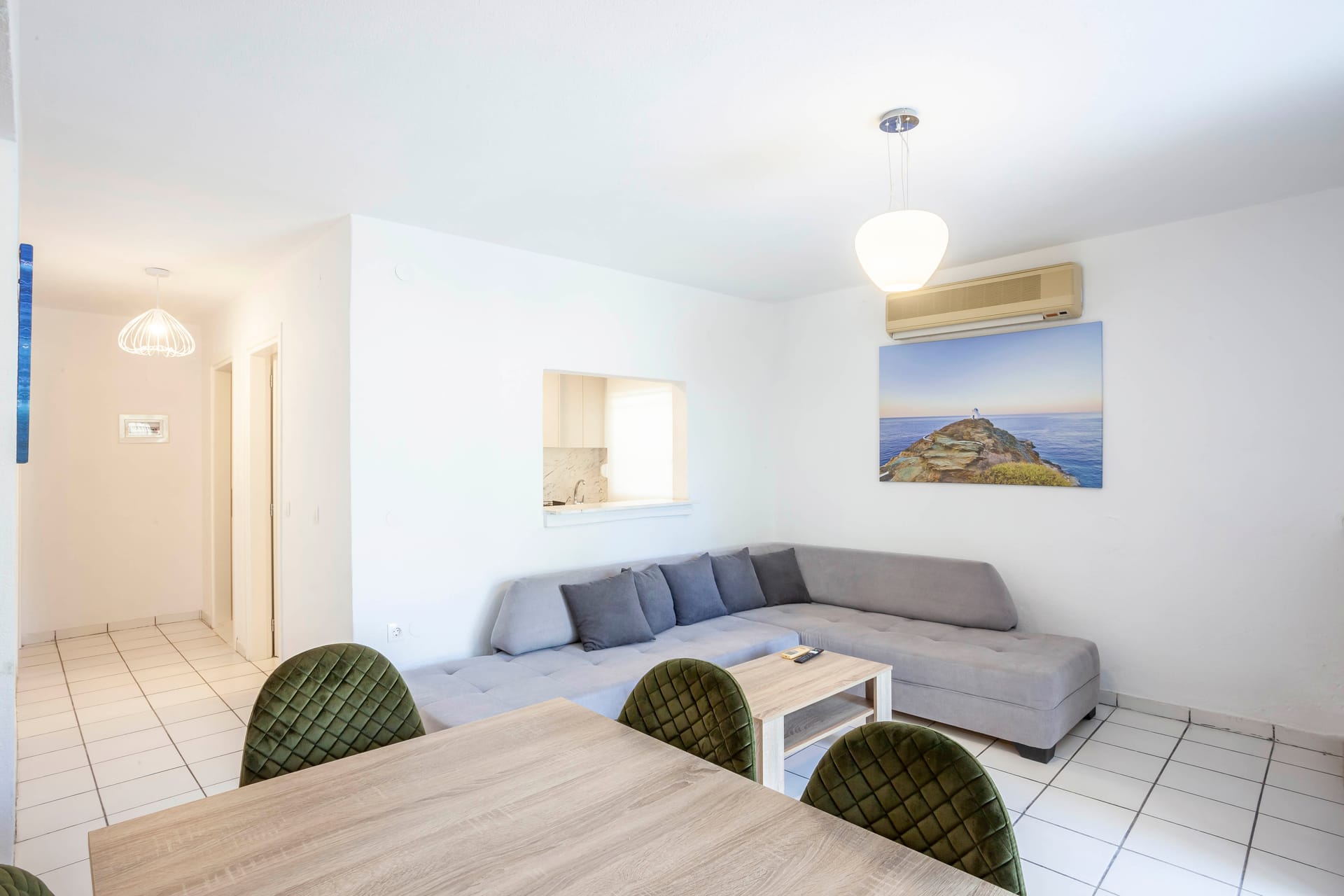 Neutral furniture and parquet floors are accented with vibrant accessories, creating a comfortable, stylish ambiance. A short hallway leads to a guest cloakroom with a shower.