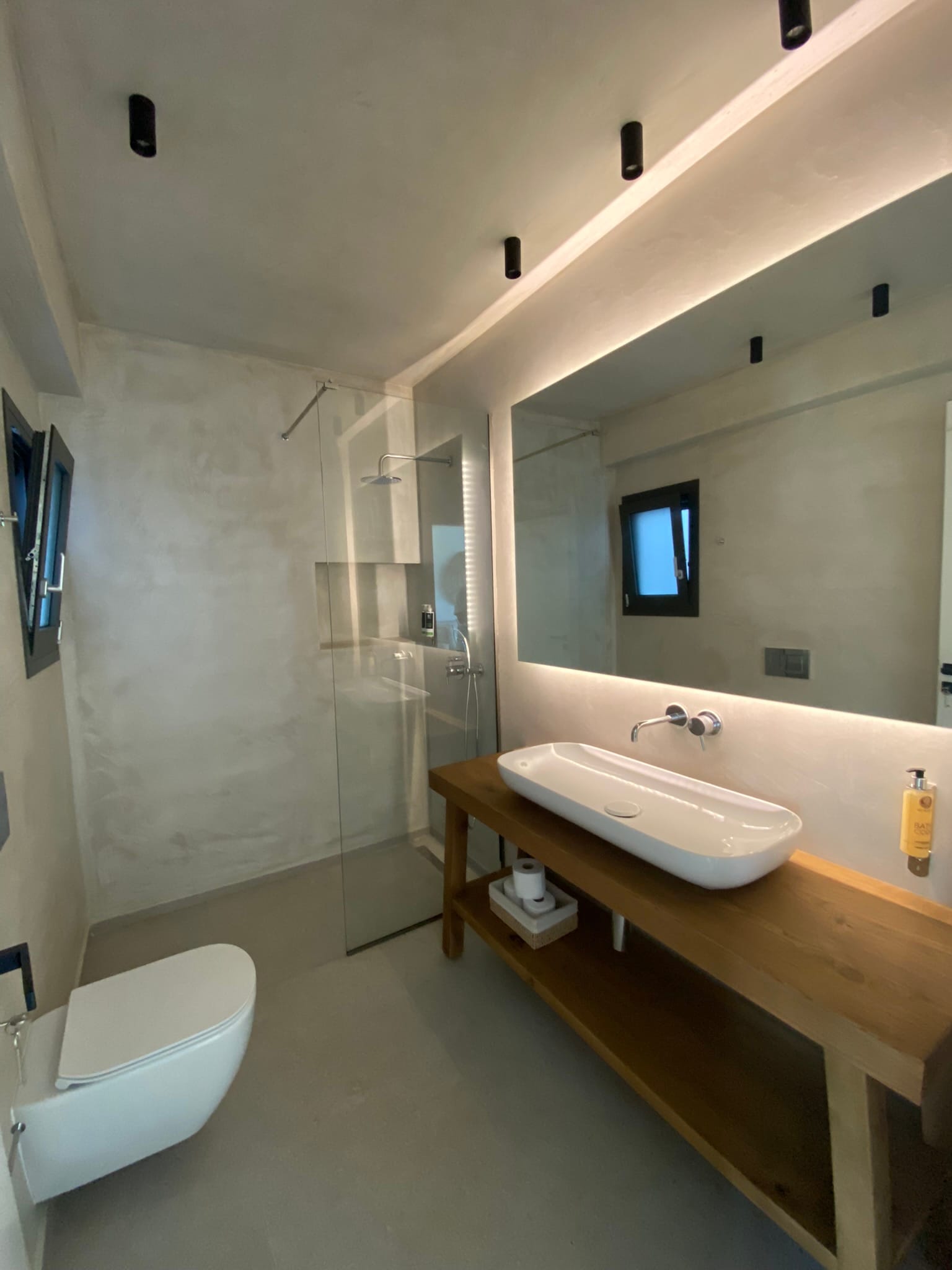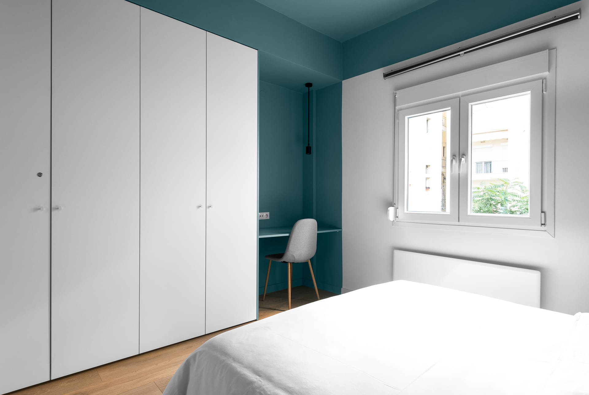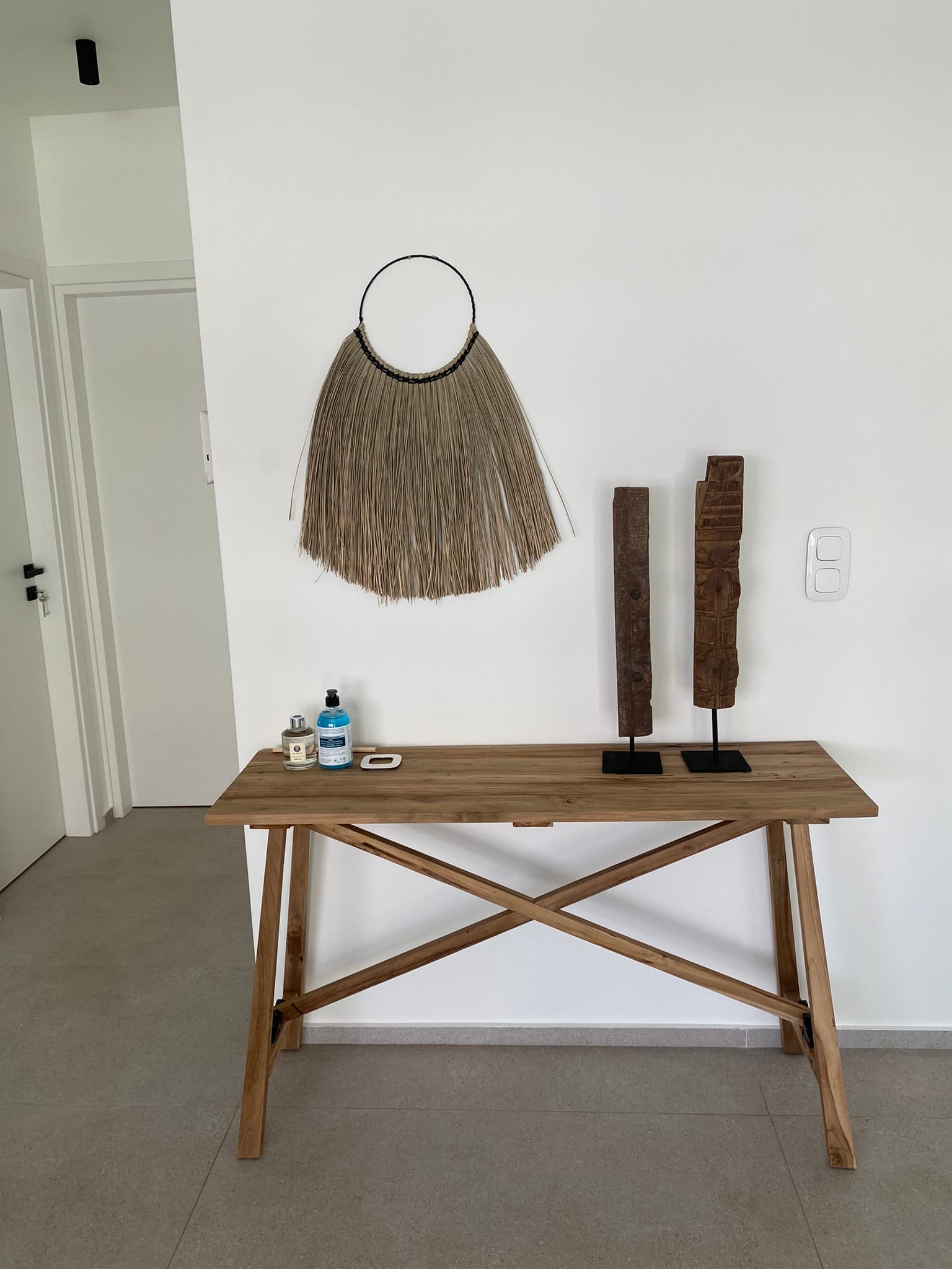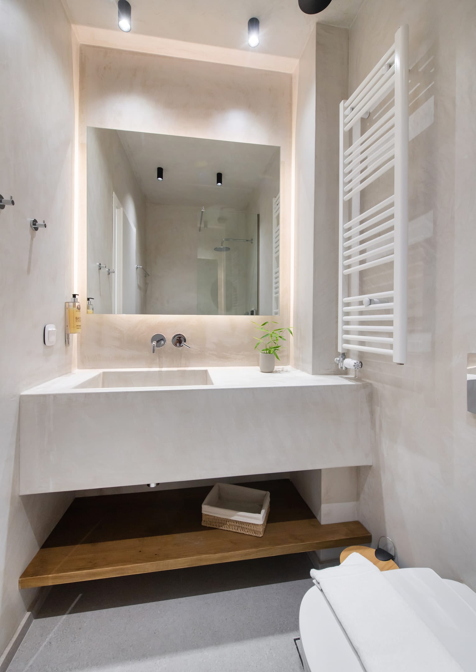 Neutral furniture and parquet floors are accented with vibrant accessories, creating a comfortable, stylish ambiance. A short hallway leads to a guest cloakroom with a shower.