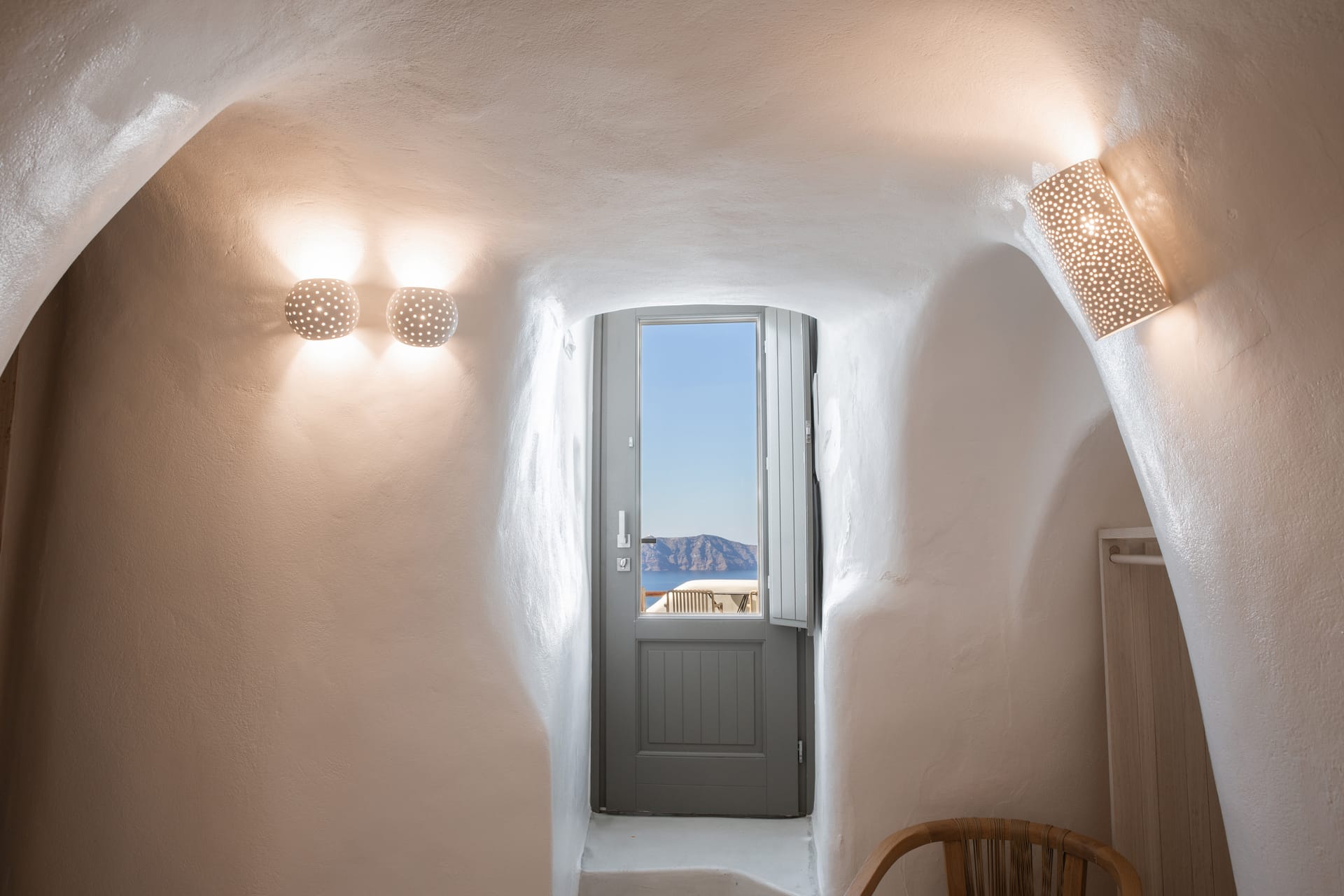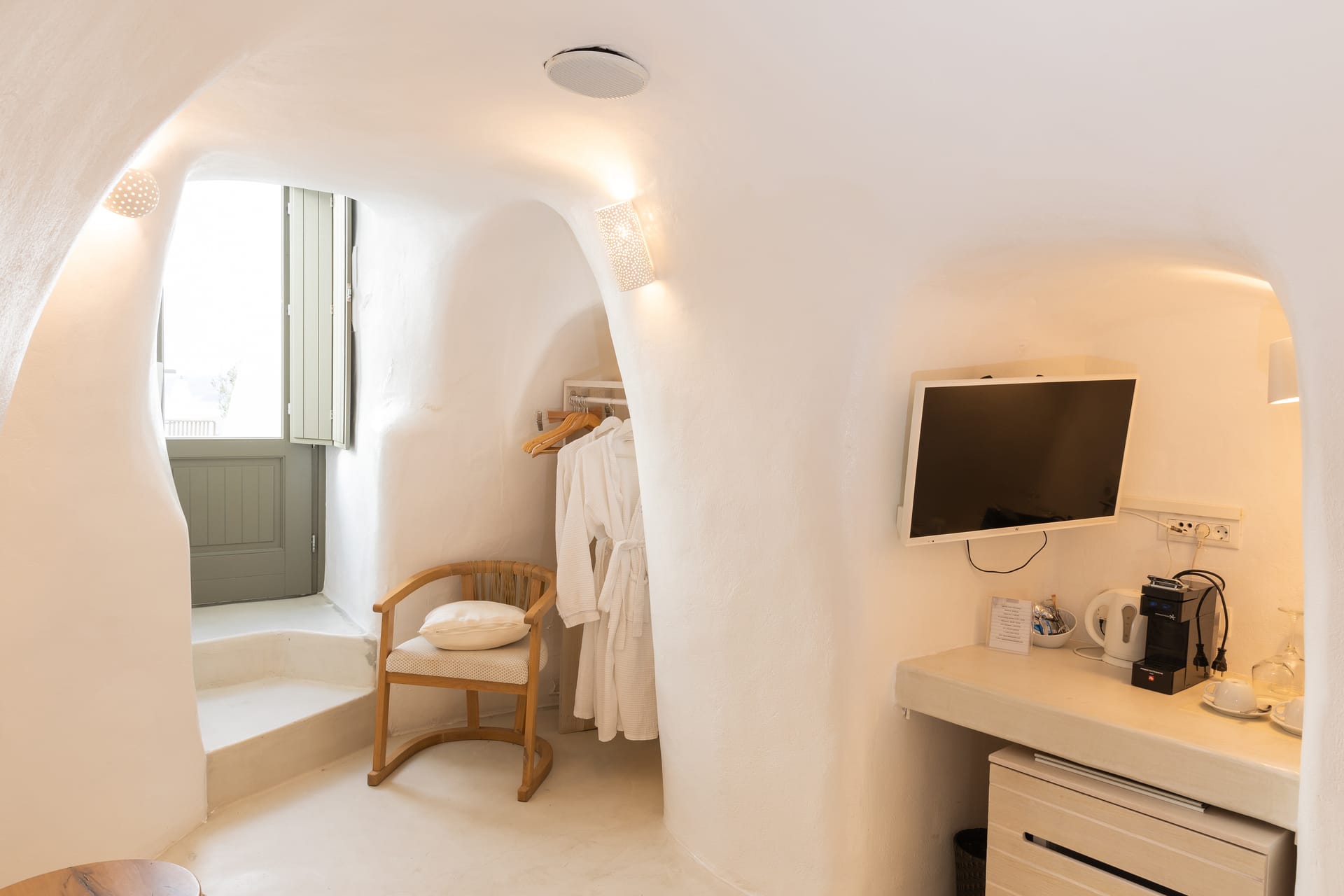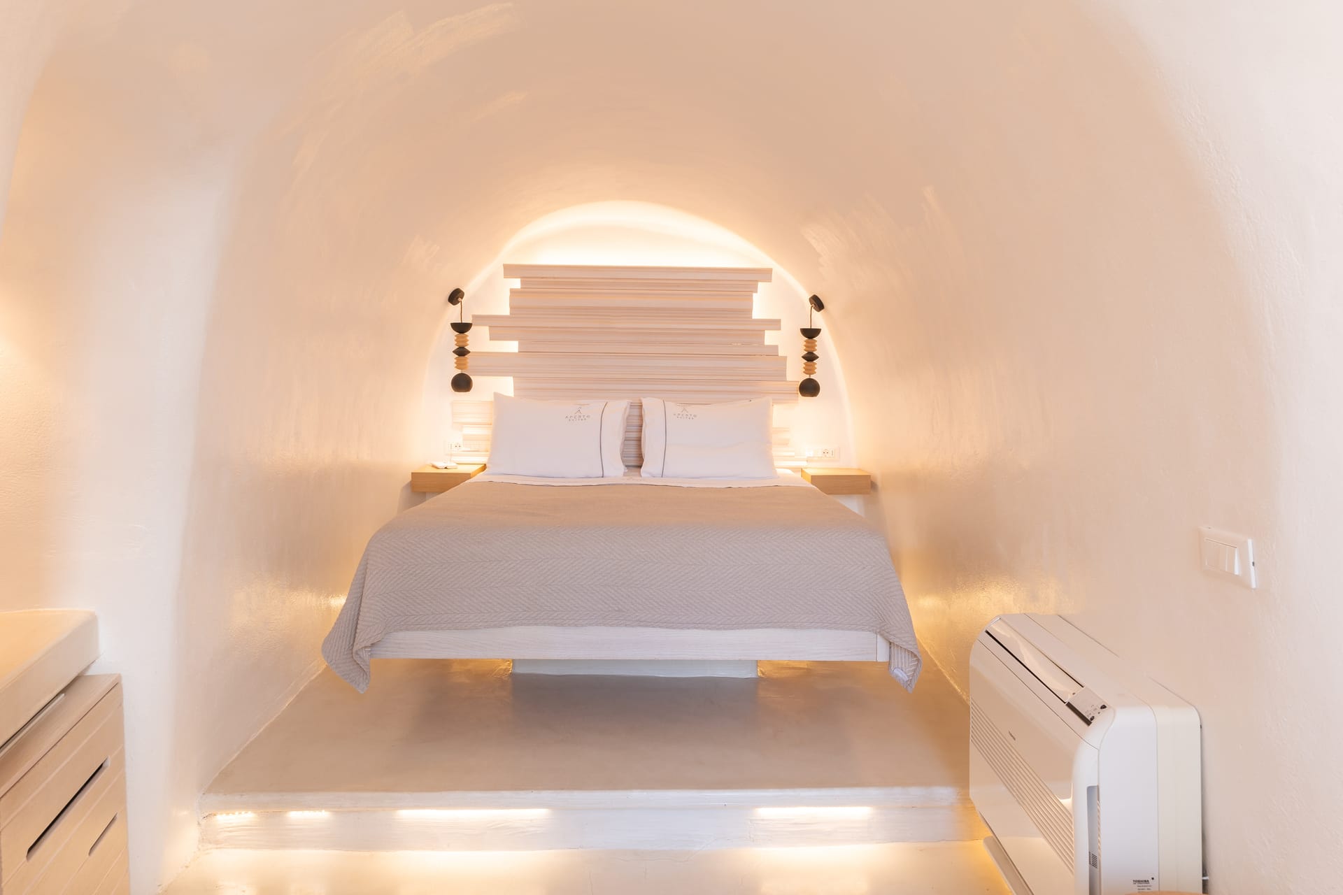 A bedroom with one double bed, bathroom with shower, and spacious private veranda with outdoor heated Hot Tub, sea and sunset view.