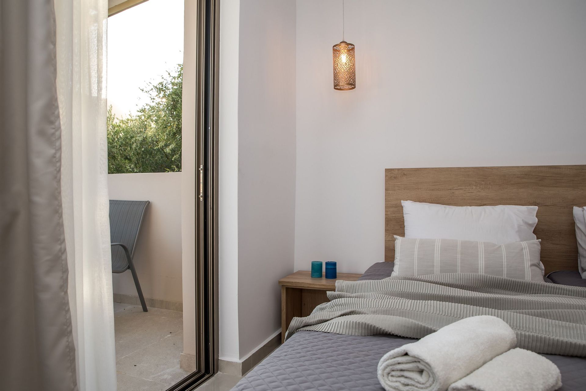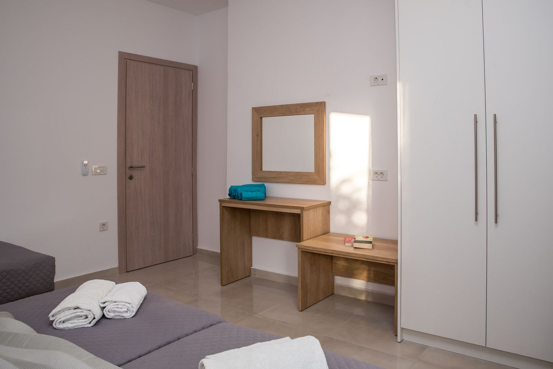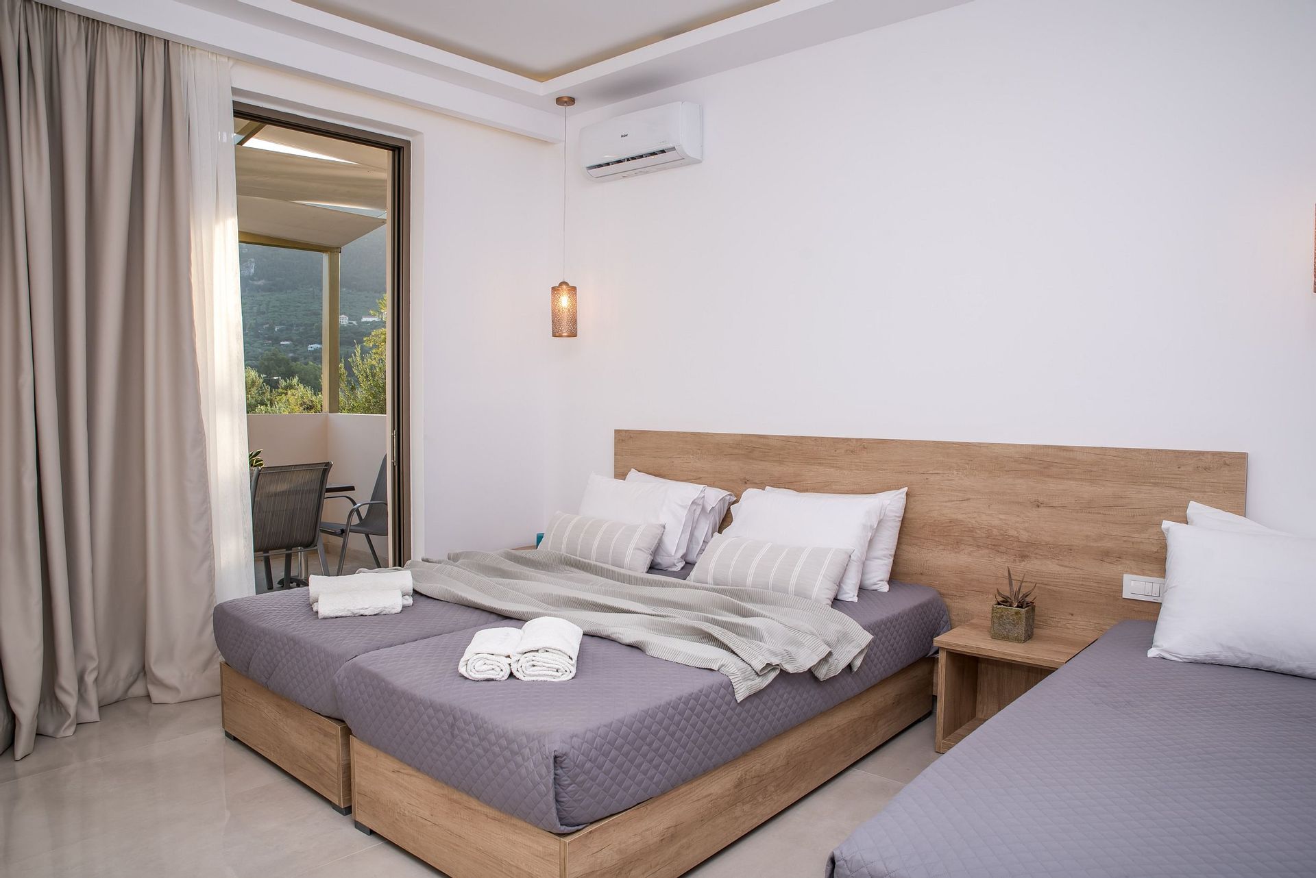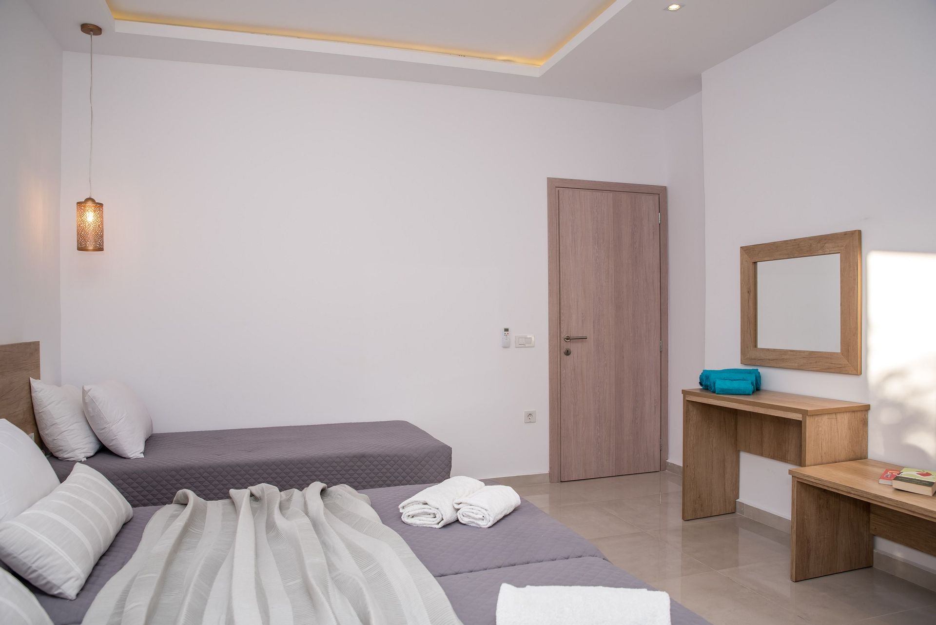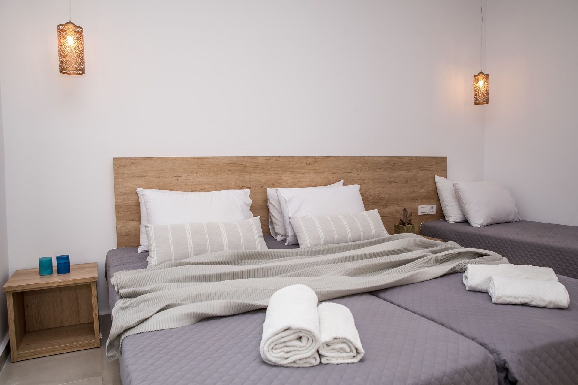 This newly built apartment can accommodate up to 5 guests, whereas it is located on the 1st floor and measures 60 sq.m.The apartment offers 2 bedrooms, one with a queen sized bed and one with three single beds (two of which, naturally, can be combined into queen bed if you wish).