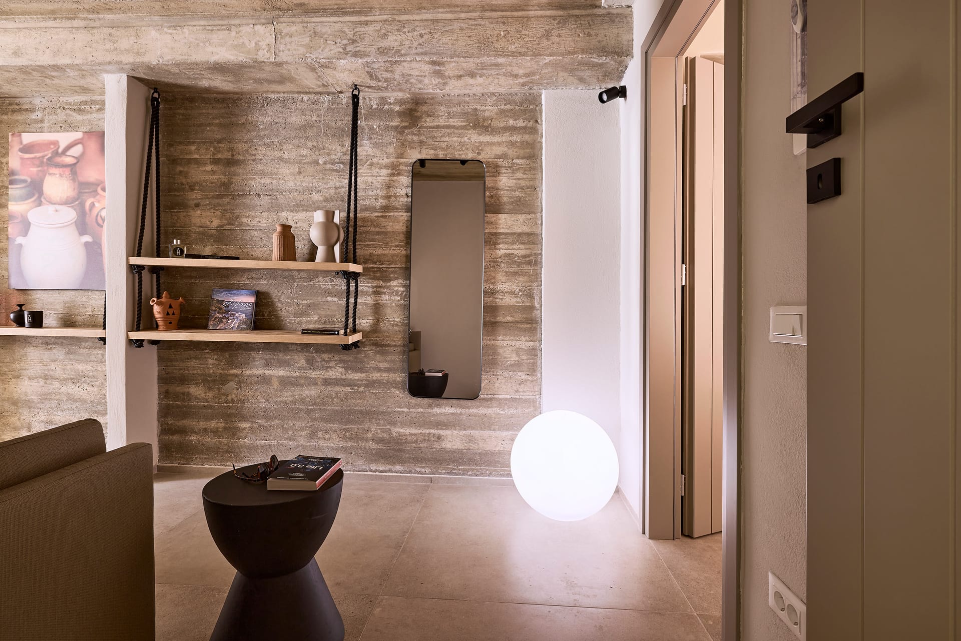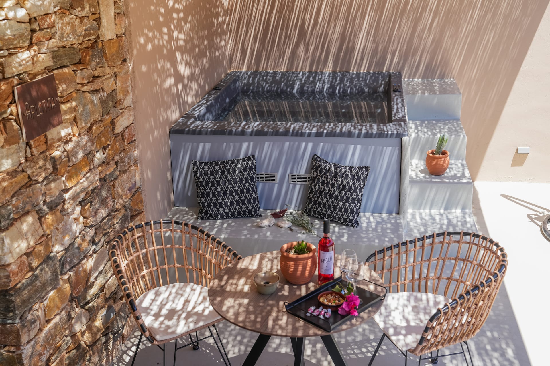 Features: 25sq.m. | Private terrace with partial sea views and hot-tub | 1 open plan bedroom with king size bed and a small sitting area | Private bathroom with walk-in shower and bidet.