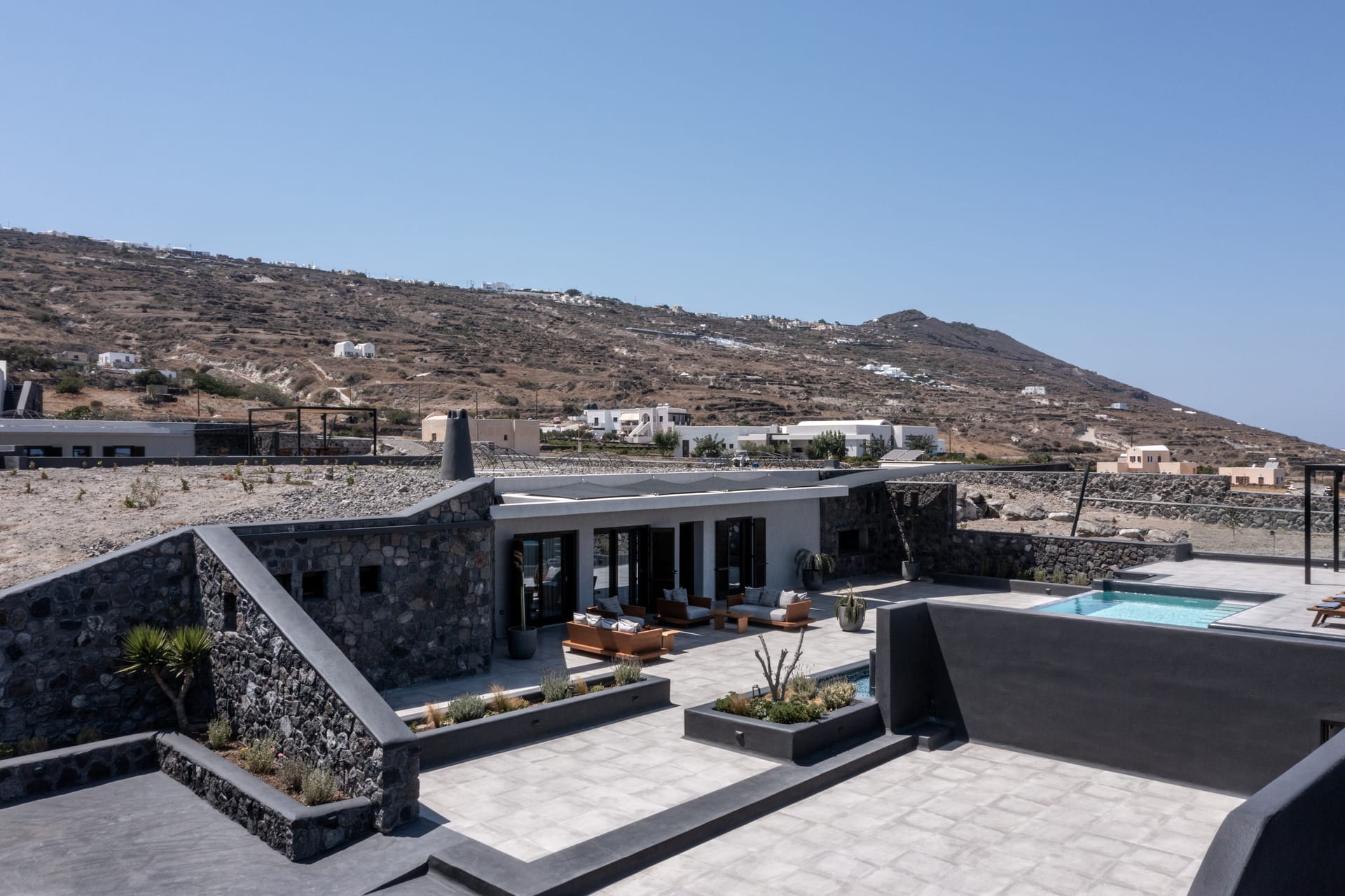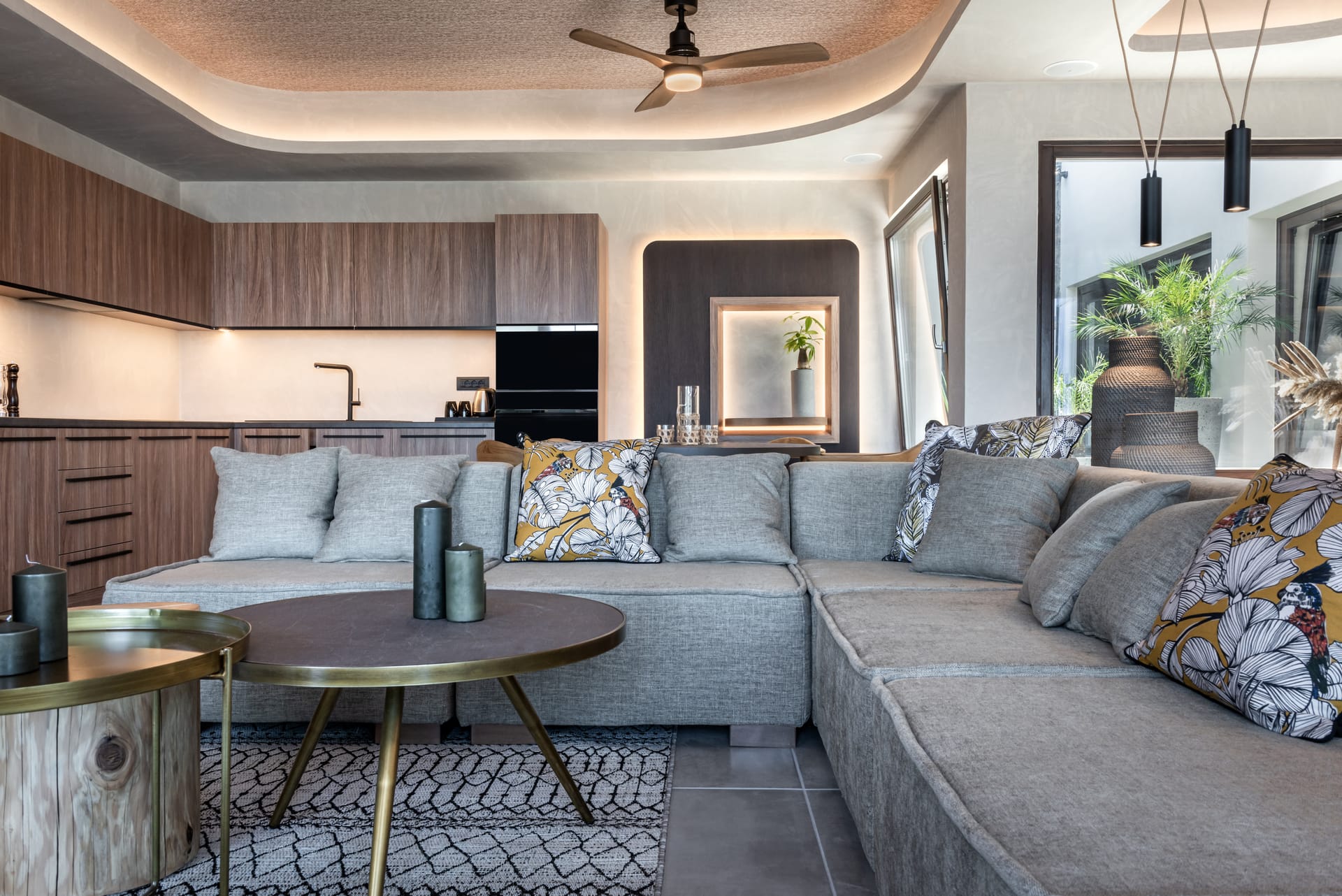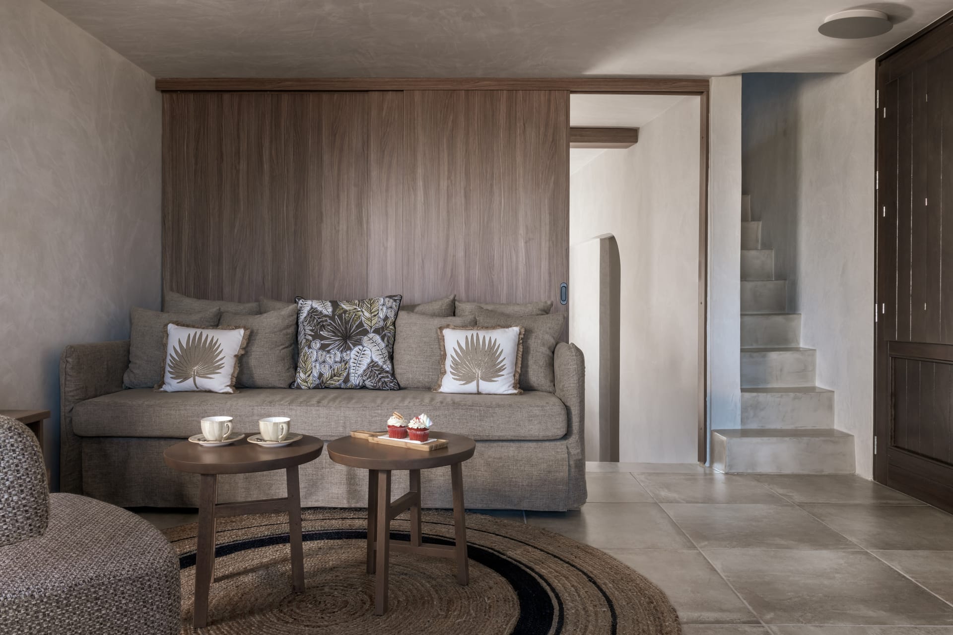 Two of the property’s parts are Superior Villas, each boasting a private pool and offering a heaven of refined elegance for up to four guests. The intimate living spaces exude warmth and sophistication, while the fully equipped kitchens beckon culinary adventures. Elegant dining areas provide the perfect setting for unforgettable meals with loved ones, four master bedrooms ensure restful nights and their en-suite bathrooms may only add up to the experience. Outside, the mini water rainfalls cascading down a volcano-inspired wall will captivate your senses, setting the mood for relaxation on the inviting sunbeds in front of the mesmerizing views.