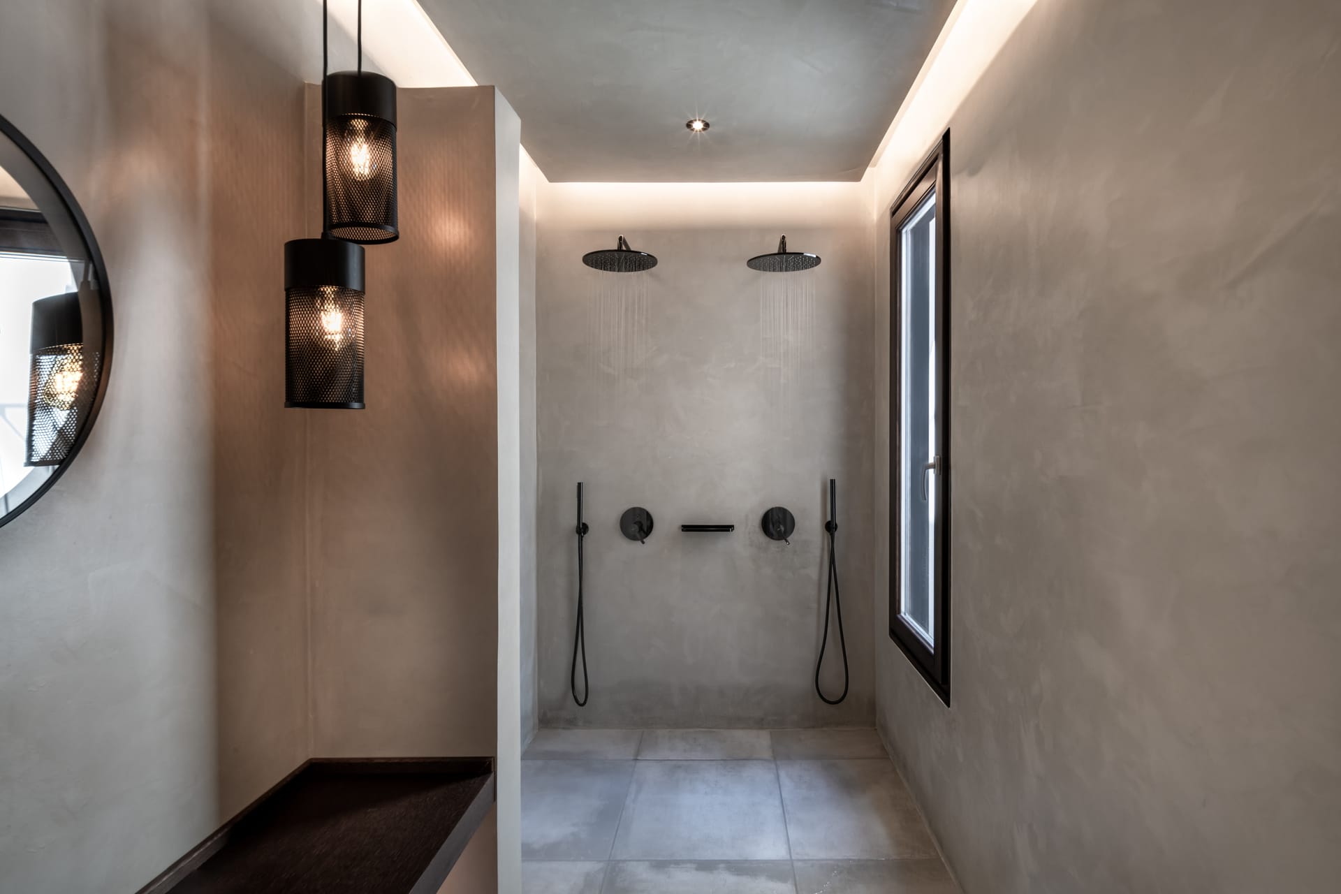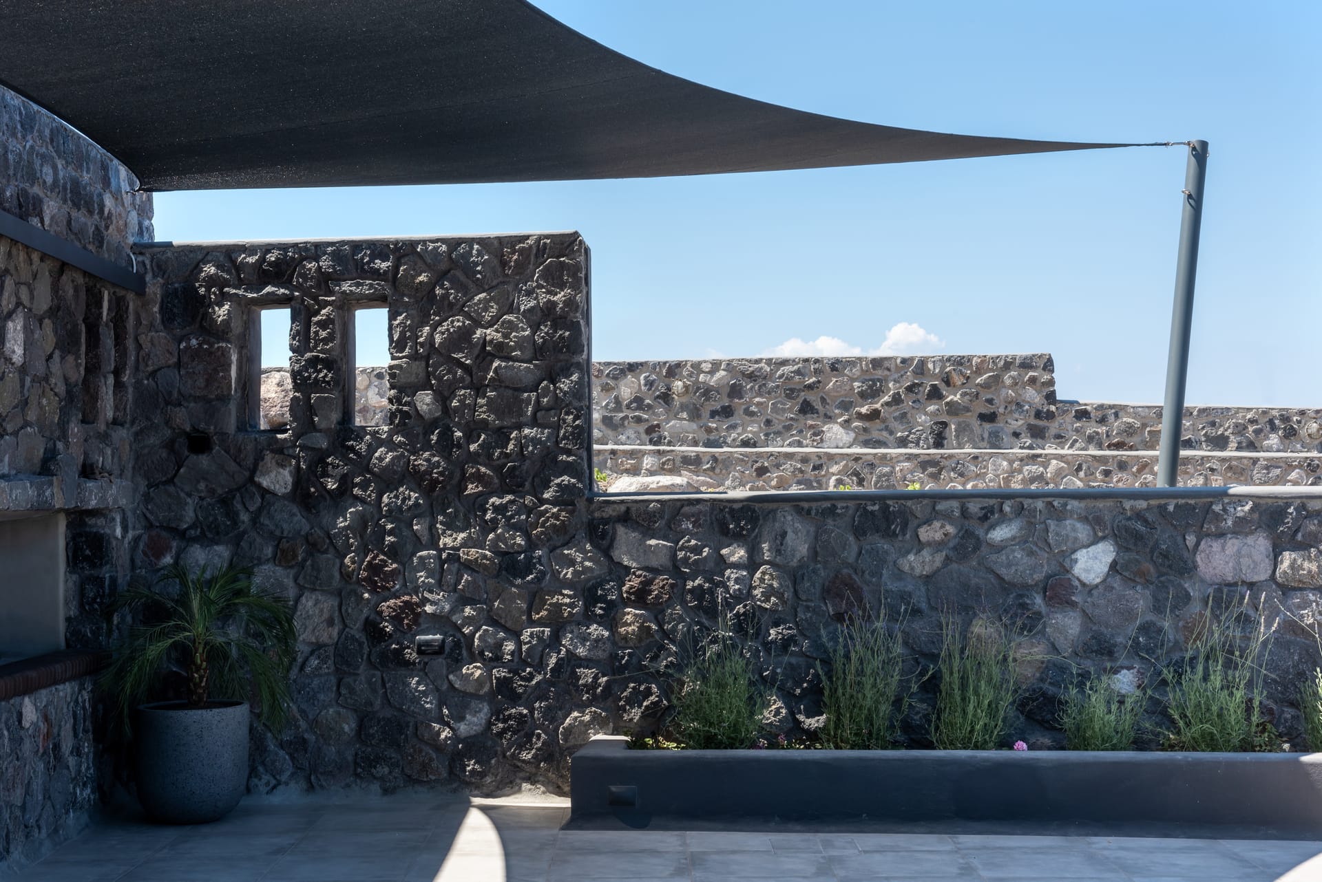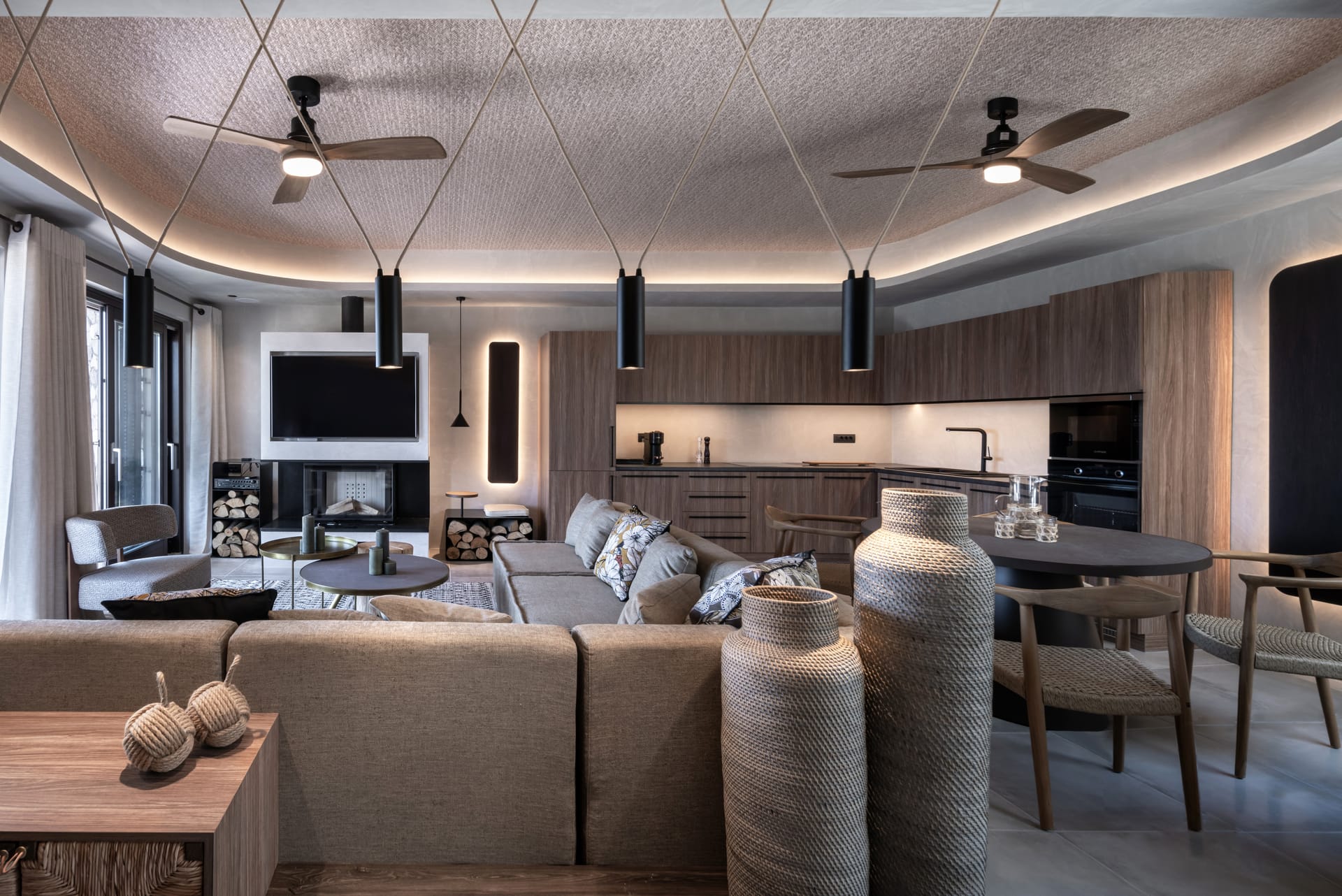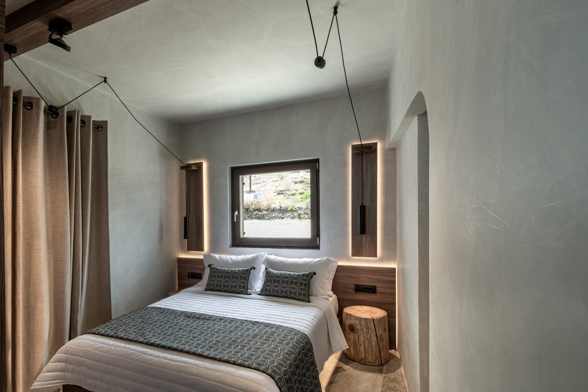 Two of the property’s parts are Superior Villas, each boasting a private pool and offering a heaven of refined elegance for up to four guests. The intimate living spaces exude warmth and sophistication, while the fully equipped kitchens beckon culinary adventures. Elegant dining areas provide the perfect setting for unforgettable meals with loved ones, four master bedrooms ensure restful nights and their en-suite bathrooms may only add up to the experience. Outside, the mini water rainfalls cascading down a volcano-inspired wall will captivate your senses, setting the mood for relaxation on the inviting sunbeds in front of the mesmerizing views.