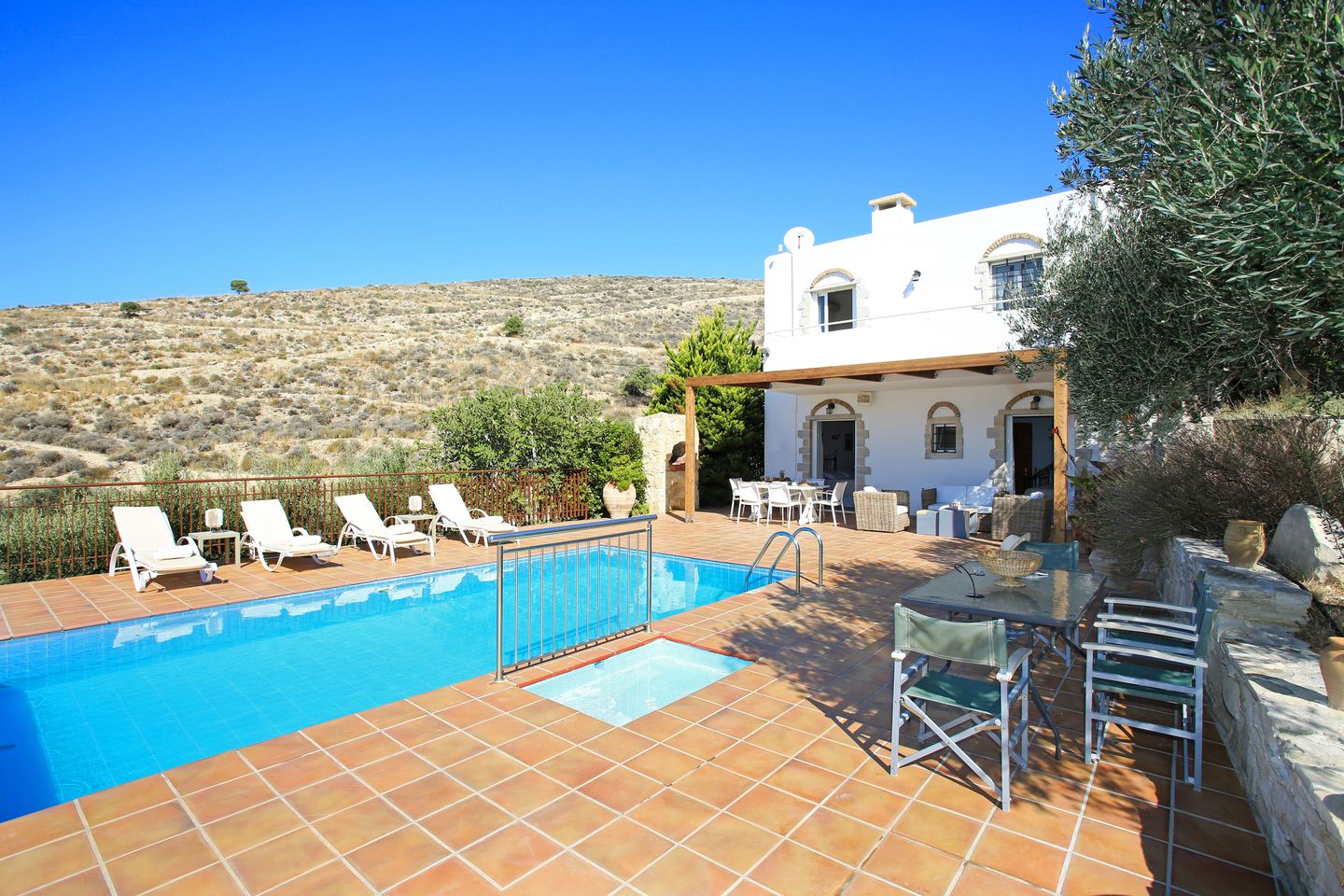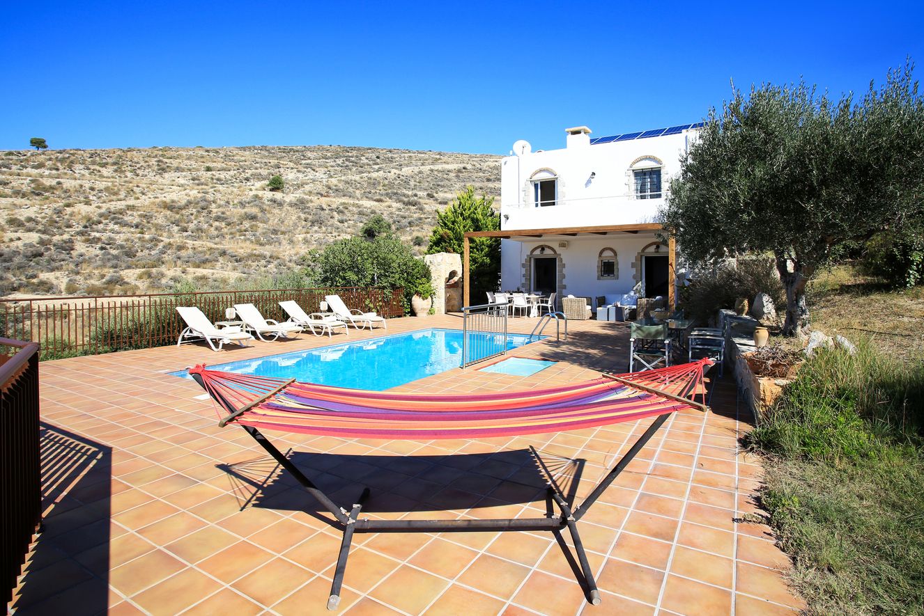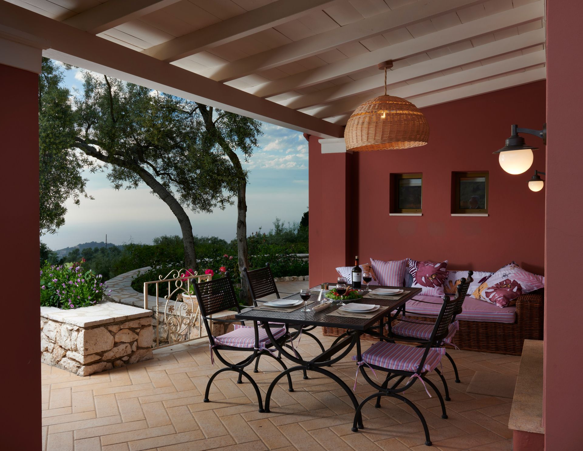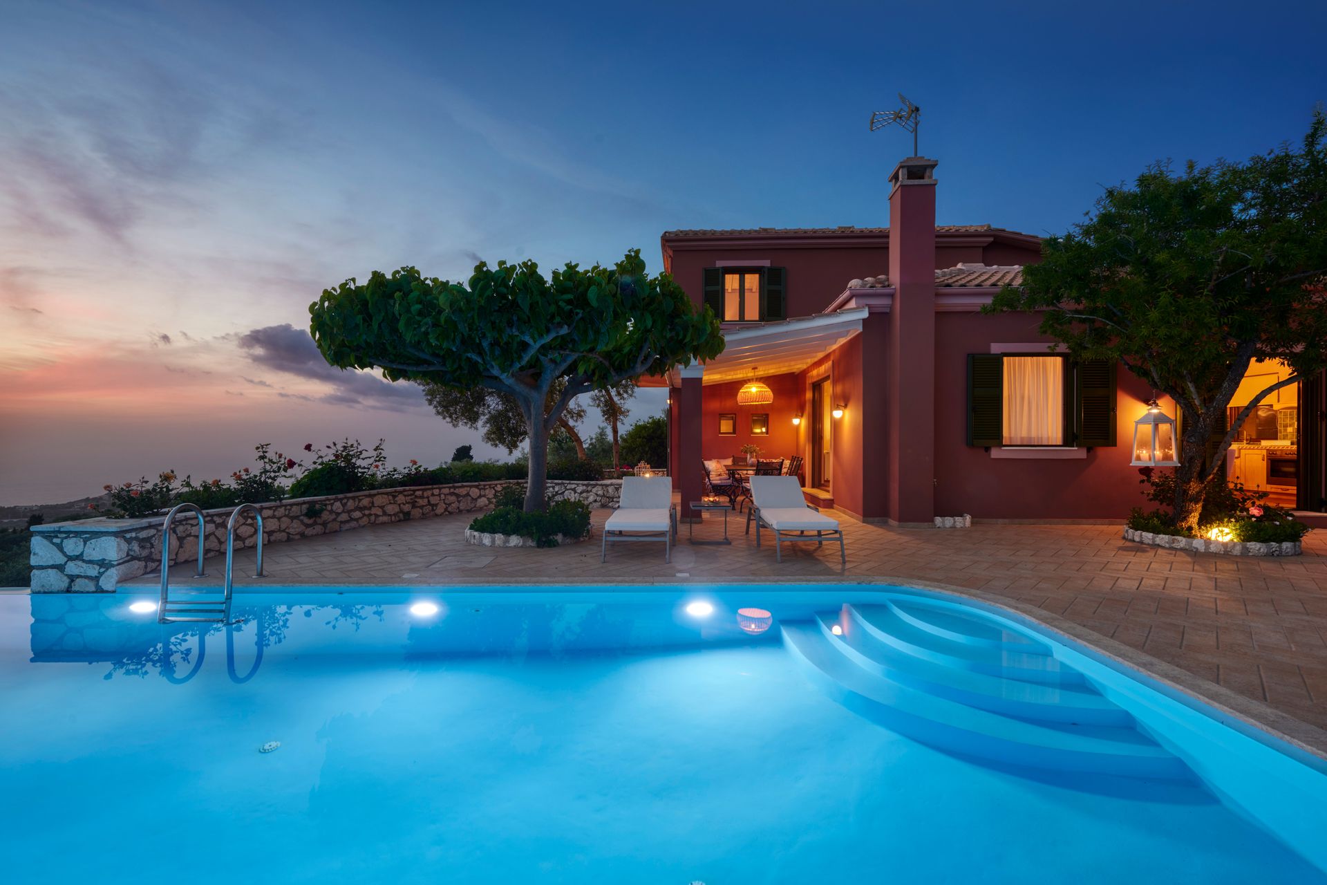 The villa is mainly made of wood, marble, granite and earth tones that complement the surrounding natural world. Traditional carpenters have poured all their skill and dexterity in building the furniture you will enjoy.On the ground floor you will find a spacious, welcoming living room, a fully equipped kitchen decorated with style and skill and a comfortable bedroom with 2 beds, bathroom and shower. On the top floor a master bedroom awaits, with an en-suite bathroom, a Jacuzzi and a balcony, from where you can gaze at the spectacular Ionian view every morning.The outdoor spaces are framed by stone walls and boast a wonderful yard with ceramic flooring in earth tones, a variety of flower beds and a roofed balcony-dining room where you can enjoy your homemade meals prepared by yourselves in your traditional wood-fired oven.The final touch is the blue water of the large swimming pool that becomes one with the horizon and the endless blue of the Ionian Sea.