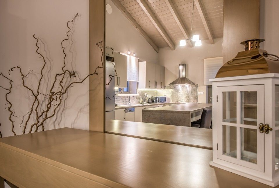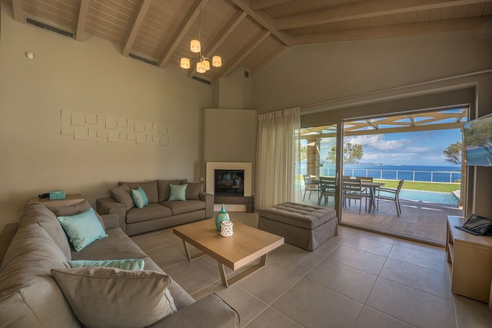 Artina Villa can accommodate up to 8 people, 6 in 3 large bedrooms and 2 more in the sofa beds in the living room. Two of the bedrooms have en suite bathrooms, there is one more extra bathroom, fully equipped kitchen with all utilities such as microwave oven, espresso machine, coffee machine, dishwasher, large cooker and refrigerator, dining table, living room with 2 sofa beds and fireplace. There is a 42 inch plasma satellite TV with CD-DVD player and playstation in the living room and a 32 inch plasma satellite TV in every bedroom. Air conditioning (cold/heat) and WiFi internet access is available throughout. The villa also features many floor to ceiling windows that lead to spacious verandas offering unobstructed views of the endless blue sea and the majestic mountains in the surrounding area.
