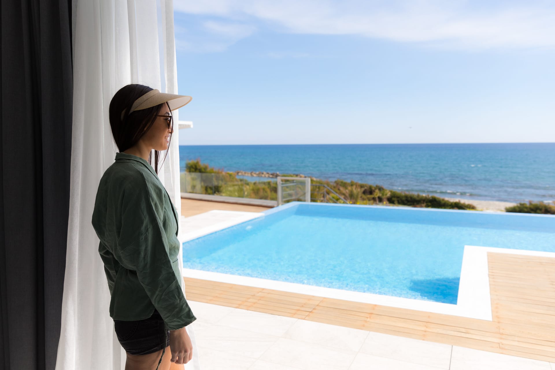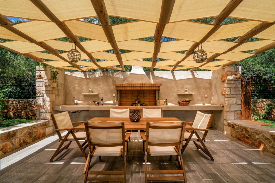 Outside, you are greeted by a private, paved driveway leading to the villa, well kept lawns in multiple levels, a state of the art heated* swimming pool with waterfalls, aero-massage and hydro-massage, shaded verandas, a sun terrace as well as an outdoor bar where you can enjoy your drinks and cocktails while gazing the endless blue of Keri bay.