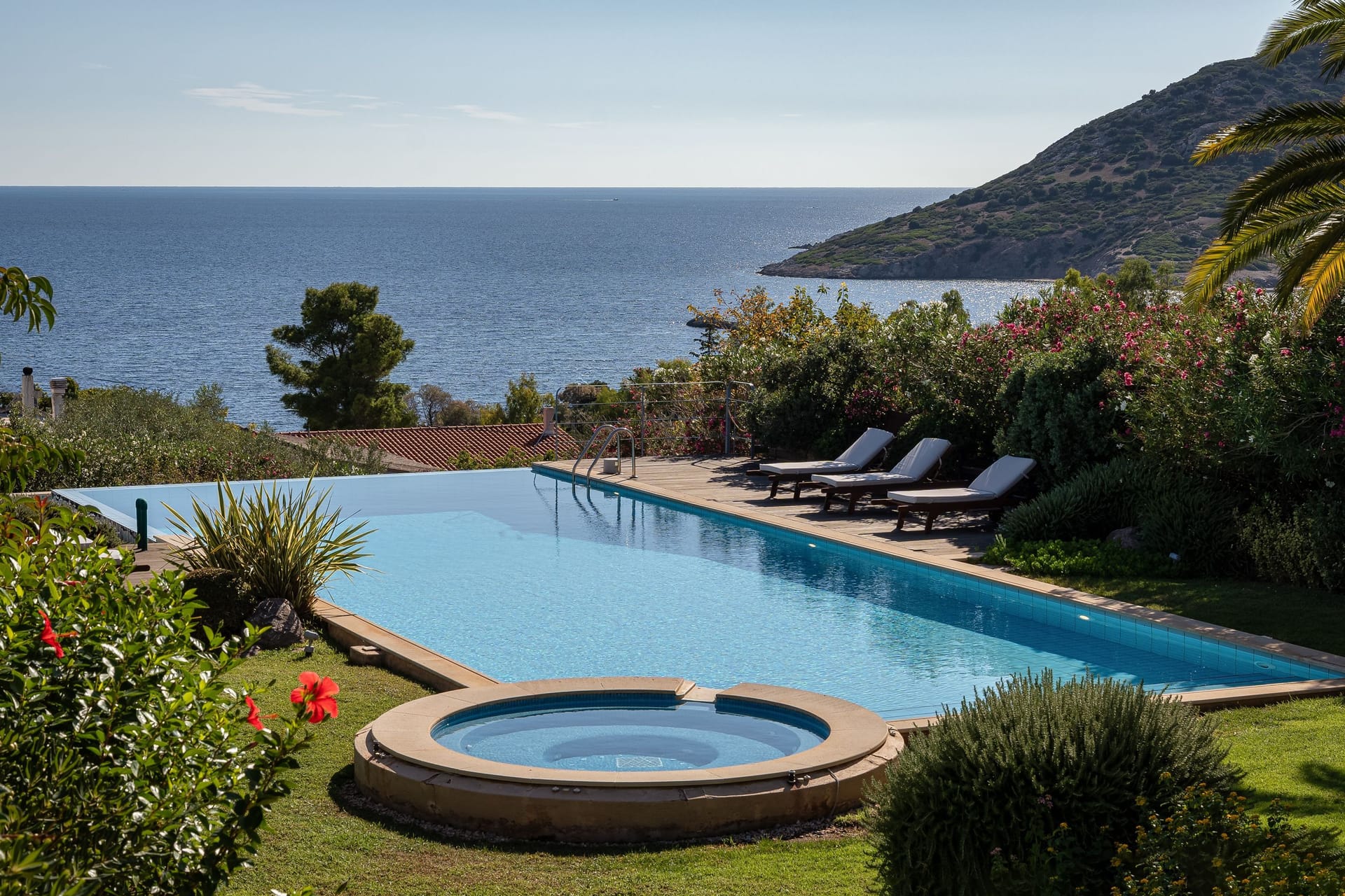 The outdoor area is a large terrace build just upon the sea. The garden is a representative illustration of the regional flora of Porto Roma that is more dry compared to the rest of the island. The highlight of the veranda is a large infinity pool where you can spend a whole day figuring out at which point the sea andthe horizon become one. In the garden, you will also find a jacuzzi and a BBQ in case you would like to grill some fresh and locally sourced food.