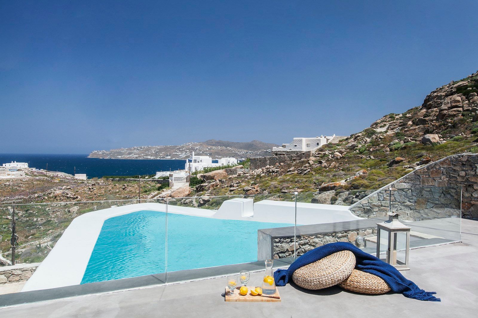 Azatis Luxury Villa covers two separate levels of a total of 360 square meters and comfortably accommodates up to 14 guests. The 7 bedrooms, 4 on the terrace level and 3 on the garden level, are elegantly designed, featuring hypoallergenic COCO-MAT mattresses for ultimate comfort. Each bedroom offers the option of a queen-size bed or two single beds, ensuring adaptability for different group needs.