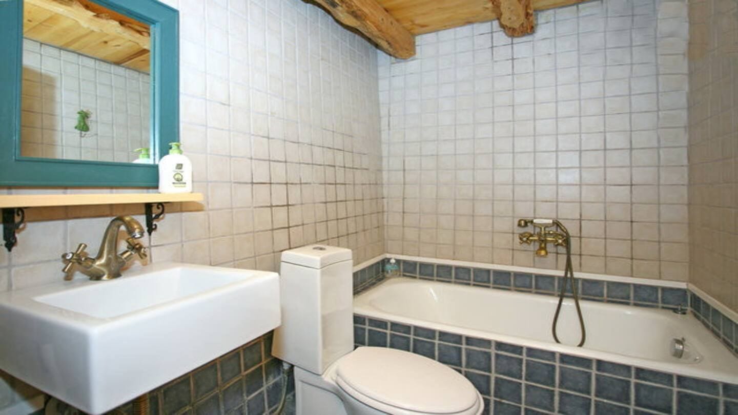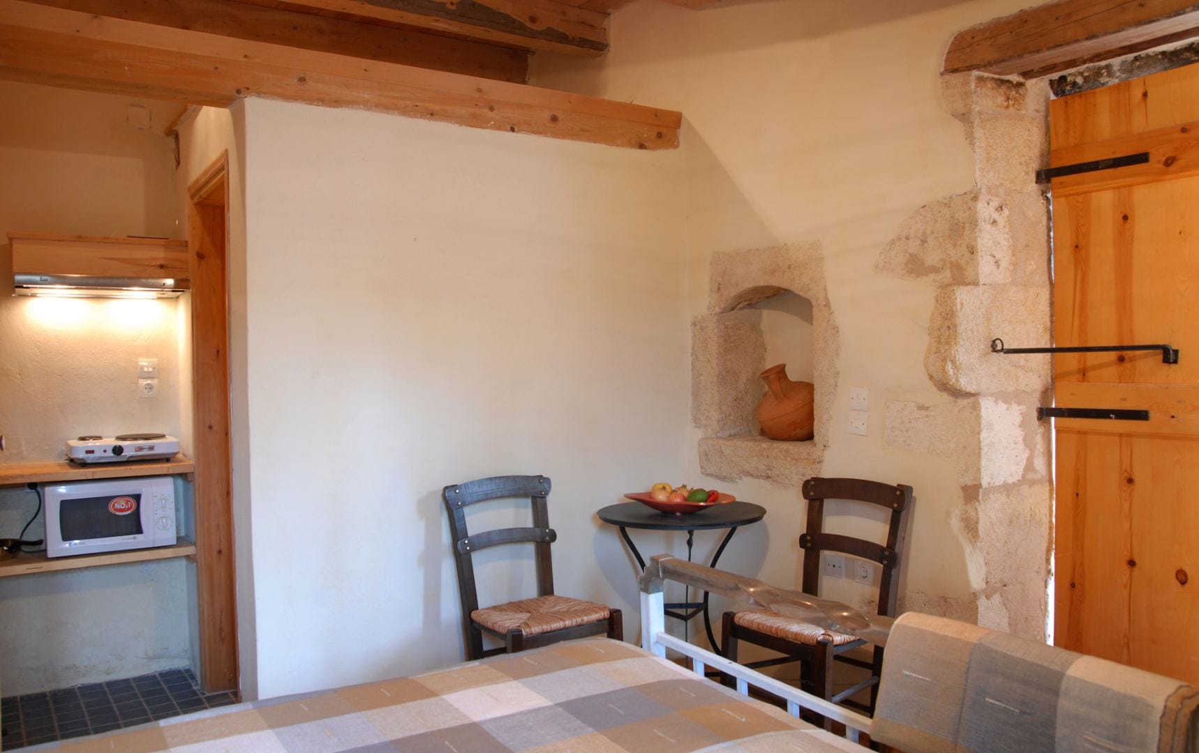 Apartment No. 2 (Patitiri, 2 guests max) offers a double bed (1.65x2.03m). It also includes a traditional loft (Ontas) with a big sofa bed. It also features a wardrobe, a kitchenette, and two full bathrooms with bathtubs, one of them uniquely nestled inside the rocks.